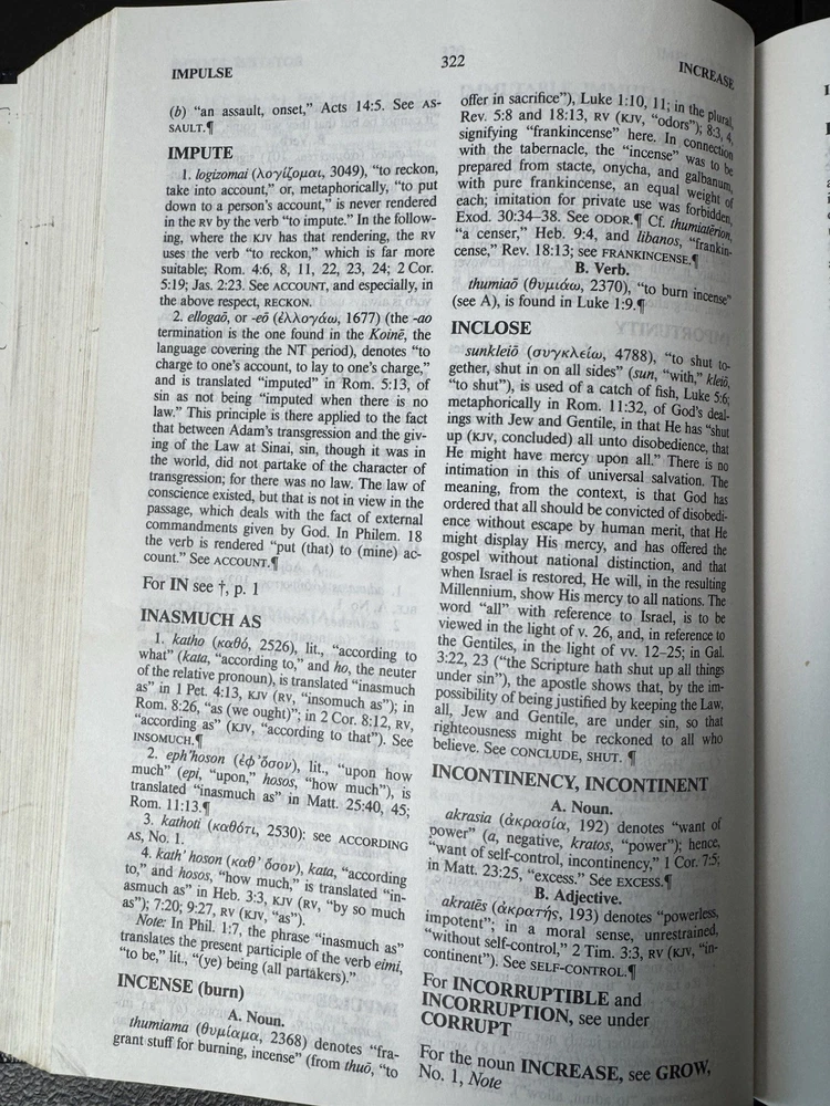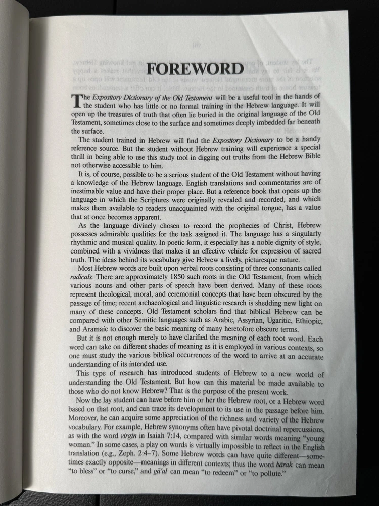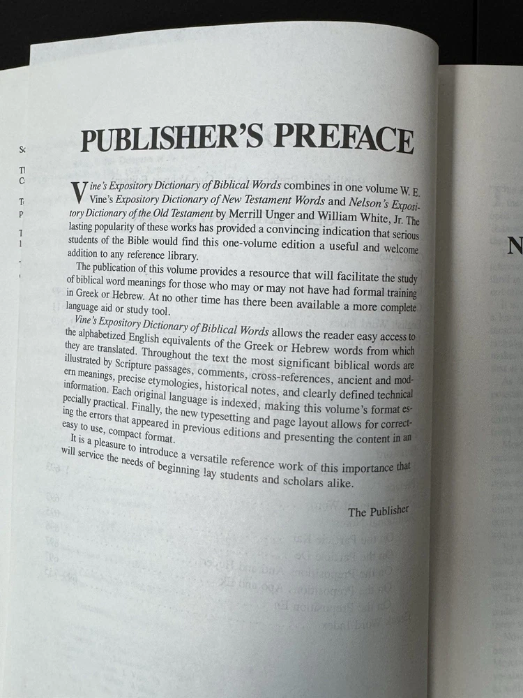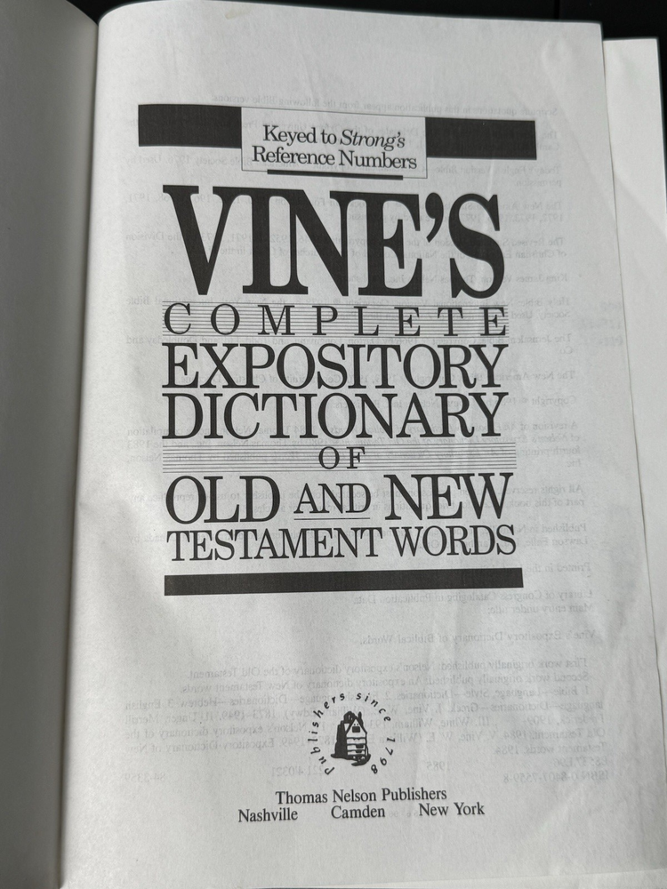 Vine's Complete Expository Dictionary of Old and New Testament Words Vine's Expository Dictionary of Biblical Words allows the reader easy access to the alphabetical English equivalents of the Greek or Hebrew words from which they are translated. Throughout the text the most significant biblical words are illustrated by scripture passages, comments, cross-references, ancient and modern meanings, precise etymologies, historical notes, and clearly defined technical information.