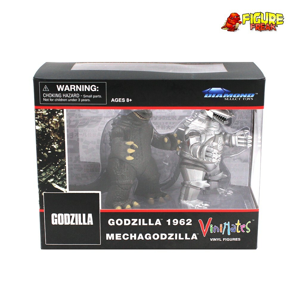 Vinimates Godzilla 2-Pack 1962 Godzilla & Mechagodzilla Vinyl Figures Item Description A Diamond Select Toys release! It's the return of Godzilla! The popular Godzilla Vinimates 4-inch vinyl figures are back in a series of two-packs, pairing past with present, and pitting enemies against each other! Godzilla 1954 meets his future counterpart, Godzilla 1999! Godzilla 1962 faces off with Mechagodzilla! Burning Godzilla 1995 teams up with Rodan! Each 4 inch figure features an articulated neck, and comes packaged in a full-color window box built for two! Designed by Barry Bradfield! Be assured that all items we carry are in new, unopened boxes, and are collector-grade. Our Vinimates come to you directly out of factory cases. We do not sell new items that have crushed blisters, dented corners, or nasty creases. All items are packed safely in styrofoam or tissue paper, and shipped in brand new cardboard boxes. Minimates Menagerie at Figure Freak Figure Freak has the worlds best Minimates selection! We buy factory cases direct from the manufacturer and our Minimates Menagerie label has been the leading Minimates storefront on earth since 2007. We try our best to offer nearly every Minimate ever produced. With thousands of characters to choose from, our selection cannot be beat! Check back regularly to find the coolest 2-inch Minimates versions of your favorite and beloved characters from over 100 different licenses such as Marvel, Disney, Aliens, Predator, Lord of the Rings, DC, Ghostbusters, Muppets, Nightmare Before Christmas, Beetlejuice, SpongeBob Squarepants, Walking Dead, Teenage Mutant Ninja Turtles, Star Trek, Battlestar Galactica, Terminator and many more!!! Find the perfect figure for your desktop or dashboard! Payments We use Paypal as our preferred method of payment. All payments must be received within 3 days of purchase. Due to our heavy volume and busy shipping department, we must cancel any unpaid orders after 3 days of non-payment and return the merchandise to inventory. FREE Domestic (US) Shipping on ALL Vinimates Vinyl figures Domestic Shipping is always FREE for all US customers !!! Your Vinimates will ship in crisp new cardboard boxes with styrofoam peanuts and/or air bags to protect them during shipping. International Shipping We use boxed USPS First Class Mail for all International orders. We ship to ANY country. Your Vinimates will be shipped in crisp new cardboard boxes with styrofoam peanuts and/or air bags to protect them during shipping. We do NOT charge handling fees... you pay the exact cost of shipping your item, but we ask that you please request a combined shipping invoice when purchasing multiple items. This will allow us to weigh your package and assign an accurate shipping total to your order.