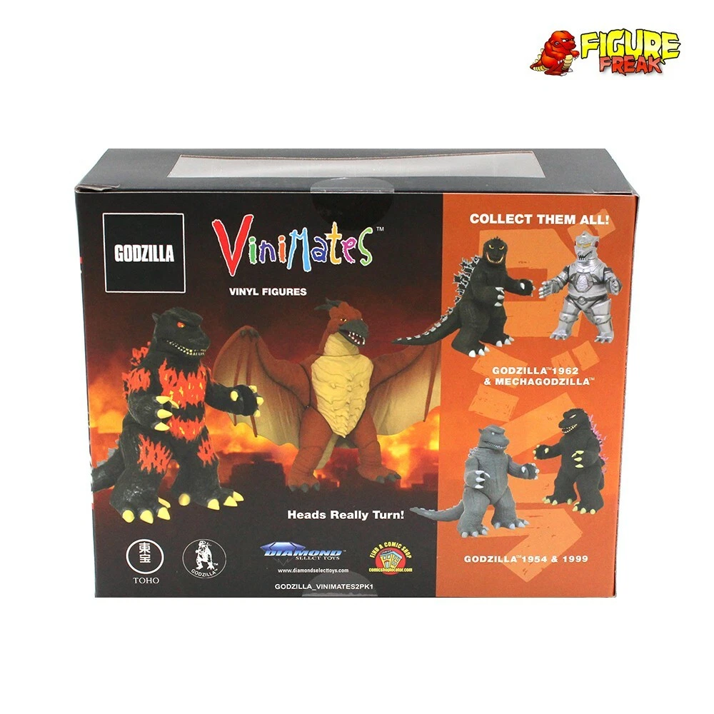 Vinimates Godzilla 2-Pack 1995 Burning Godzilla & Rodan Vinyl Figures Item Description A Diamond Select Toys release! It's the return of Godzilla! The popular Godzilla Vinimates 4-inch vinyl figures are back in a series of two-packs, pairing past with present, and pitting enemies against each other! Godzilla 1954 meets his future counterpart, Godzilla 1999! Godzilla 1962 faces off with Mechagodzilla! Burning Godzilla 1995 teams up with Rodan! Each 4 inch figure features an articulated neck, and comes packaged in a full-color window box built for two! Designed by Barry Bradfield! Be assured that all items we carry are in new, unopened boxes, and are collector-grade. Our Vinimates come to you directly out of factory cases. We do not sell new items that have crushed blisters, dented corners, or nasty creases. All items are packed safely in styrofoam or tissue paper, and shipped in brand new cardboard boxes. Minimates Menagerie at Figure Freak Figure Freak has the worlds best Minimates selection! We buy factory cases direct from the manufacturer and our Minimates Menagerie label has been the leading Minimates storefront on earth since 2007. We try our best to offer nearly every Minimate ever produced. With thousands of characters to choose from, our selection cannot be beat! Check back regularly to find the coolest 2-inch Minimates versions of your favorite and beloved characters from over 100 different licenses such as Marvel, Disney, Aliens, Predator, Lord of the Rings, DC, Ghostbusters, Muppets, Nightmare Before Christmas, Beetlejuice, SpongeBob Squarepants, Walking Dead, Teenage Mutant Ninja Turtles, Star Trek, Battlestar Galactica, Terminator and many more!!! Find the perfect figure for your desktop or dashboard! Payments We use Paypal as our preferred method of payment. All payments must be received within 3 days of purchase. Due to our heavy volume and busy shipping department, we must cancel any unpaid orders after 3 days of non-payment and return the merchandise to inventory. FREE Domestic (US) Shipping on ALL Vinimates Vinyl figures Domestic Shipping is always FREE for all US customers !!! Your Vinimates will ship in crisp new cardboard boxes with styrofoam peanuts and/or air bags to protect them during shipping. International Shipping We use boxed USPS First Class Mail for all International orders. We ship to ANY country. Your Vinimates will be shipped in crisp new cardboard boxes with styrofoam peanuts and/or air bags to protect them during shipping. We do NOT charge handling fees... you pay the exact cost of shipping your item, but we ask that you please request a combined shipping invoice when purchasing multiple items. This will allow us to weigh your package and assign an accurate shipping total to your order.