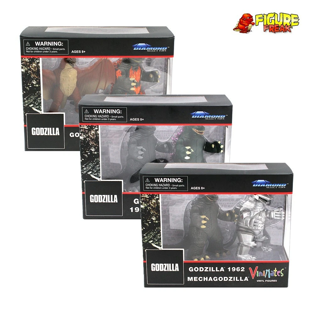 Vinimates Godzilla 2-Pack Collection 1954 Godzilla & 1999 Godzilla Vinyl Figures 1995 Burning Godzilla & Rodan Vinyl Figures 1962 Godzilla & Mechagodzilla Vinyl Figures Item Description A Diamond Select Toys release! It's the return of Godzilla! The popular Godzilla Vinimates 4-inch vinyl figures are back in a series of two-packs, pairing past with present, and pitting enemies against each other! Godzilla 1954 meets his future counterpart, Godzilla 1999! Godzilla 1962 faces off with Mechagodzilla! Burning Godzilla 1995 teams up with Rodan! Each 4 inch figure features an articulated neck, and comes packaged in a full-color window box built for two! Designed by Barry Bradfield! Be assured that all items we carry are in new, unopened boxes, and are collector-grade. Our Vinimates come to you directly out of factory cases. We do not sell new items that have crushed blisters, dented corners, or nasty creases. All items are packed safely in styrofoam or tissue paper, and shipped in brand new cardboard boxes. Minimates Menagerie at Figure Freak Figure Freak has the worlds best Minimates selection! We buy factory cases direct from the manufacturer and our Minimates Menagerie label has been the leading Minimates storefront on earth since 2007. We try our best to offer nearly every Minimate ever produced. With thousands of characters to choose from, our selection cannot be beat! Check back regularly to find the coolest 2-inch Minimates versions of your favorite and beloved characters from over 100 different licenses such as Marvel, Disney, Aliens, Predator, Lord of the Rings, DC, Ghostbusters, Muppets, Nightmare Before Christmas, Beetlejuice, SpongeBob Squarepants, Walking Dead, Teenage Mutant Ninja Turtles, Star Trek, Battlestar Galactica, Terminator and many more!!! Find the perfect figure for your desktop or dashboard! Payments We use Paypal as our preferred method of payment. All payments must be received within 3 days of purchase. Due to our heavy volume and busy shipping department, we must cancel any unpaid orders after 3 days of non-payment and return the merchandise to inventory. FREE Domestic (US) Shipping on ALL Vinimates Vinyl figures Domestic Shipping is always FREE for all US customers !!! Your Vinimates will ship in crisp new cardboard boxes with styrofoam peanuts and/or air bags to protect them during shipping. International Shipping We use boxed USPS First Class Mail for all International orders. We ship to ANY country. Your Vinimates will be shipped in crisp new cardboard boxes with styrofoam peanuts and/or air bags to protect them during shipping. We do NOT charge handling fees... you pay the exact cost of shipping your item, but we ask that you please request a combined shipping invoice when purchasing multiple items. This will allow us to weigh your package and assign an accurate shipping total to your order.