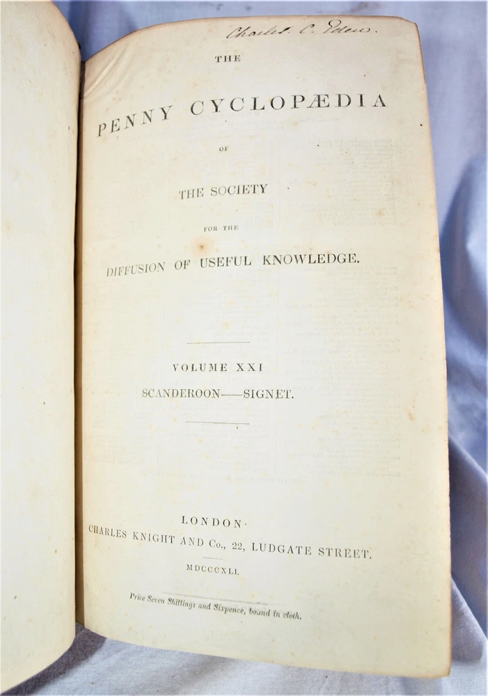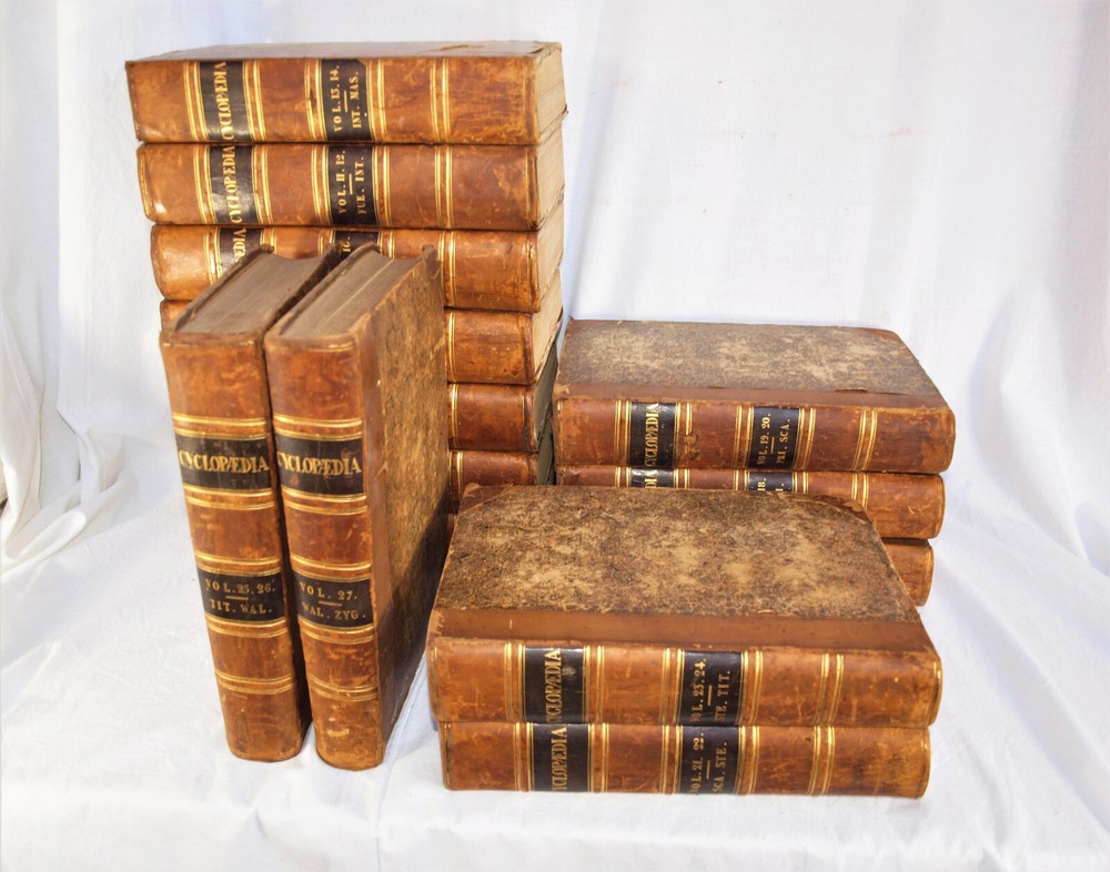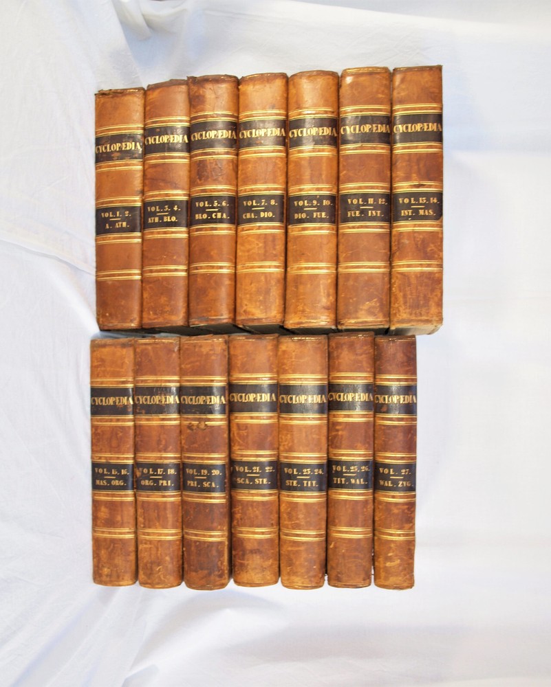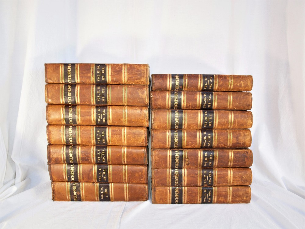 Vintage 14 Volume “The Penny Encyclopedia of The Society for the Diffusion of Useful Knowledge”. Published in 1841 by Charles Knight and Co., London. Set complete of 27 volumes, some books doubled. Good for condition for age, bindings strong, edges worn. Please see photes. BM#LA 2029
