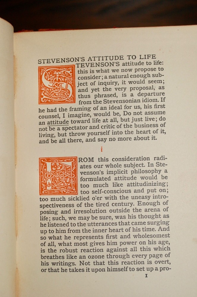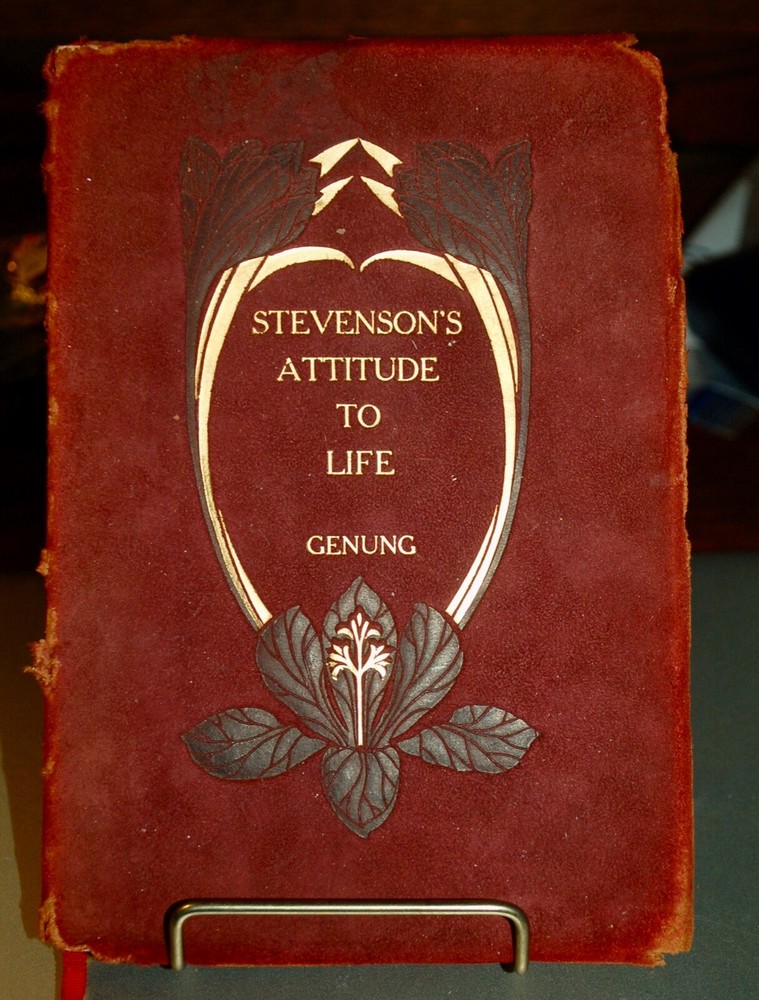 Stevenson's Attitude to Life by John Franklin Genung. Leather cover with gold print. Cover a little bit tattered by pages clean and crisp. Binding tight.