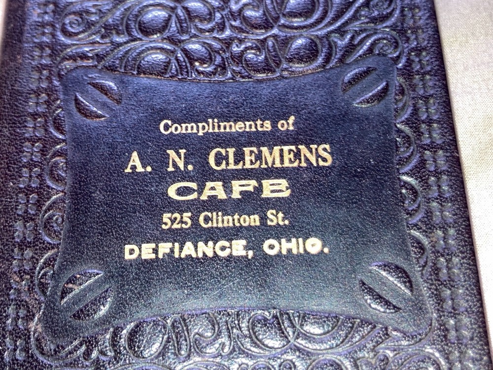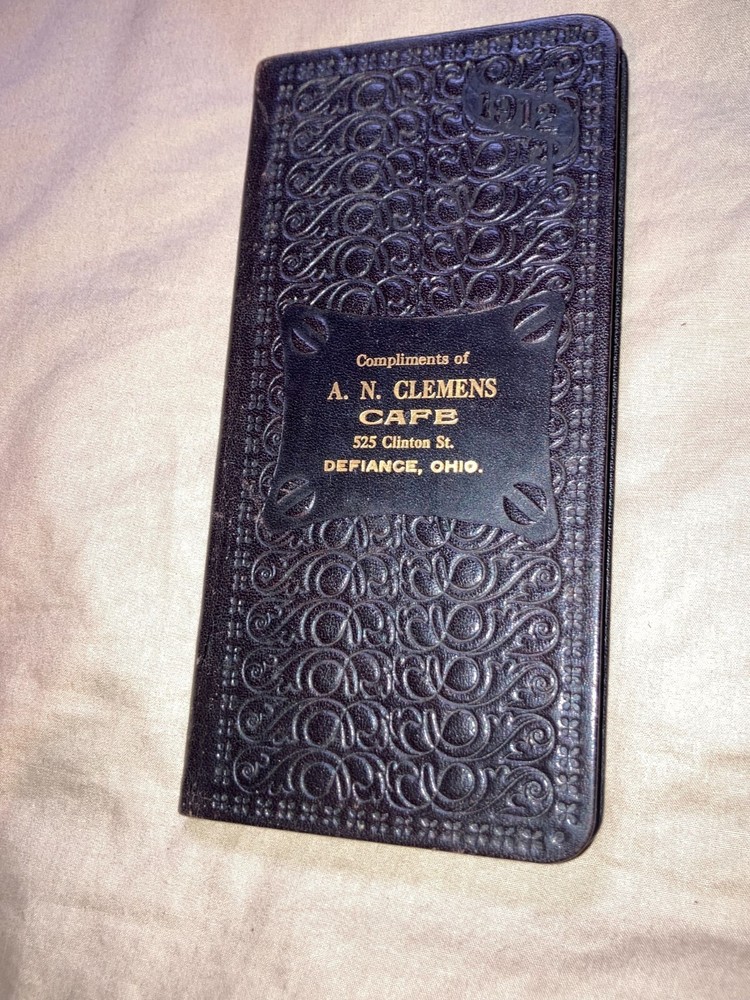 This Listing is for a: Vintage 1912 Leather Bound Date Book A. N. Clemens Cafe Defiance, Ohio There is No Writing on the inside. Clean as can be. Interesting Fact, measure, weight, population tables. Very cool piece. It was found in a Great Uncle's War chest 40 years ago. FREE SHIPPING !!!!!!
