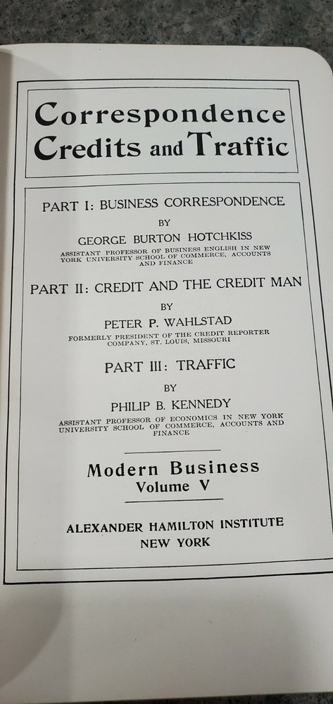 Welcome! Modern Business - Volume V Correspondence Credits and Traffic Edited by Joseph French Johnson in collaboration with several authors. Alexander Hamilton Institute New York, N.Y. In our opinion this book is in good condition. There are bumps on covers and corners. No musty or old book smell. The pages are in good condition. All the pages in the book appear to be there. Covers and pages are secure to the binding. Leather cover in good condition. This book is sold as is, as shown in the pictures. This book was from several private homes. It is unknown if they had pets or smoked. Please read the description and refer to the pictures for an accurate honest review of this item. Your book will be shipped by U.S.P.S. Media Mail within the Continental USA for FREE!! Please contact us with any questions that you may have. Thank you for visiting! Check back often for new listings!