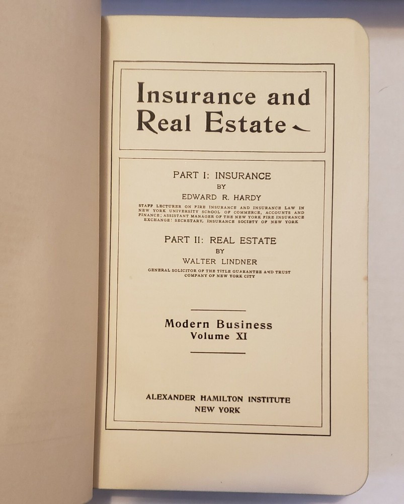 Vintage 1916 Modern Business by Alexander Hamilton Institute Insurance and Real Estate PART 1: INSURANCE By EDWARD R. Hardy PART II: REAL ESTATE BY: Walter Lindner Modern Business Volume XI Alexander Hamilton Institute New York In decent shape for a book over 100 years old. See pictures for condition. Shipping: Your choice of media mail or Priority. I can combine shipping if you send a message before purchasing. Thanks for looking!