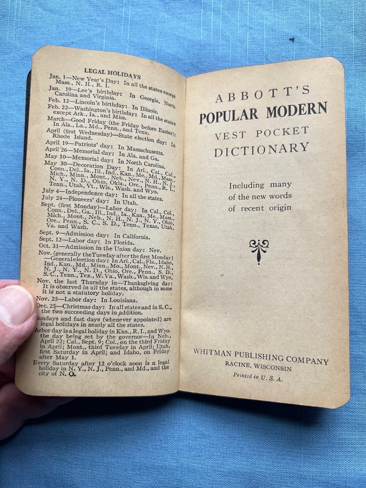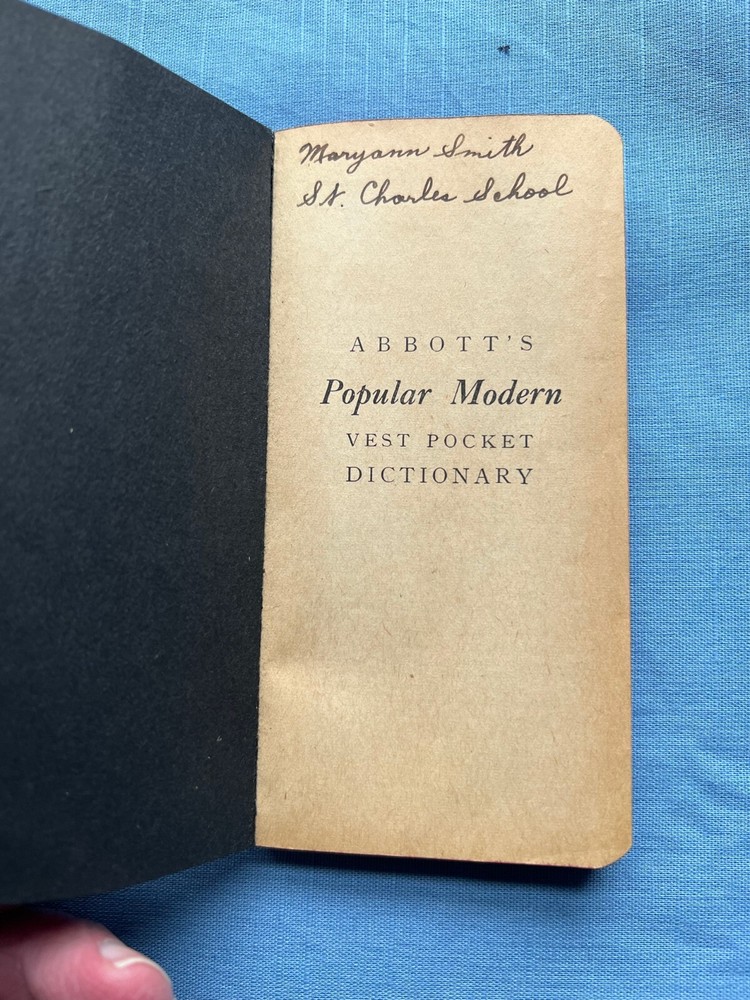 Vest pocket dictionary from about 1943 in very good condition. All pages intact, binding in good shape with no cracks. No stains or tears. Printed by Whitman Publishing Company, Racine Wisconson. Stored in non-smoking home. Signed by student Marianne Smith, St. Charles School, Bridgeport CT.