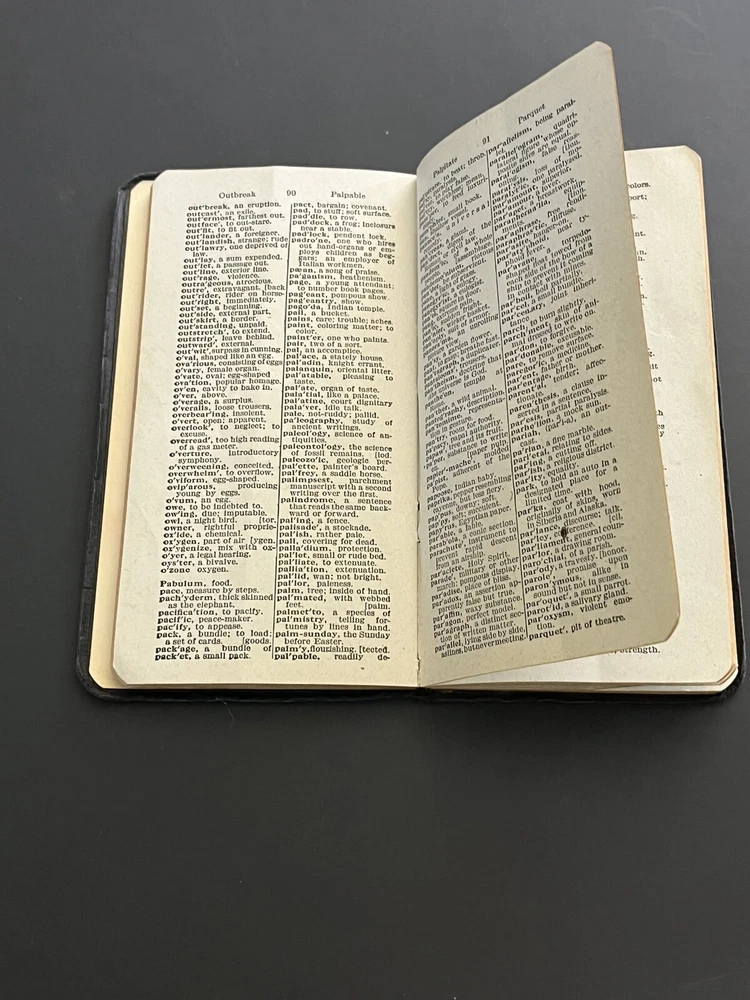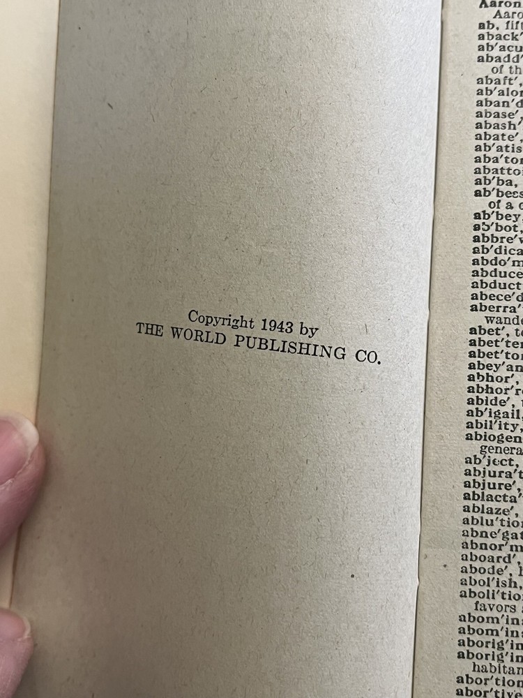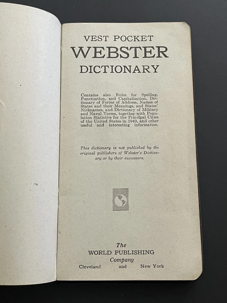 This vintage 1943 Little Giant Webster Dictionary is a pocket-sized reference book that offers self-pronouncing words and definitions. The leather-bound book was printed by The World Publishing Company in New York and is an original copy from that year. It includes words and definitions on various topics, including dictionaries and thesauri. The dictionary is a great addition to any collection of books and magazines, especially for those interested in antiquarian and collectible items. It was printed in English and has special attributes that make it a unique and valuable reference tool. The dictionary is a must-have for anyone who loves words and language, and it is sure to be a prized possession for years to come.