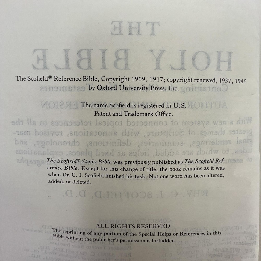 Vintage 1945 Holy Bible Scofield Reference Edition Oxford Press Leather Binding Very Good Condition, No Writing or Marks, Name on outside of book Sold As Pictured