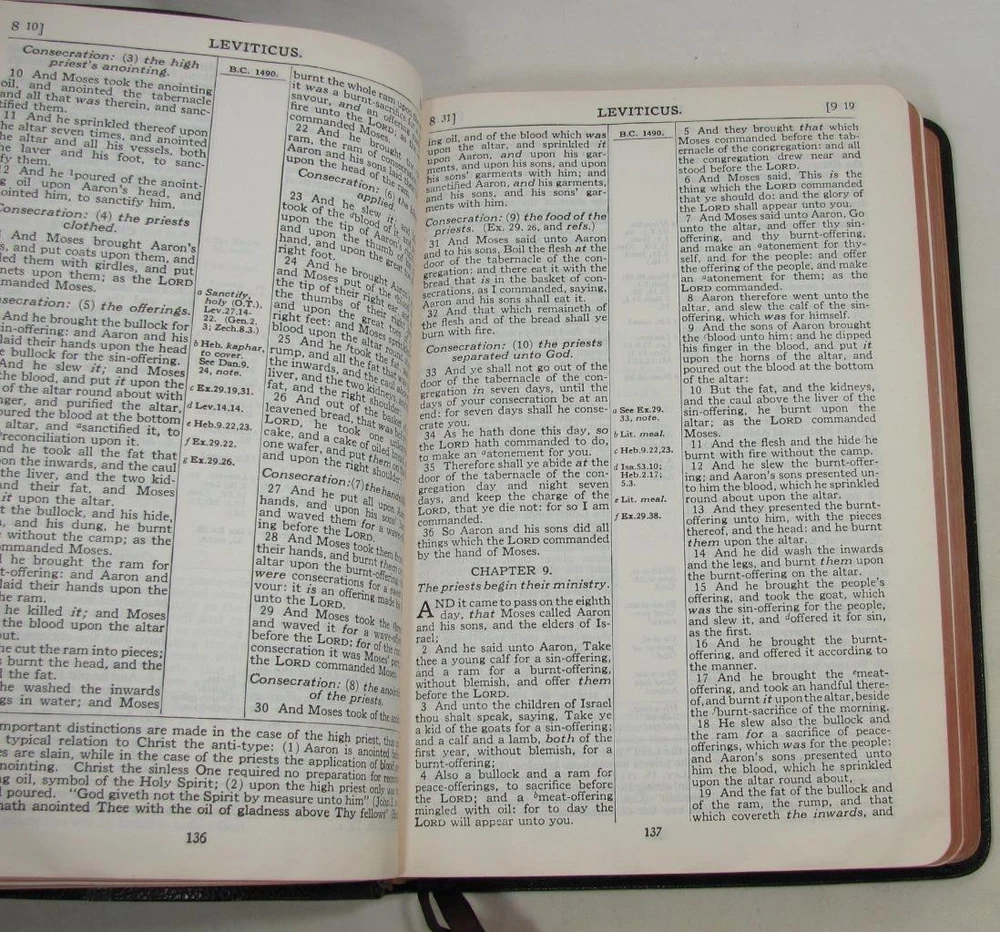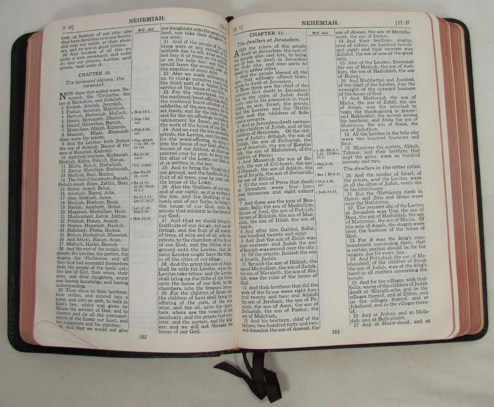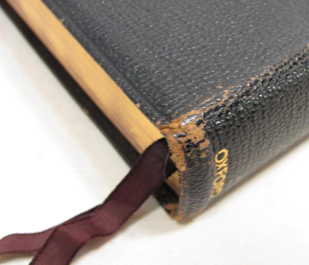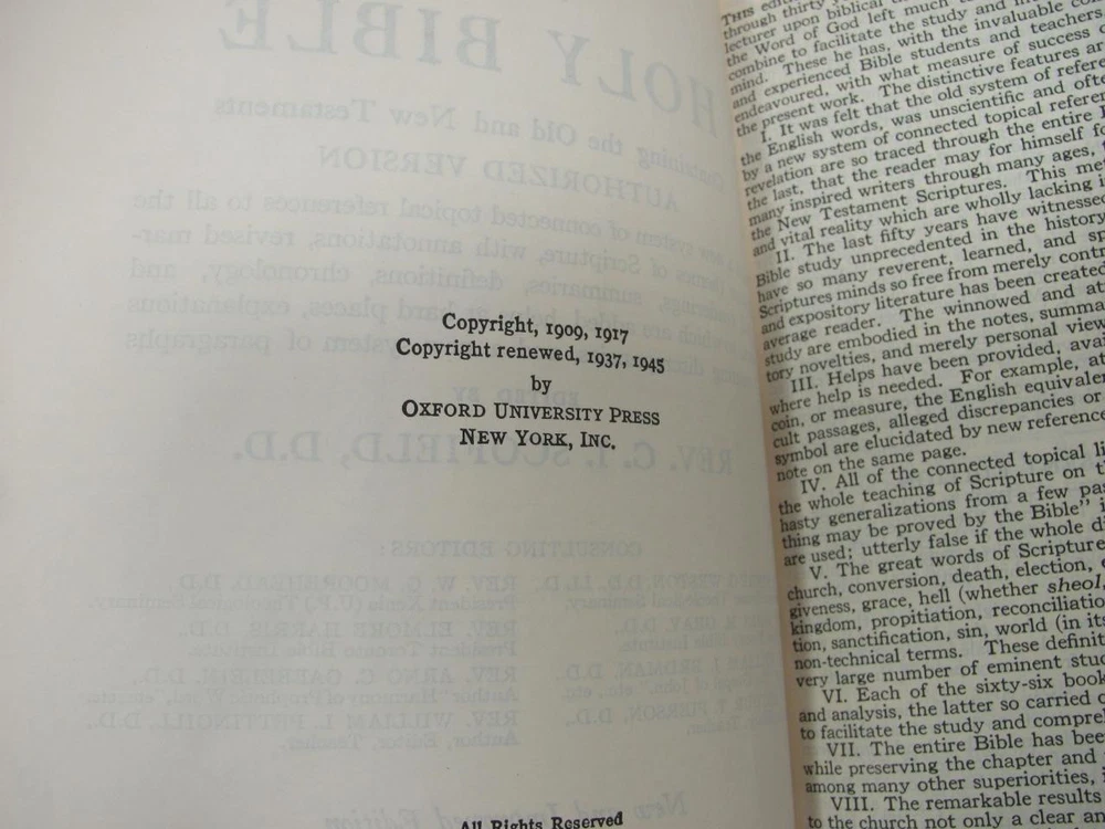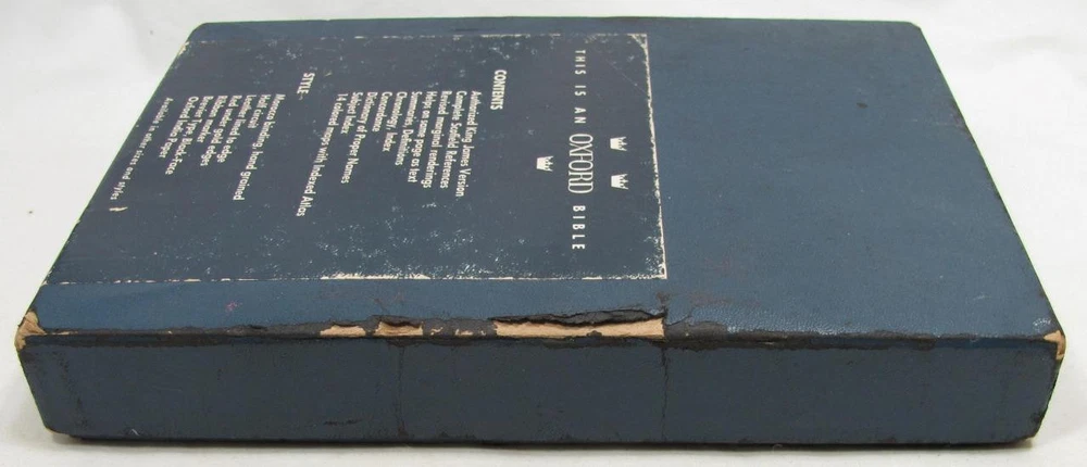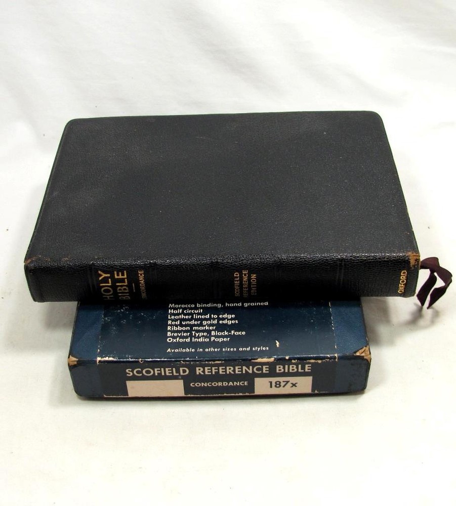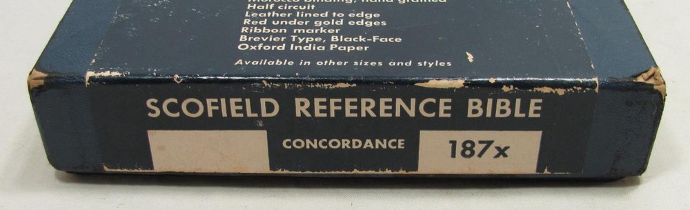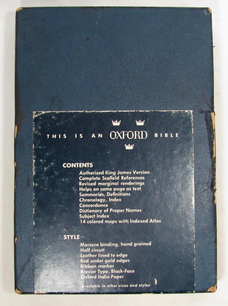 Here is an older Bible. This was published by Oxford University Press. It is the Scofield Reference Edition. This is copyright 1945. It is the Authorized King James Version. It has summaries, definitions, chronology, Concordance, maps and more. It has Morocco leather binding, red under gold page edges, and sewn in bookmark. The Bible measures 8 1/2" by 5 3/4" by 1 1/4". This includes the original box. Get this well made Bible! Here is an older Bible. This was published by Oxford University Press. It is the Scofield Reference Edition. This is copyright 1945. It is the Authorized King James Version. It has summaries, definitions, chronology, Concordance, maps and more. It has Morocco leather binding, red under gold page edges, and sewn in bookmark. The Bible measures 8 1/2" by 5 3/4" by 1 1/4". This includes the original box. Get this well made Bible! This is pre-owned. There is an old owner's inscription on the first page. The back page has a family history written on it. The covers of the Bible have wear to the edges and corners. The page edges have scratches and wear to the gold. Some pages have small tears, bends and creases. The box has wear and tears, mostly to the edges and corners. There is yellowing to the inside of the box. Please view pictures to see condition. This will ship Media Mail. I combine shipping when possible. Please ask any questions. Please view my other listings! Pictures sell! Auctiva offers Free Image Hosting and Editing. The complete eBay Selling Solution.