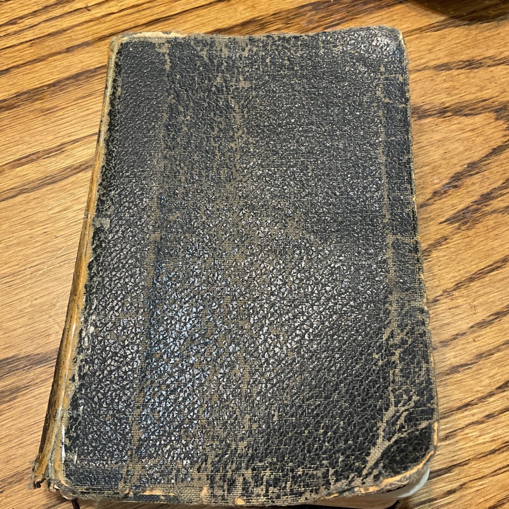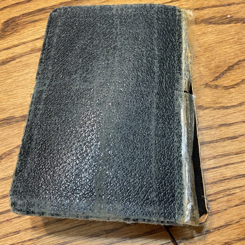 The only writing I have seen inside is a name written in the front cover. The faux leather needs replacing. Travel pocket size 3.5” wide and 5.25” long. Depth approximately 1”.