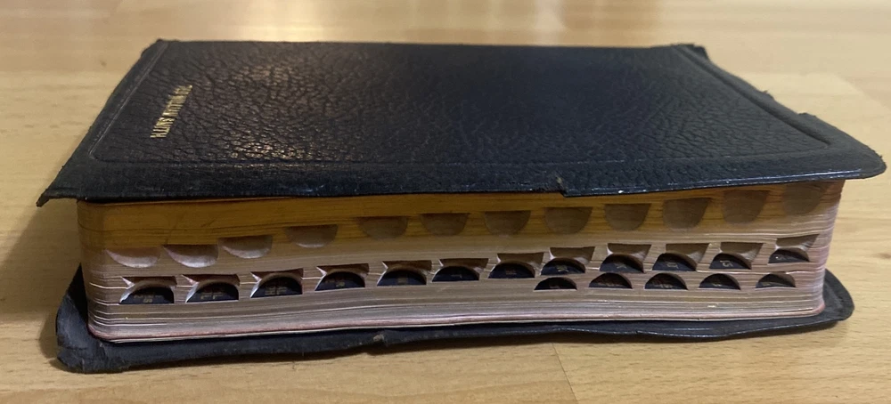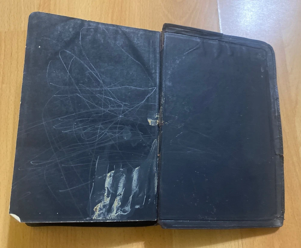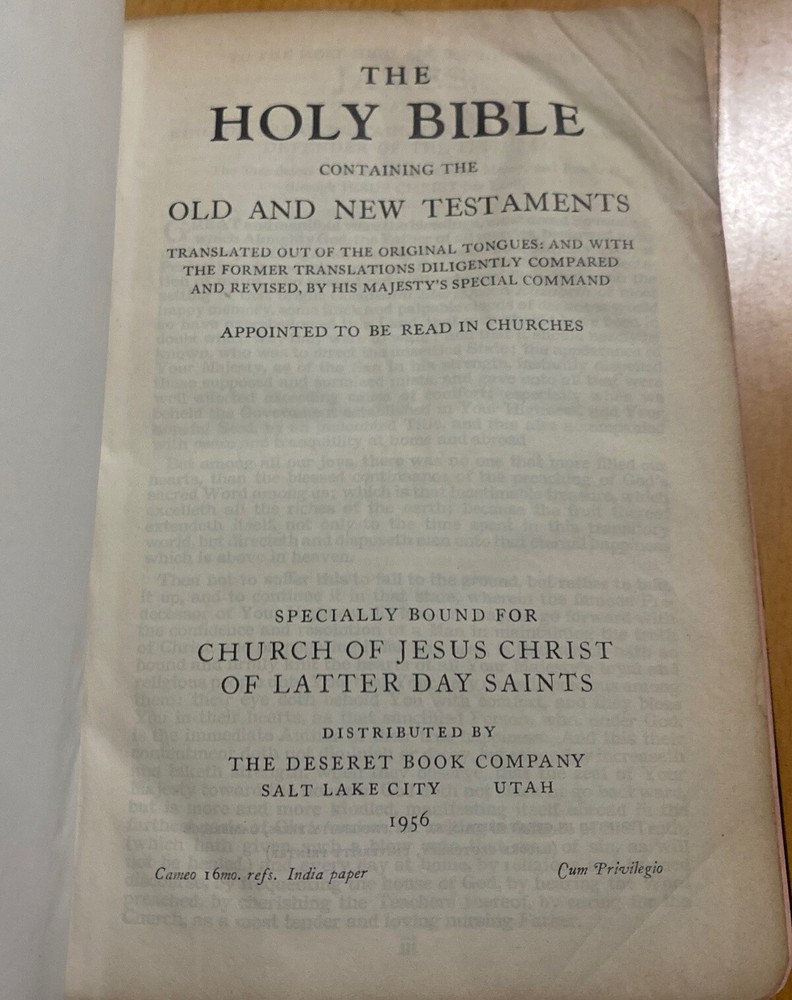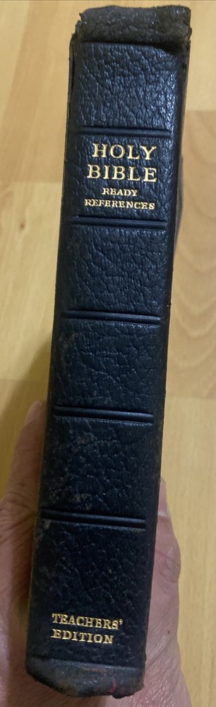 Vintage 1956 LDS Holy Bible Ready References Teachers Edition Genuine Leather. Good condition. Cover has small tears along upper edge, and on both sides of the spine, damaged back corner. Original owner name embossed. Pages are wrinkled by some past moisture. Still very readable. No highlighting.