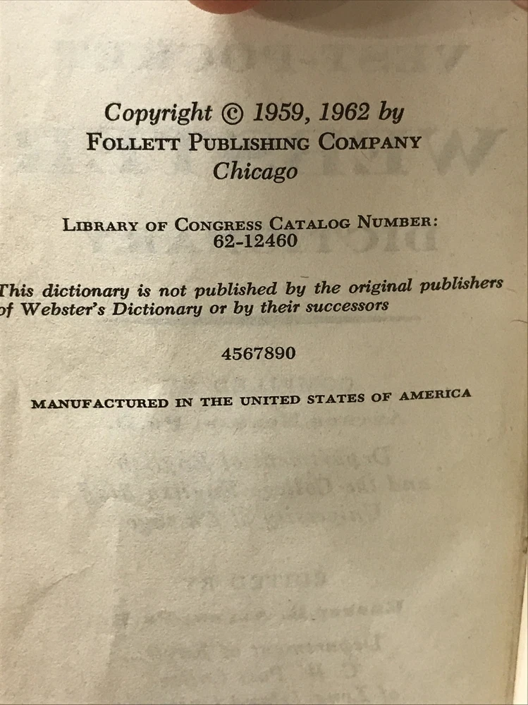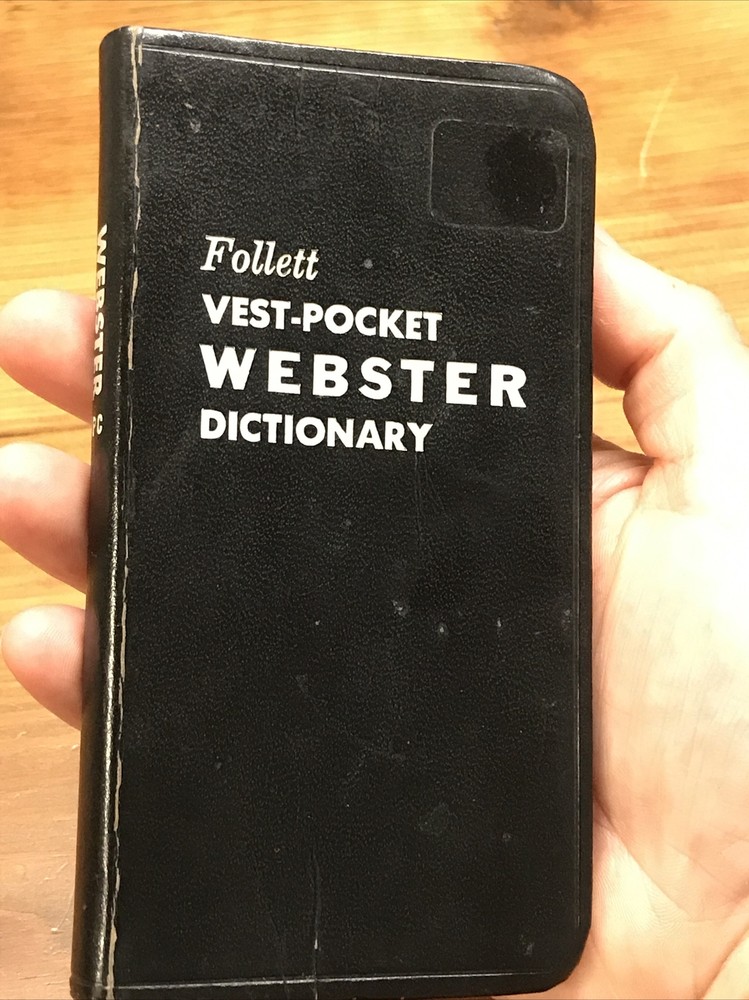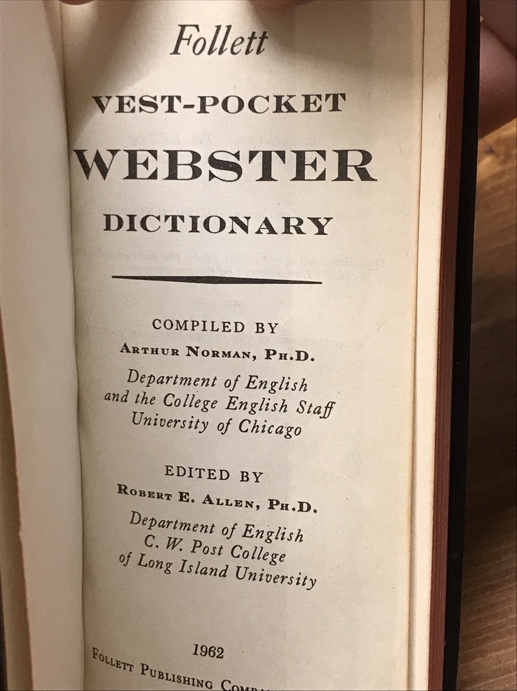 Vintage: 1962 Follett Vest Pocket Webster Dictionary Self-pronouncing VEST-POCKET. Great shape for the age. Some exterior signs wear, but interior is clean, and appears to have never been used. Spine shows a split line that has been glued. See photos for more detail. We have an OUTSTANDING Seller reputation, because we ship FAST, and make sure items are packaged correctly. Please check out our reviews. We're also quick communicators. If you have any questions, we're here and happy to help. We do our best to describe items accurately as well as be competitive with our pricing. No Returns. Thanks and have a great day!