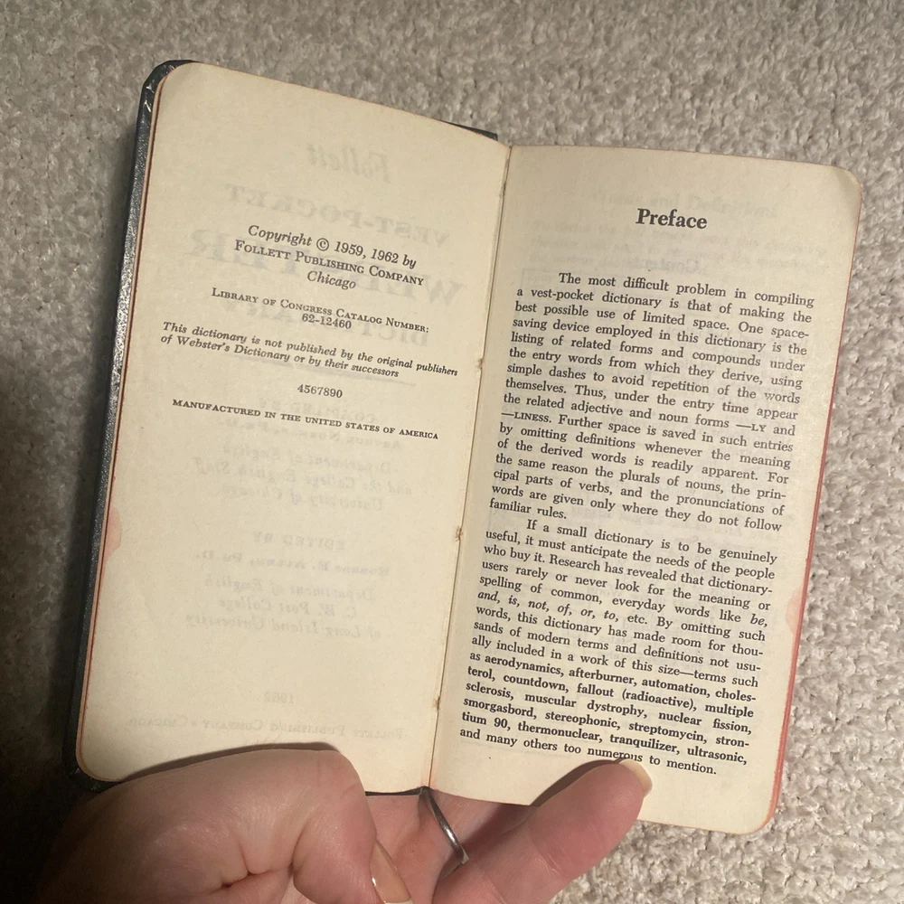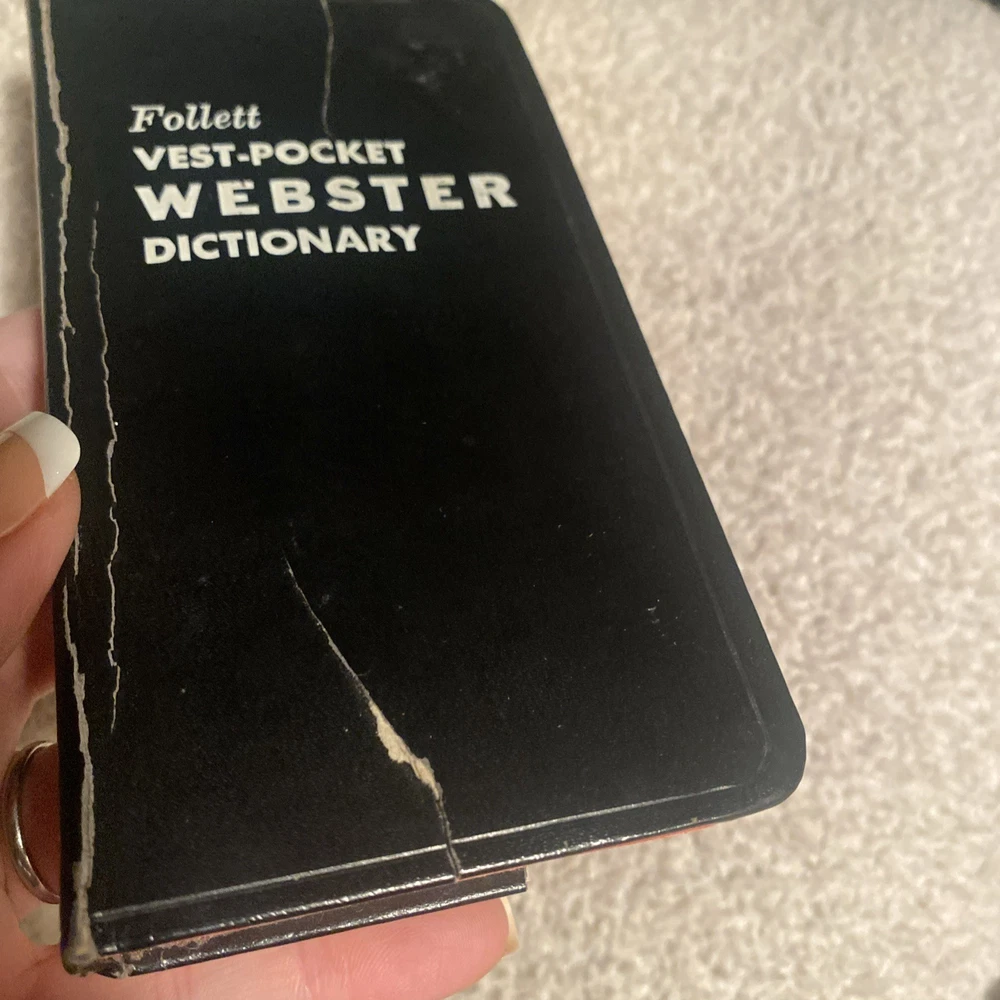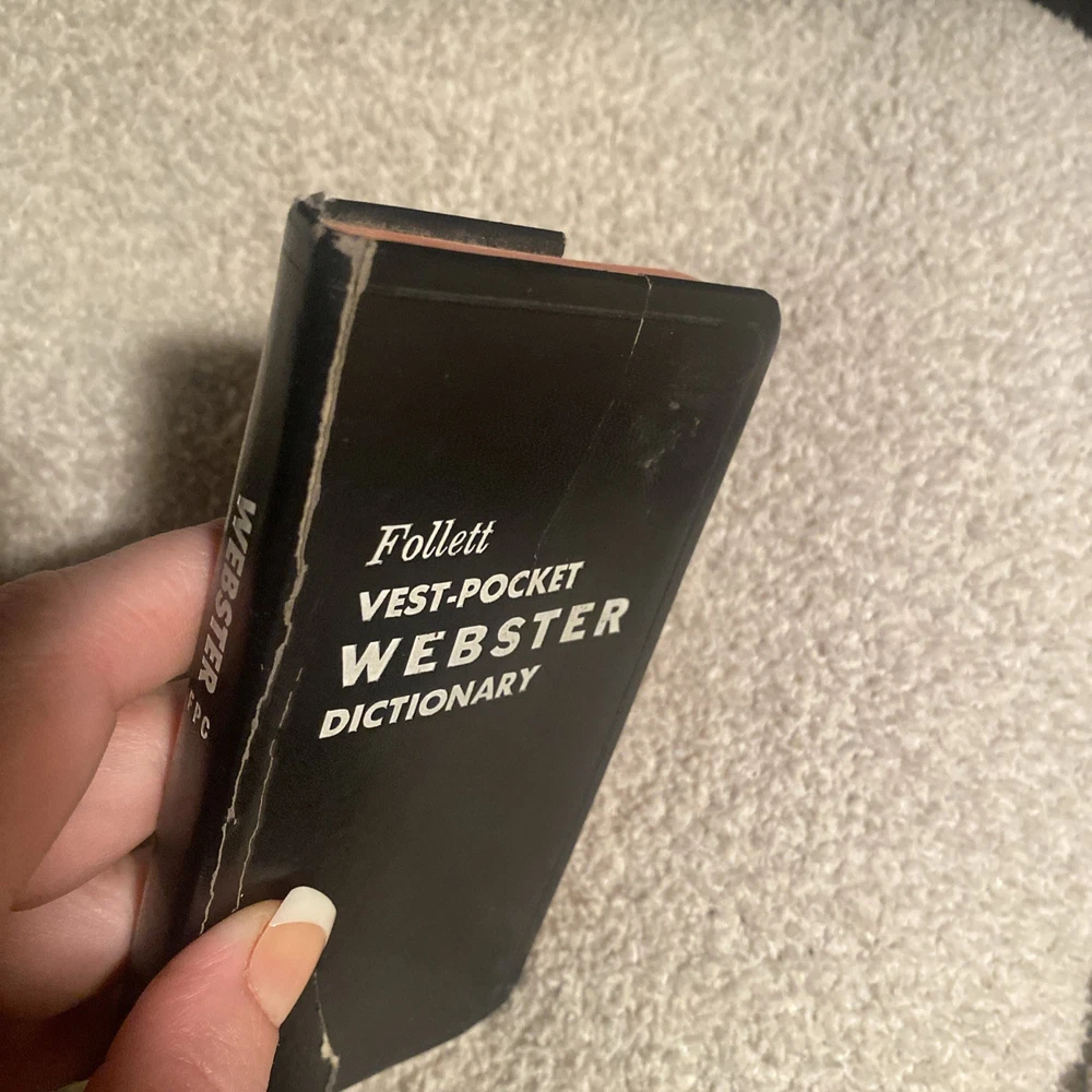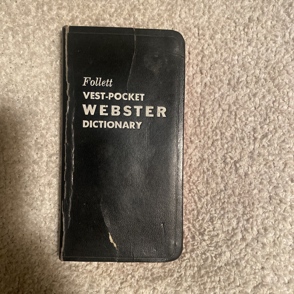 See pictures. Back cover damaged. Explore the world of literature with this vintage 1962 Follett Vest Pocket Webster Dictionary. This collector's edition dictionary is a great addition to any reference collection, with its leather soft cover and original binding. The dictionary was published by Follett Publishing Company in Chicago, and features the self-pronouncing VEST-POCKET design. The Vest Pocket Webster Dictionary includes English language words and phrases, as well as a thesaurus for those hard-to-find synonyms. With illustrations by an unknown artist, this dictionary is perfect for North American readers looking for a classic reference book. Don't miss out on the opportunity to own this unique piece of history!