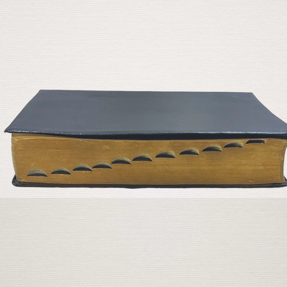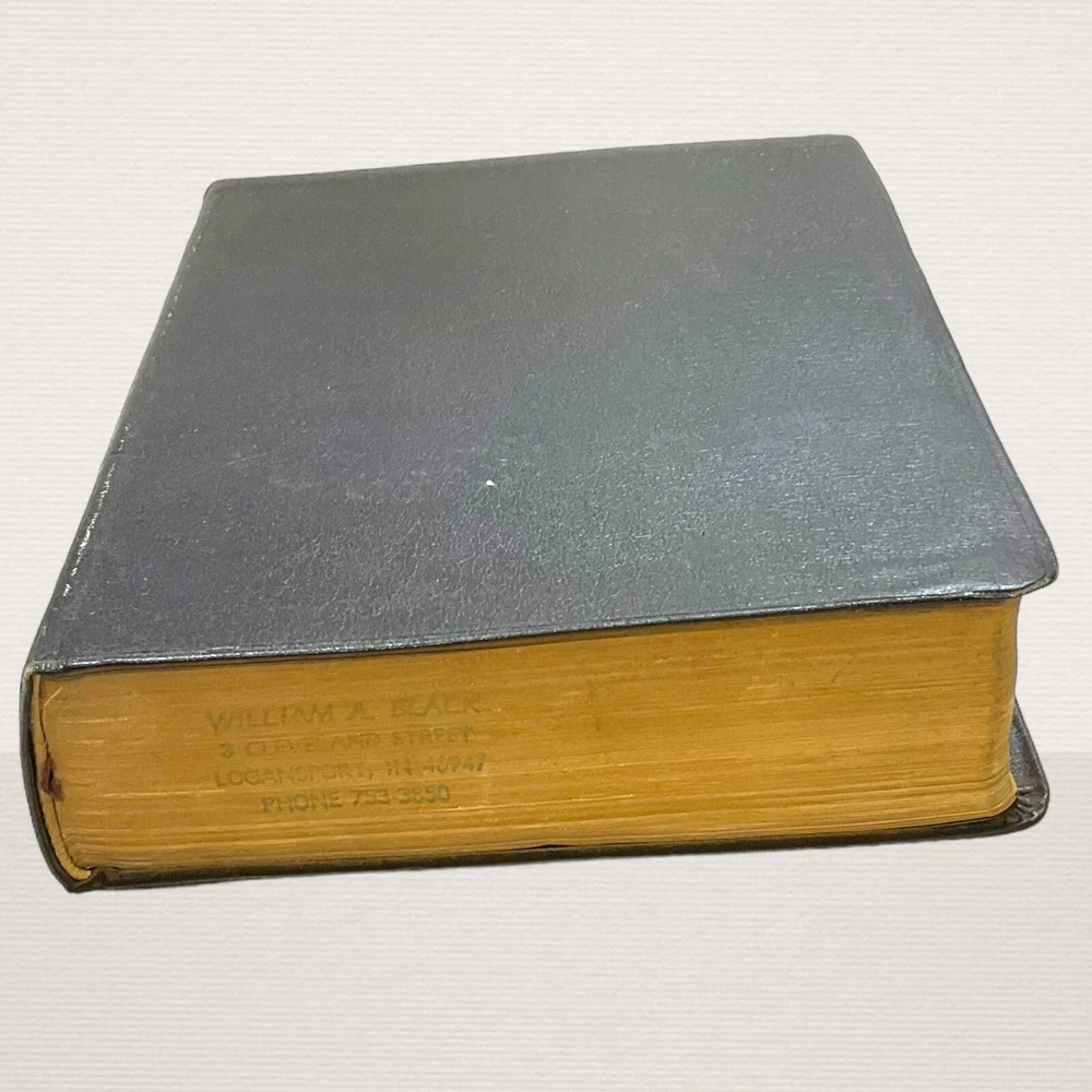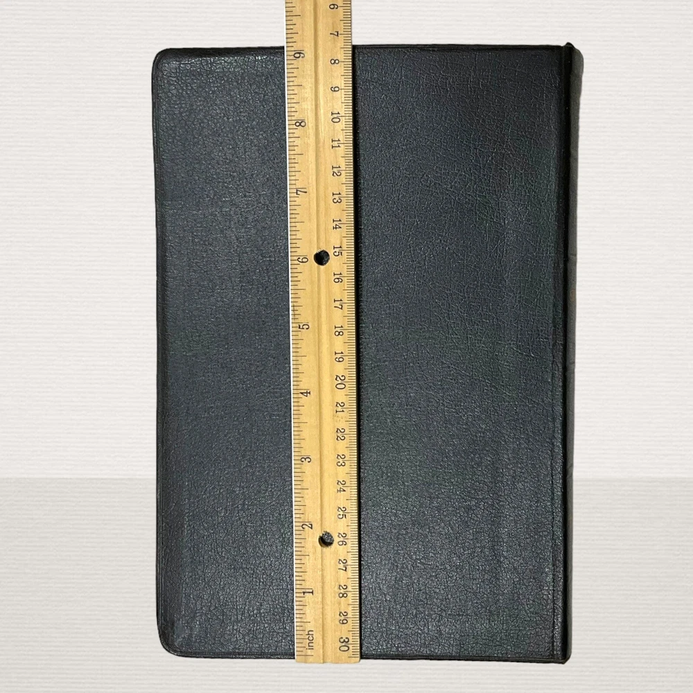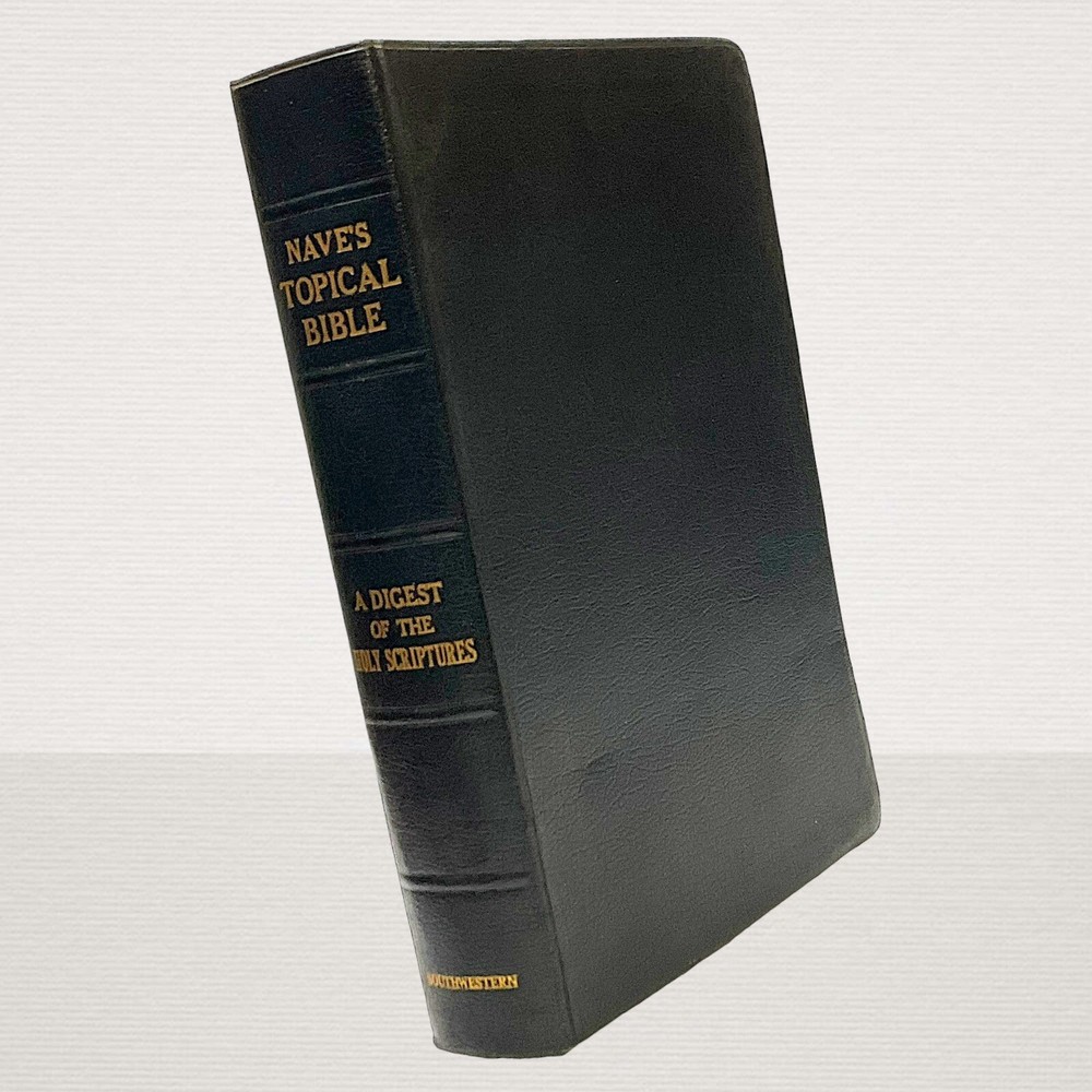 Vintage 1962 Nave's Topical Bible Thumb-Indexed Southwestern Black Soft Cover Appears to have never been read. The previous owner "stamped" his name in 3 different areas. The ribbon marker is missing. Pages are starting to yellow. Paper clip shadows on inside front cover and page following. Pages are crisp and clean. Binding is nice and tight. Still in nice condition. Please view all photos. A Digest of The Holy Scriptures More than twenty thousand topics and subtopics, and one hundred thousand references to the scriptures. by Orville J. Nave, A.M., D.D., LL.D., Chaplain in the Army of the United States. 1615 Pages Gilded Edges Thumb Indexed Measures approximately 9" x 6" Ships Same or Next Business Day