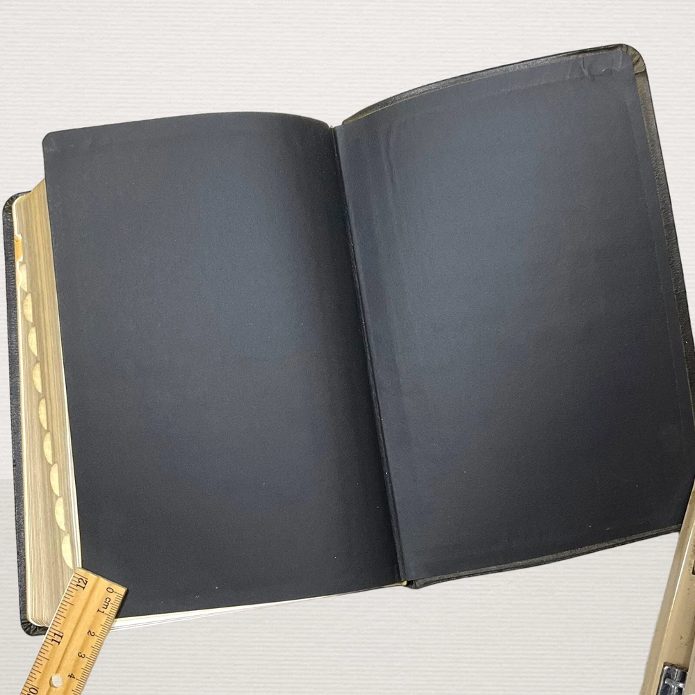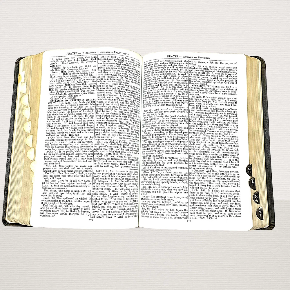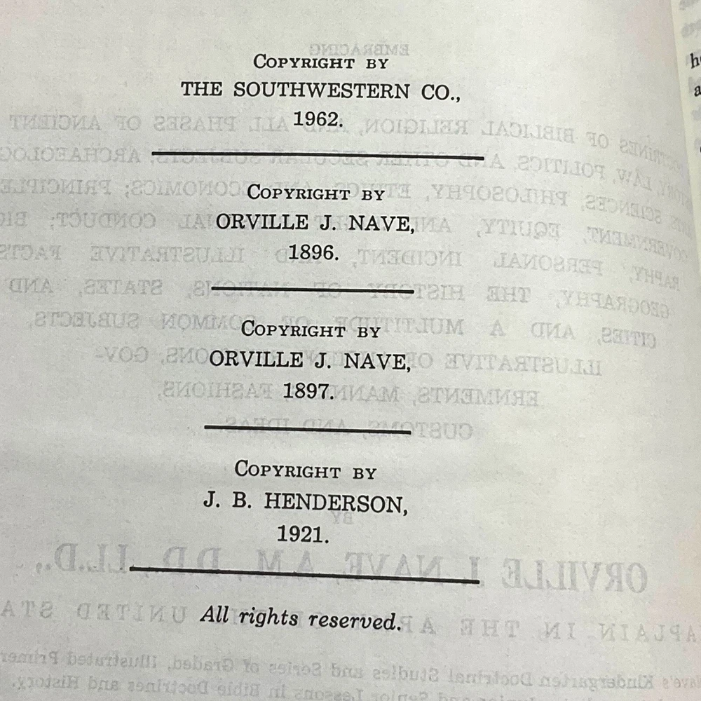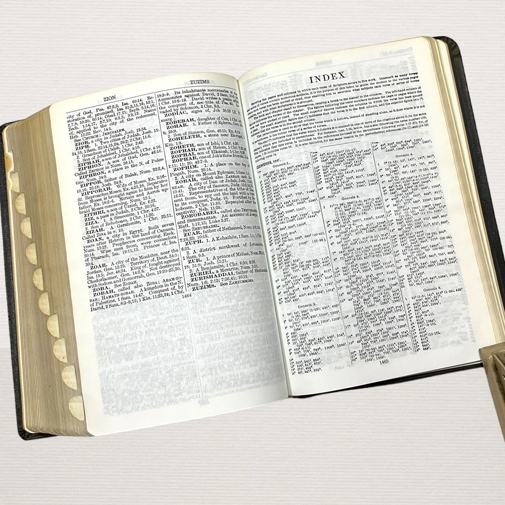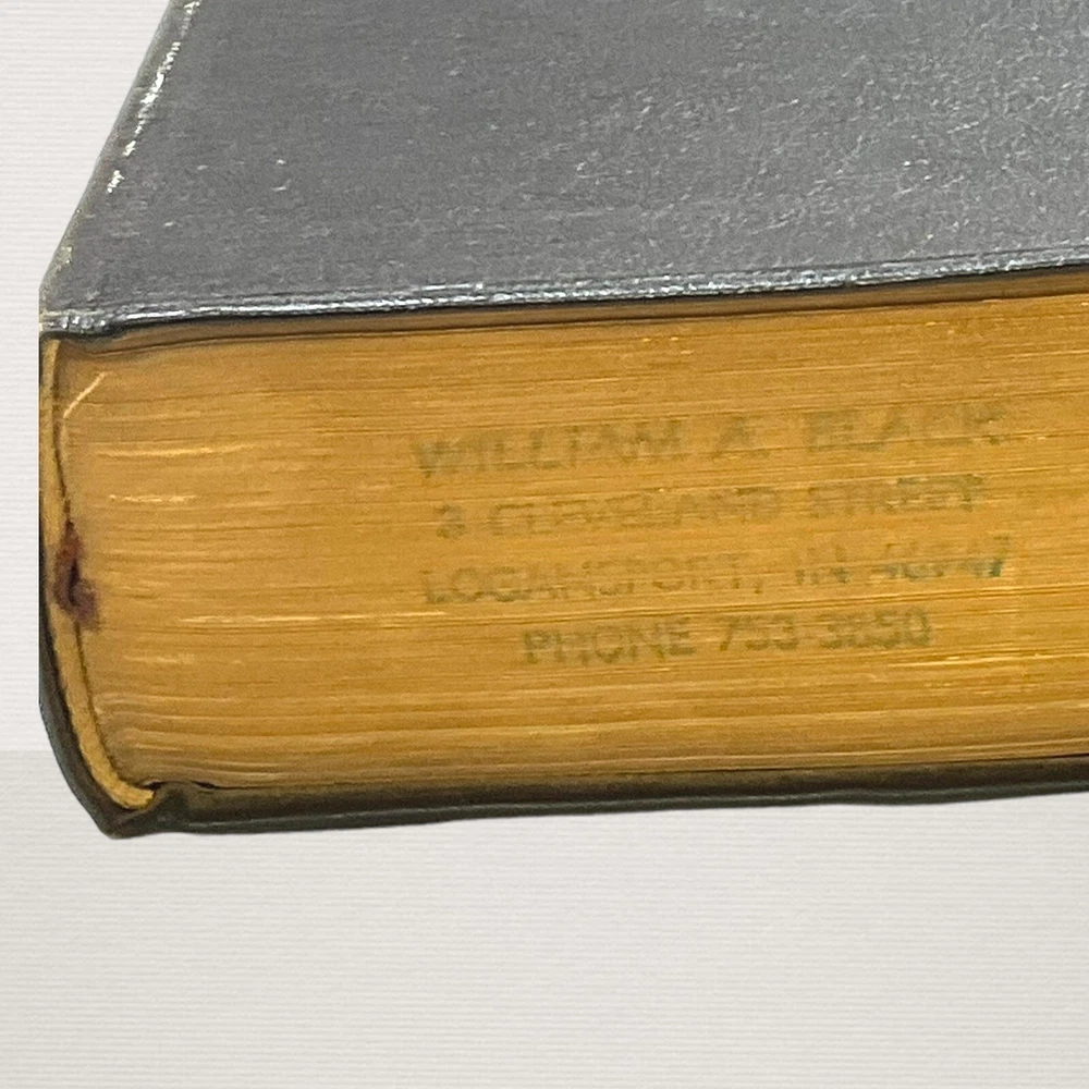 Vintage 1962 Nave's Topical Bible Thumb-Indexed Southwestern Black Soft Cover Appears to have never been read. The previous owner "stamped" his name in 3 different areas. The ribbon marker is missing. Pages are starting to yellow. Paper clip shadows on inside front cover and page following. Pages are crisp and clean. Binding is nice and tight. Still in nice condition. Please view all photos. A Digest of The Holy Scriptures More than twenty thousand topics and subtopics, and one hundred thousand references to the scriptures. by Orville J. Nave, A.M., D.D., LL.D., Chaplain in the Army of the United States. 1615 Pages Gilded Edges Thumb Indexed Measures approximately 9" x 6" Ships Same or Next Business Day
