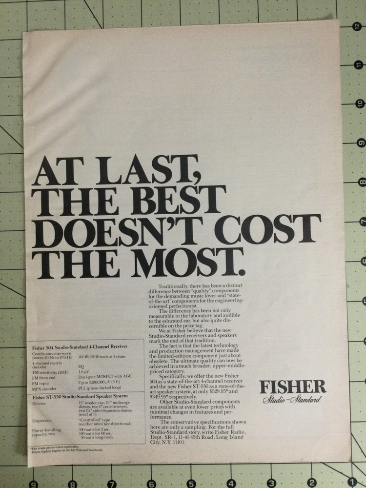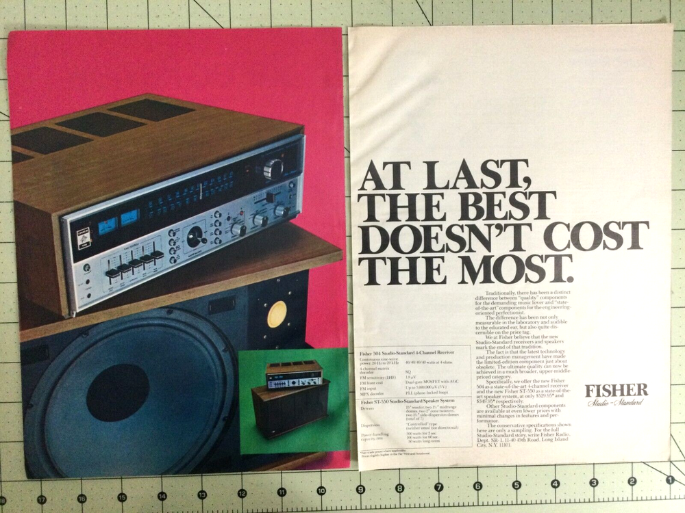 Vintage 1973 FISHER 504 ST-550 Stereo Magazine Ad. Condition is used. This is in very good condition suitable for framing. There may be minor flaws caused by age and use so please examine the photos. Ships USPS Ground Advantage in a rigid photo mailer. Dark streak in left corner is a light shadow not a defect. Page size is approx 8 x 11 inches.