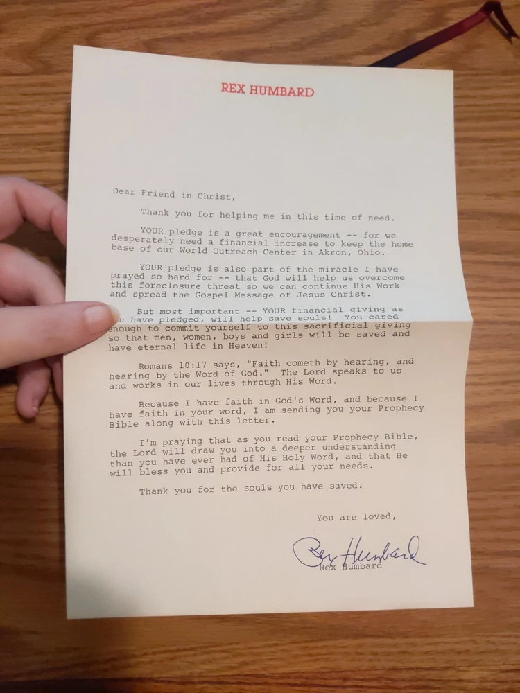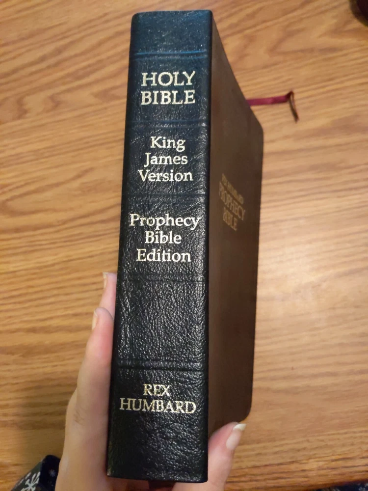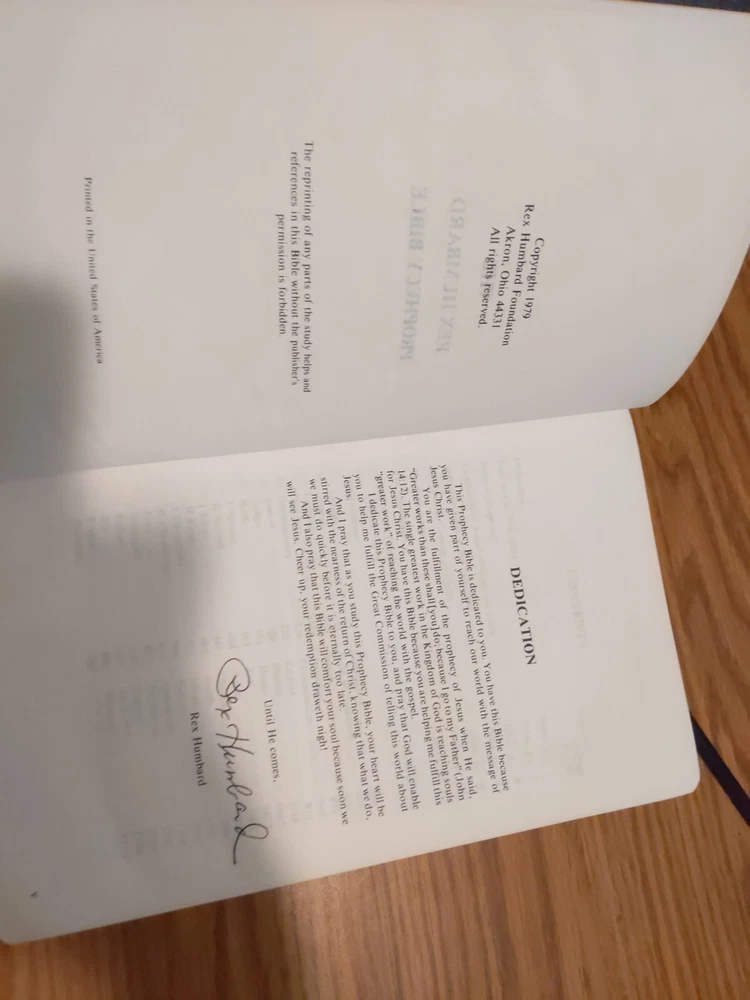 This vintage 1979 Rex Humbard USA Prophecy Black Genuine Leather Bible is a rare find for any Bible collector. The book is signed by the author himself and a thank you letter from the author. The Bible is written in English and is intended for young adults and adults alike. The book is a non-fiction narrative type and is published by Rex Humbard. The original language of the book is English. It falls under the genre of religion and the topic of the Bible. The book is inscribed and has features such as a leather-bound cover. This Bible has a small amount of damage to the lettering but both ribbons are intact. This study Bible is a must-have for anyone looking to add to their collection.