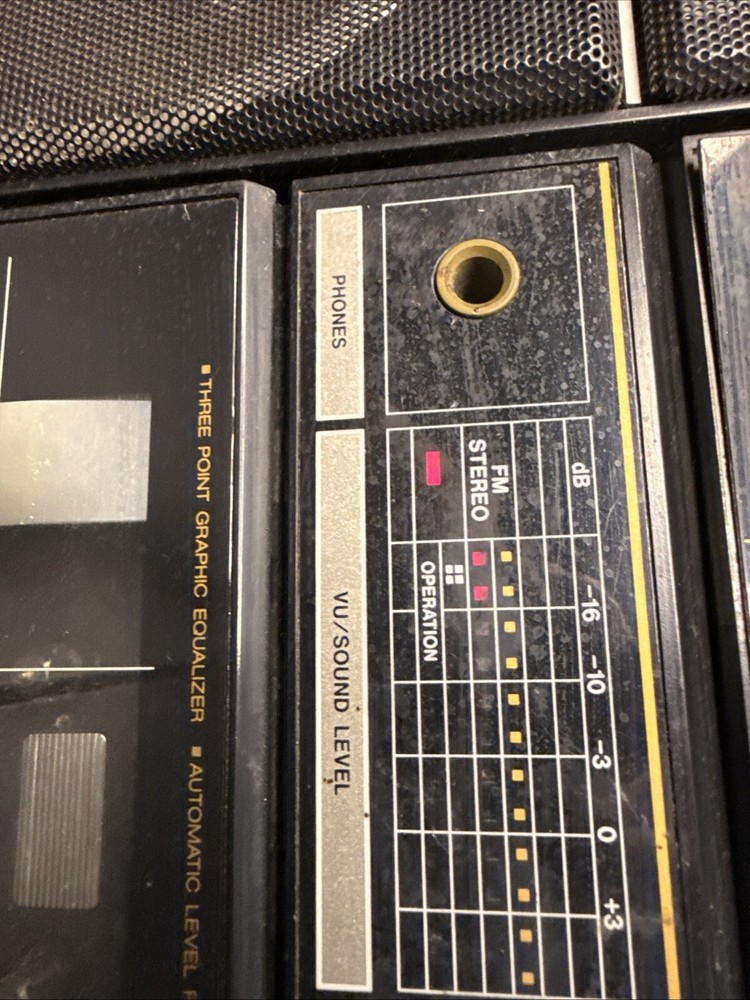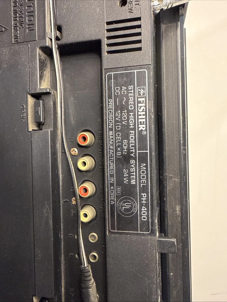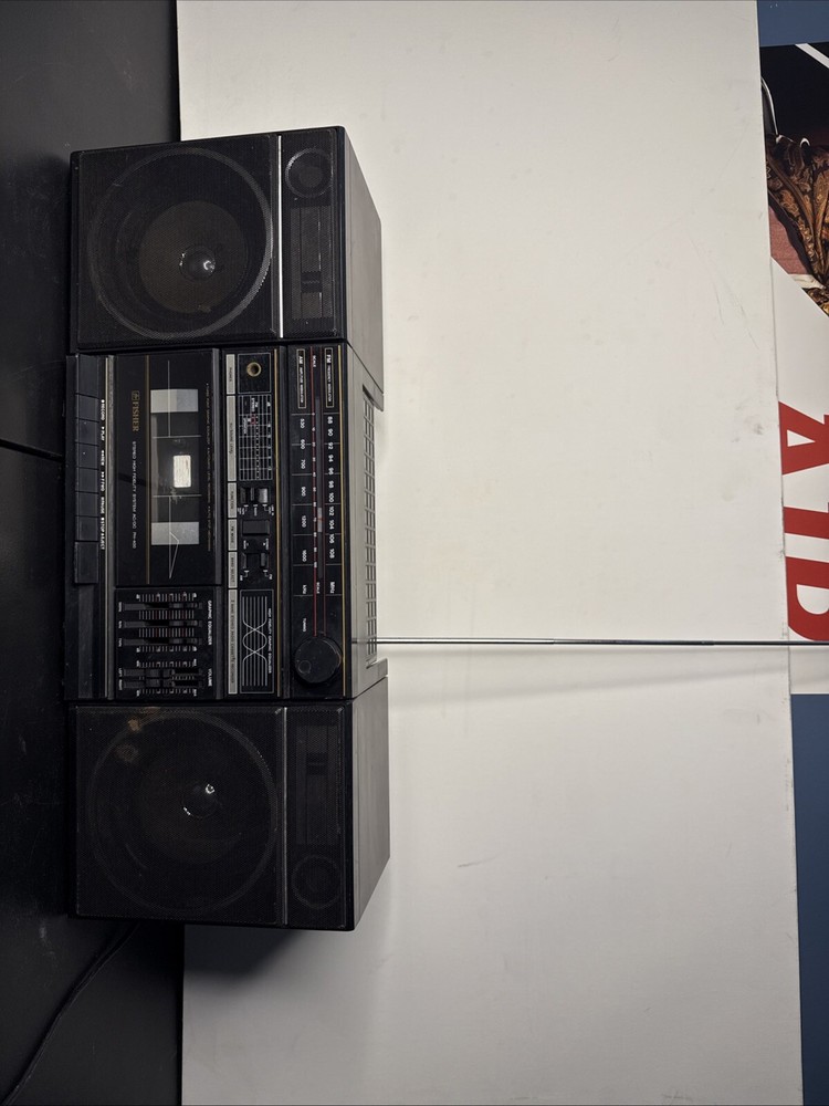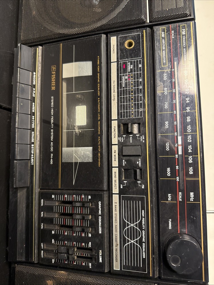 The vintage 1980's Fisher Ph-400 Cassette Boombox is a classic portable stereo system that features both AM and FM radio bands, allowing users to enjoy their favorite radio stations. This boombox also includes a cassette tape player, making it a versatile option for playing music. With a sleek black color and the Fisher brand name, this boombox offers a nostalgic experience for those who appreciate retro audio equipment. Additionally, it includes a headphone jack for private listening and audio outputs for connecting external speakers.
