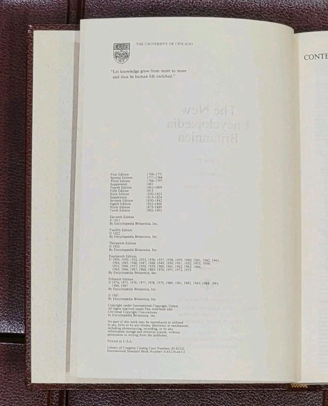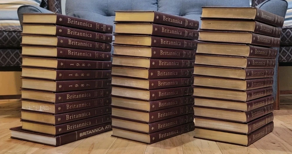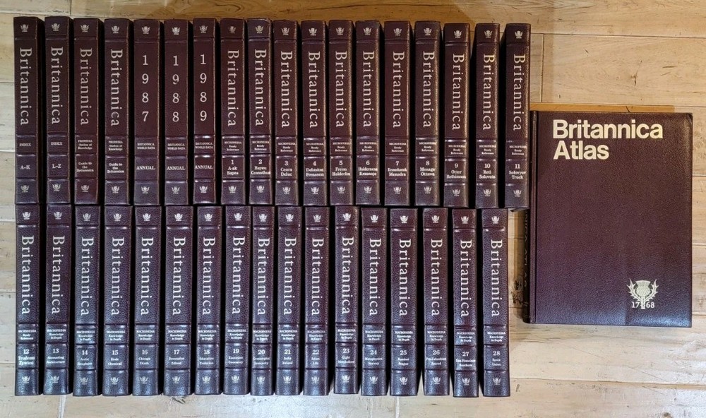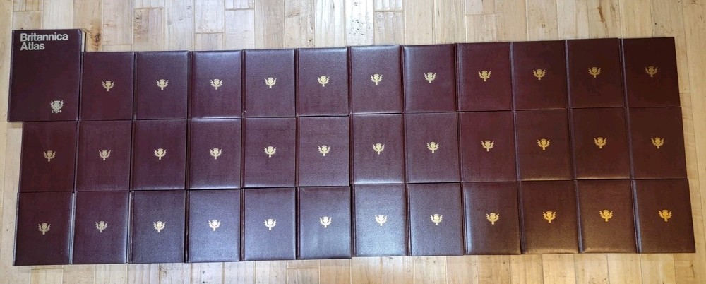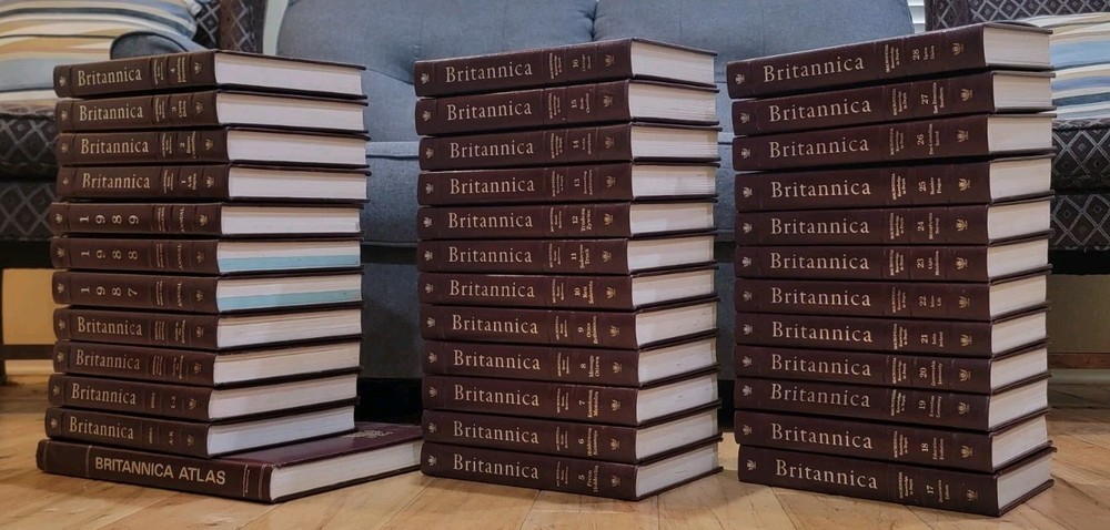 Vintage 1987 Britannica Encyclopedia Set 36 Volumes Good Preowned Condition with normal wear from use and storage. 2 Index (A-K & L-Z) 2 Guide to the Britannica 3 Annuals (1987, 1988, 1989) 28 Volumes 1 Britannica Atlas