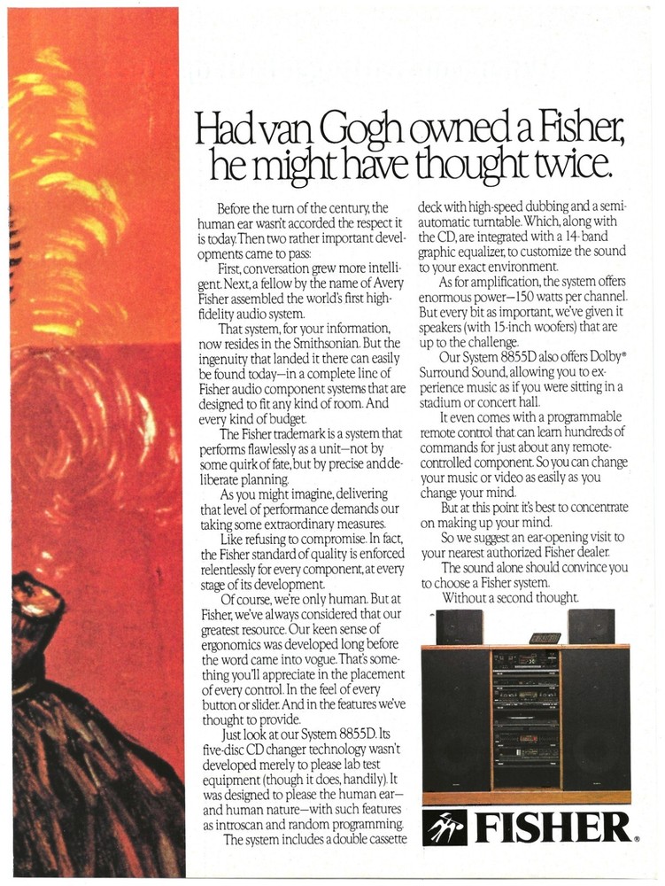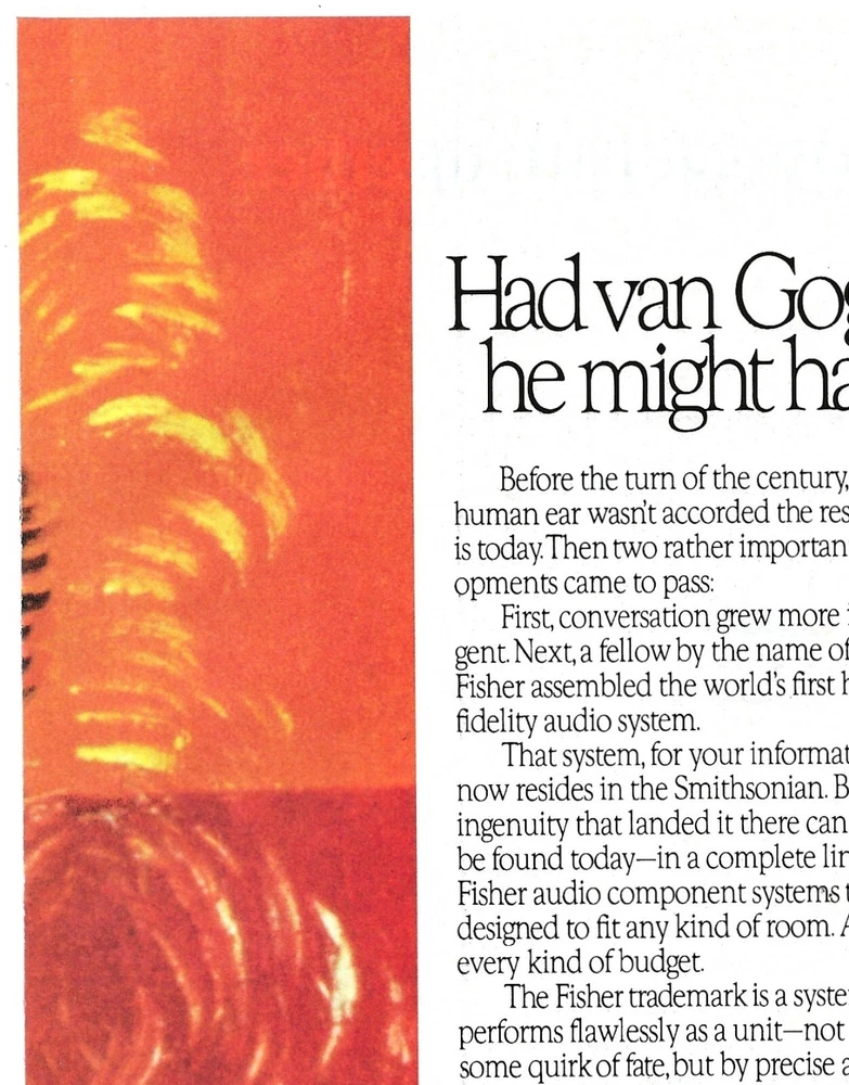 Vintage 2-Page Ad Fisher 8855D Home Stereo System - Vincent Van Gogh - Playboy December 1988 11"x8" (Each Page) No stock photos, what you see is what you get! This advertisement comes from an Adult Oriented magazine and the back may contain nudity or other mature content on the back. Not a copy or reproduction. Suitable for framing. This is an advertisement for a product, NOT the product itself! Good vintage condition with some age wear. This vintage item may show signs of age and wear. Foxing fading or discoloration may be present. Please review scans. Shipping is a flat $5.99 for any number of print ads. Order one ad, pay $5.99 shipping. Order 10 ads, pay $5.99 shipping! Sent via USPS Ground Advantage. If you are purchasing several ads at once please use the "Add to Cart" button to ensure you are charged the correct shipping amount. Sell internationally only using eBay's Global Shipping Program. Item will be shipped same or next business day after payment received. Contact me with any questions and Please check out my other items. Thanks for looking!