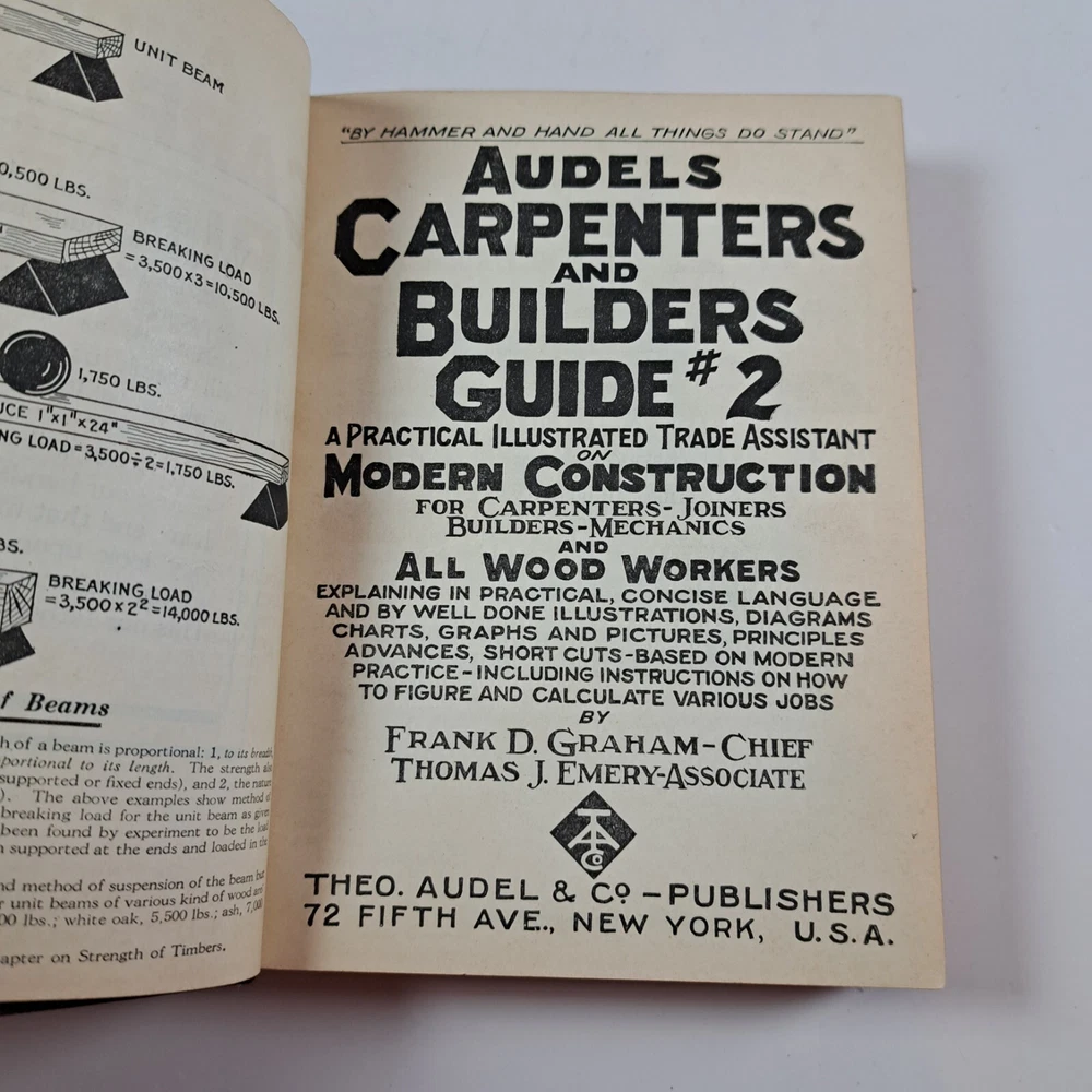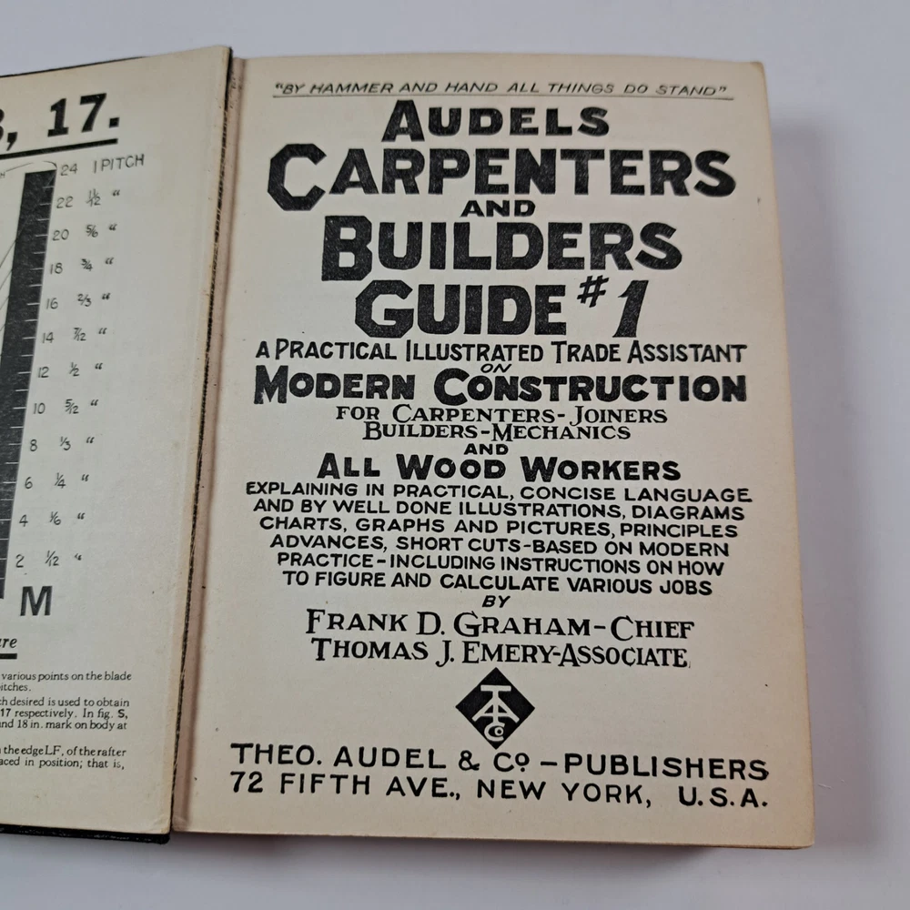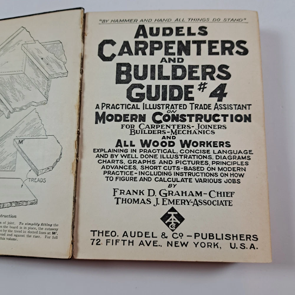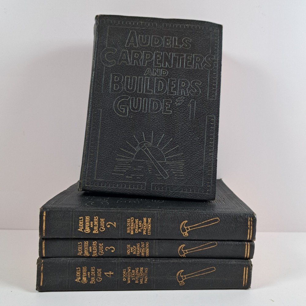 Vintage Audels Carpenters and Builders Guide Books Volume 1-4 Leather c1923. Books measure about 6-5/8" x 4-3/4". Each book has a name written on the first page. No other pen or pencil marks that I can find. A few pages have bent corners in each book. Pages have started to darken with age and oxidation. Covers have some light wear and creases. All volumes have end papers that have cracked in some places or are starting to crack on the front and back inside cover. No missing, torn or lose pages, except for volume 4 that has a section of about 20 pages where the threads are coming loose from the spine (they are still attached though). Gold trim on the edges is in good condition with only light wear near the corners and bottom edge. No musty smells. I'm always happy to combine shipping on multiple items. Feel free to message me with questions. Thank you. Please review the item specifics and the photos as they are part of the description. ______________________________ You will receive the exact item pictured Items acquired from estate sales or auctions At least two shipping options available on all listings Combined shipping always available, simply add the items to your cart first and shipping will automatically be combined Items shipped from a smoke-free, pet-free home Thank you for supporting a small business