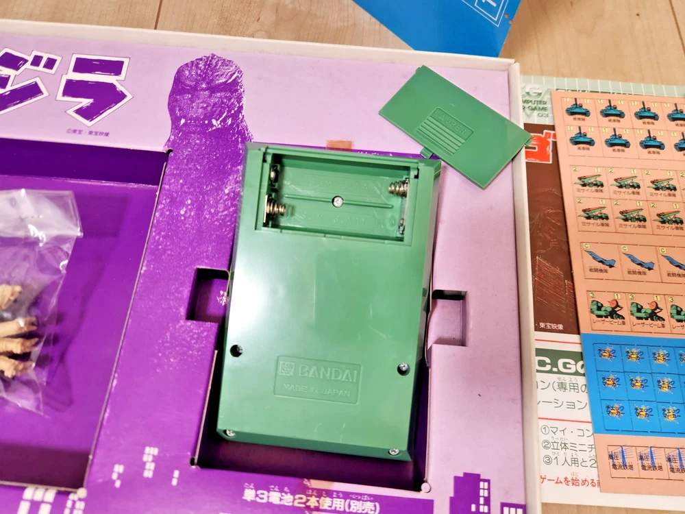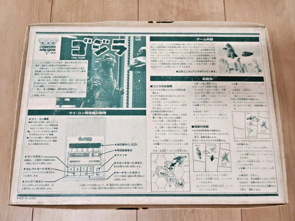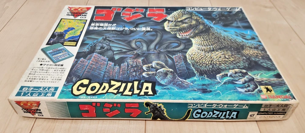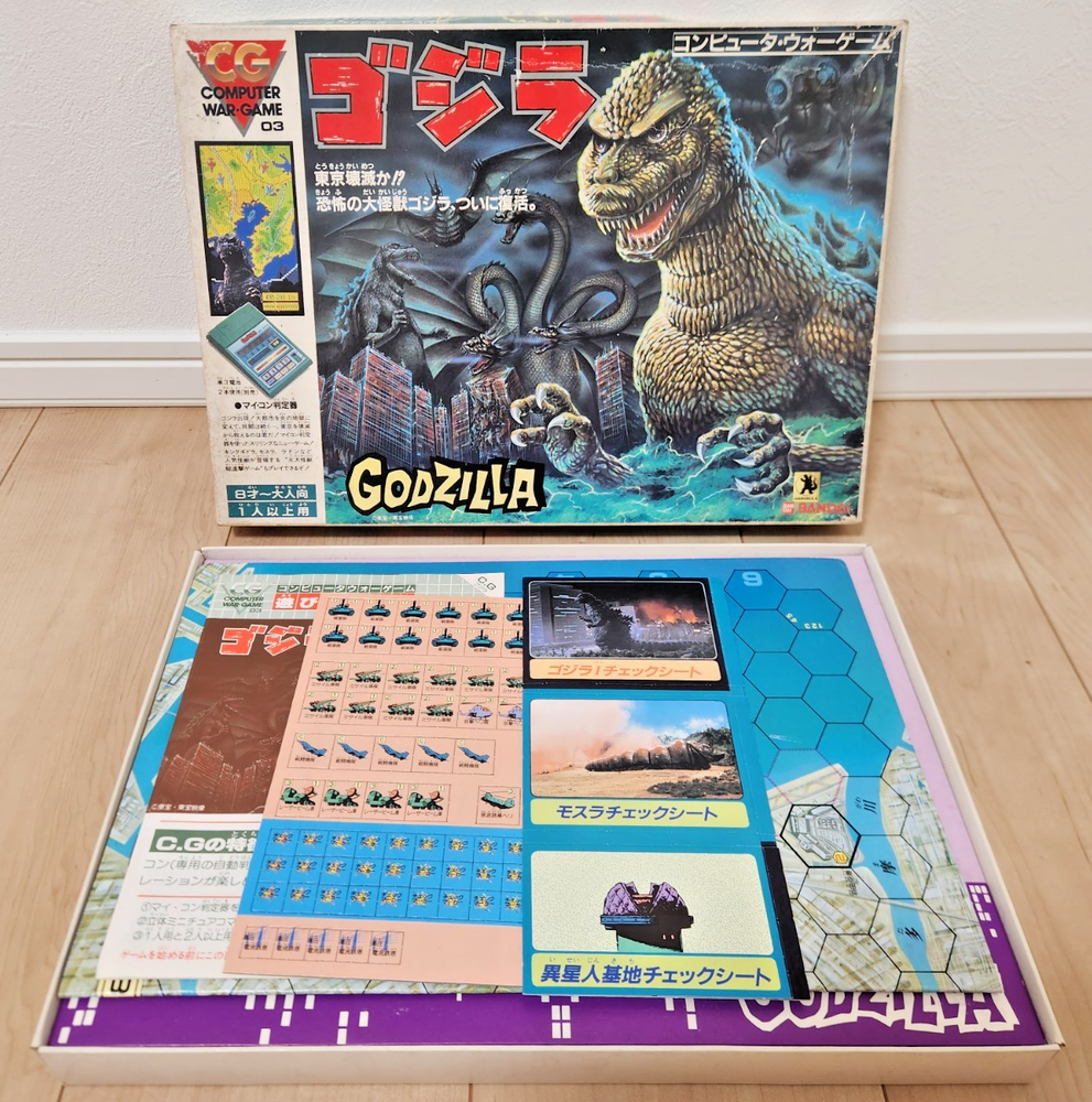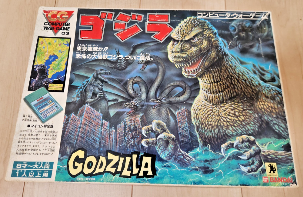 For sale is a vintage Godzilla board game produced by Bandai in 1984. The contents have never been used and the box has some storage wear, but is overall in fine condition for being 40 years old. You can find more info and English instructions at the following address: https://mykaiju.com/godzilla-computer-war-game/