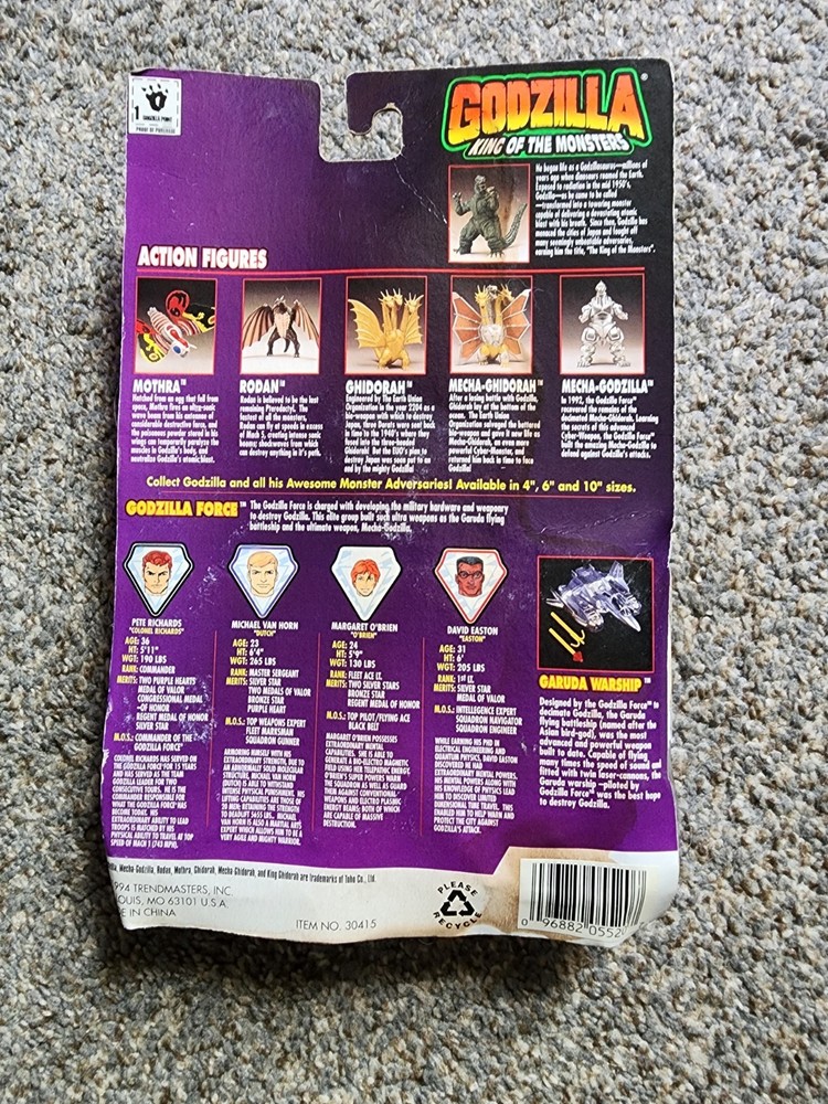 Unopened and new, however the box is in poor condition. This vintage action figure is a must-have for any Godzilla fan. The character is David Easton, the monster king from the popular comic book franchise. This figure is part of the Godzilla Force series and is still unopened on its original card. The figure itself is beautifully crafted with intricate details that capture the essence of the character. It is perfect for collectors or for children who want to recreate their favorite scenes from the movies. Don't miss out on this rare piece of Godzilla memorabilia.