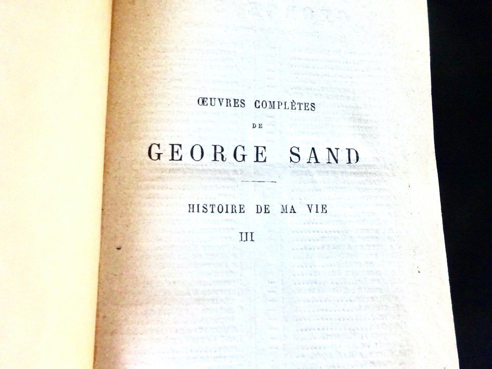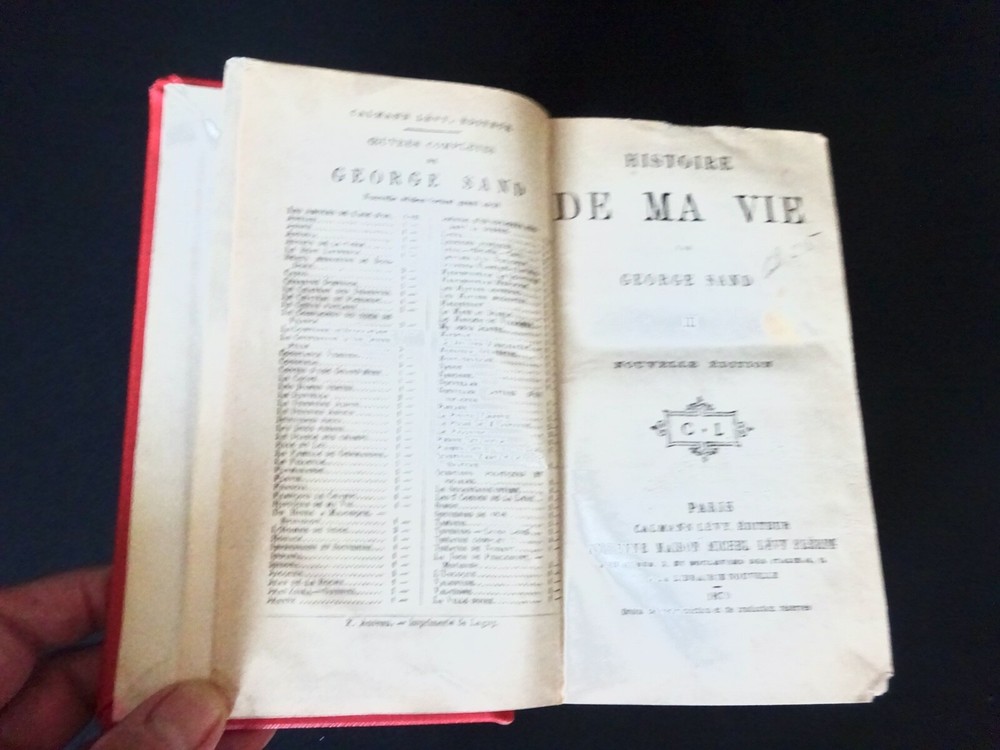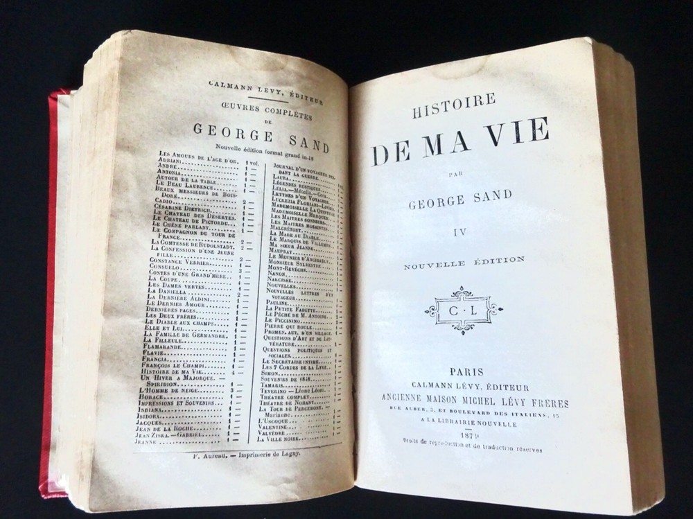 Antique French book, Complete Works of George Sand, Histoire de Ma Vie, 1879. published in Paris, Calmann Lewy, Editor. An interesting story with this book. The original book was rebound by Multnomah Country Library, Portland, Oregon. There has to be an interesting history that this book, published in Paris more than 150 years ago ended up in Portland, Oregon!! Extremely rare. Red cloth cover. 499 pages. Language: French. Hinges secure. Very good condition. 7" x 4 1"/4. New cover, original pages. For more vintage French: http://stores.ebay.com/allvintagefrench