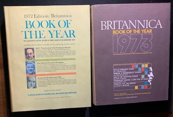 17 volumes of Britannica's Book of the Year between 1968 and 1985. 1983 has gone missing. First 6 volumes have dust jackets. Includes the 200th Anniversary edition from 1968.