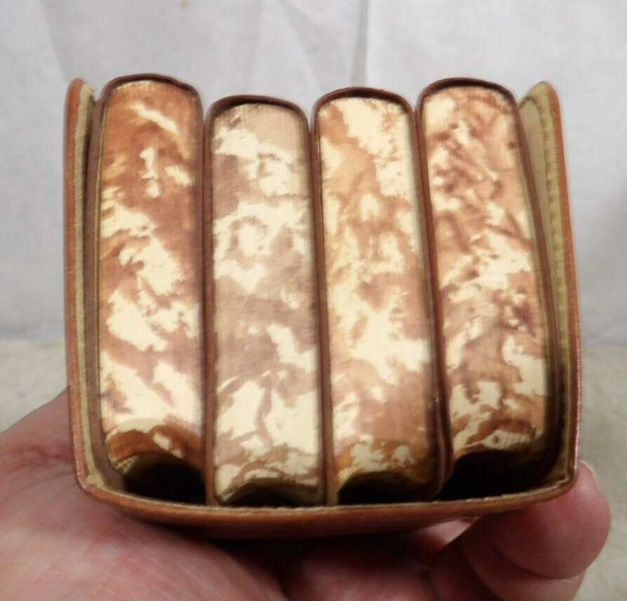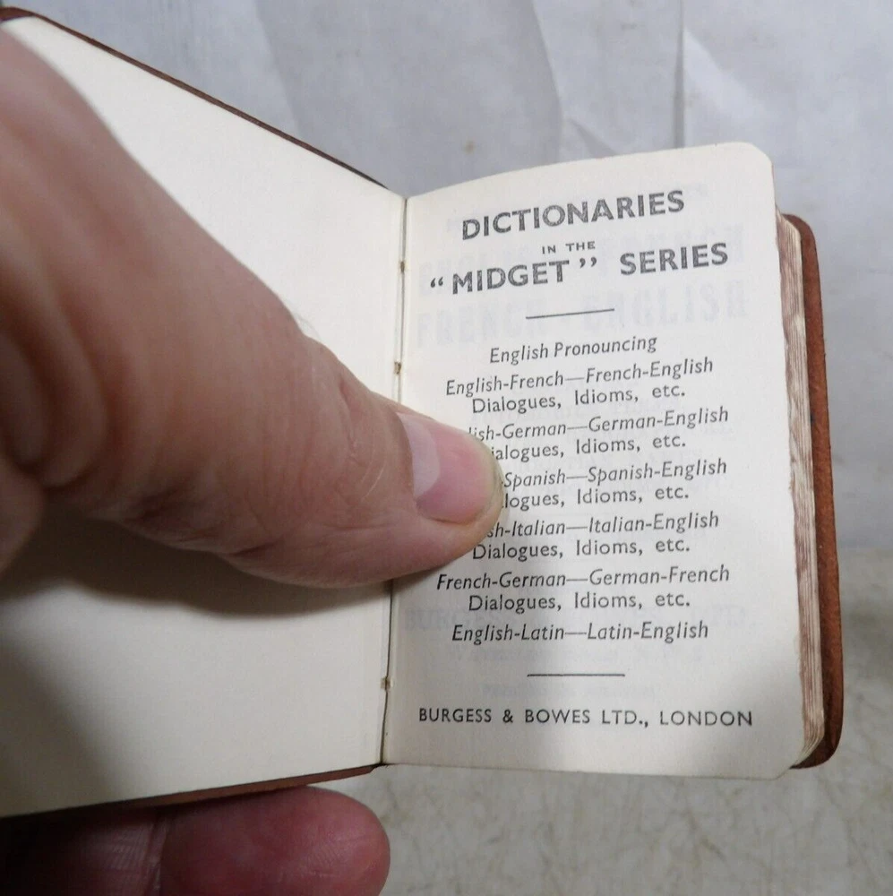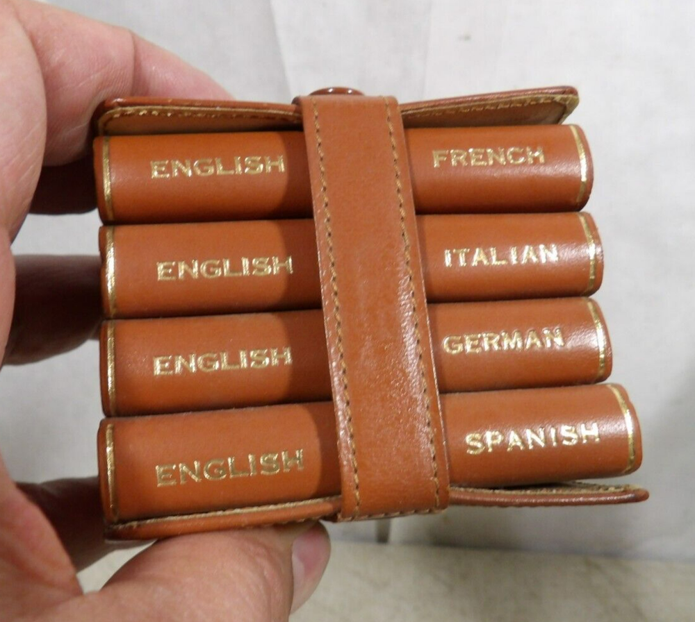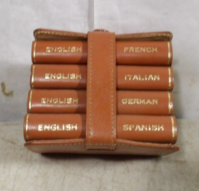 Up for sale is a Vintage/Antique Set Of 4 Books, Excellent to Near Mint Condition As Shown, Please see photos for details, Miniature translation dictionaries one each; English to French - English to Italian - English to German - English to Spanish, "Travellers Aid", Entire set measures as shown 3 1/4" tall x 2 3/4" x 2 1/2", Burgess & Bowes London, Great Set!