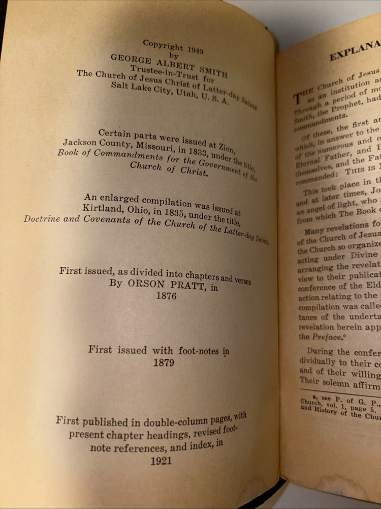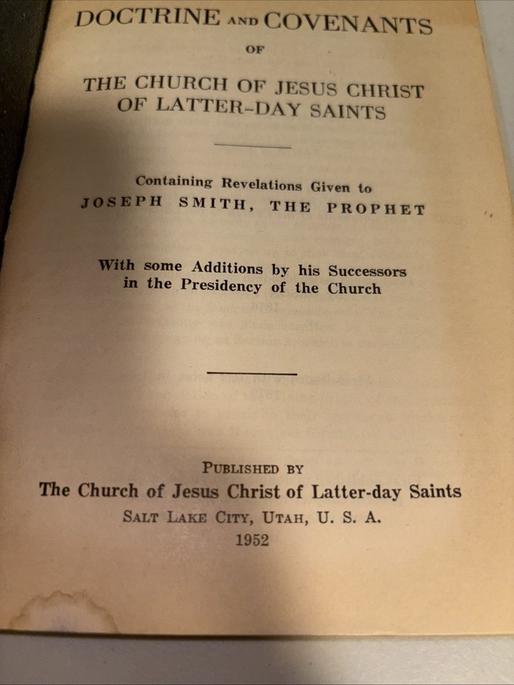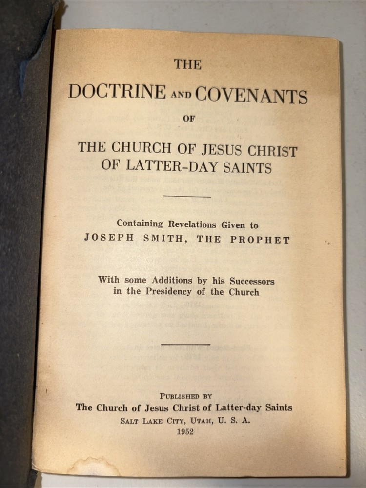 This product is a vintage edition of the Doctrine and Covenants, along with the Pearl of Great Price, published by The Church of Jesus Christ of Latter-Day Saints in 1952. The book is bound in leather and written in English by author Smith. It delves into religious topics and serves as a valuable collectible for those interested in religious literature and antiquarian books.