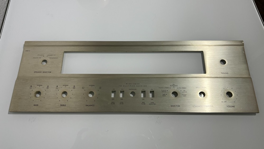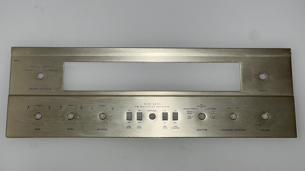 For sale is a Fisher 500C faceplate. Has some nicks and scratches but overall good condition. Terms (Please read these) Please message me if you have any gear for sale but don't want to deal with listing. I live in Central California and travel to LA as well as the bay area often! I purchase single items as well as collections. You do not need to live near me. I have purchased hundreds pieces of equipment over 10 years for my own collection and to restore for sale. The Ken Rule: If you are local and wish to purchase an item (typically only speakers), you will need to pick up the item, and I will be unable to deliver under any circumstance unless the following is understood and agreed to: I am unable to help you audition, A/B, or move gear unless I am compensated up front, and it is understood that my time is at least as valuable as yours. If we agree on a trade in lieu of cash payment, you must have this gear ready for me at the time of the transaction. No IOUs. If you end up not liking the speakers or your wife, girlfriend, significant other tells you she doesn't like them, you will be responsible for selling them, I will not take returns unless I am compensated for the time you had the item as if a rental. This rules comes from dealing with an individual who offered an attractive trade if I delivered the speakers to him. This ended up being a tremendous waste of time. I sell mostly vintage electronics. As such, these items are old and typically out of spec from when they were new. I do my best to test these items and make sure they work before they're sent out, but I do not guarantee or represent that they will meet the original specifications. I may not even be able to test them, in which case assume that they don't work. However, there are times where I may miss something. If that happens, I hope that you would agree that the most efficient way to take care of an issue is if you simply message me before opening a case or doing anything else. Selling items on eBay is a side effect of collecting vintage electronics. I need an outlet for these items online, so I have no reason to send you something that doesn't work unless I've noted that it doesn't. This is not my day job and I am not here to try to make a quick buck. I will do my best to represent all major cosmetic damage to any items that I sell, but when you purchase something from me, expect minor scratches and nicks unless I've noted that the item is free of them. I pack items correctly. I know what it takes to get an item to you safely. As a result, you may see that the shipping quote shown is higher than you're accustomed to. Rest assured, I lose money on just about every item I ship when packing materials are considered, but if I don't, I will absolutely refund you the difference. You will NOT have to ask for it. I will do my best to get items out within a few days, however there are instances where that is not possible especially around holidays. Please see the handling time to know how long it may take for me to ship an item. The policies here are difficult in this regard because these vintage items in particular need to be moved and packed carefully. I do not want to damage anything by rushing. Buying the proper materials may also take time. I am not as fast as Amazon, but I guarantee I'll pack better. With this all being said, if there is any reason that you don't feel that you can leave FIVE stars in every category, please reach out to me before leaving any feedback other than positive with all five stars in every category. FOR EBAY GLOBAL SHIPPING PROGRAM CUSTOMERS: The program will not allow me to ship tubes. If you purchase an item with tubes in them, the TUBES CANNOT BE INCLUDED. I can send them to you directly, but they will not be included with your shipment. Please message me to work this o
