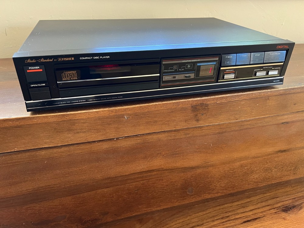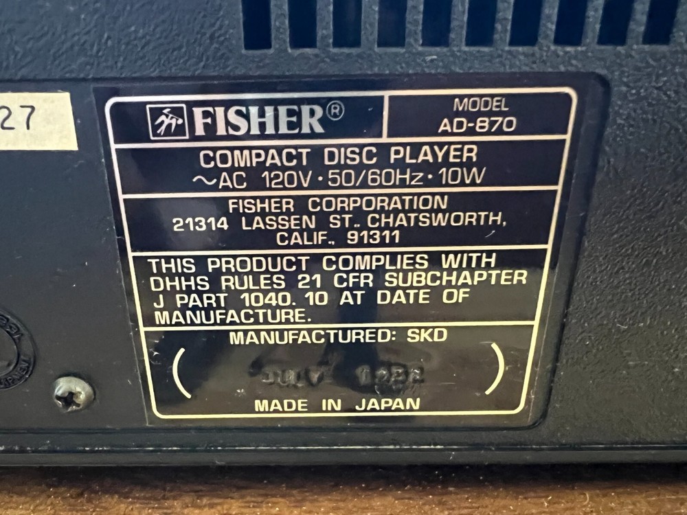 Fisher AD-870 Manufactured: July, 1988 Condition: Used Remote: N/A Made in: Japan Pretty Studio Standard by Fisher CD player in great working order and good cosmetic condition. Faceplate near perfect, wear on case. Scammer warning: All serial numbers - including individual parts and components - photo logged. Packaging video logged. Will prosecute fraud to fullest extent of Ebay, federal, state and local laws.