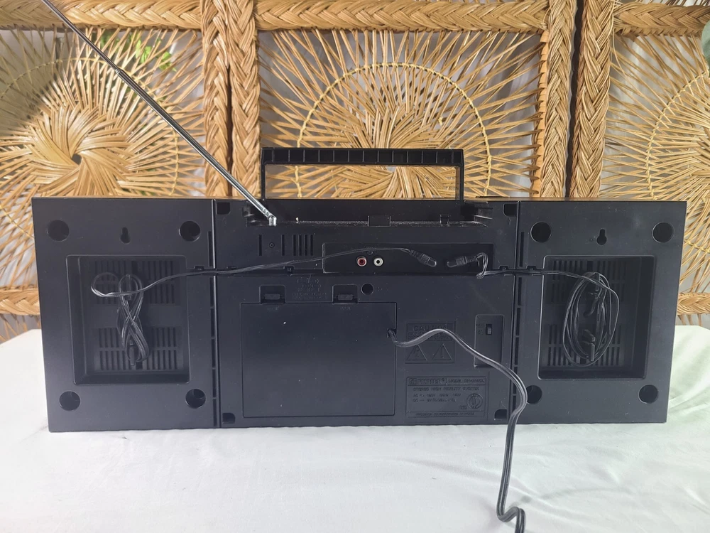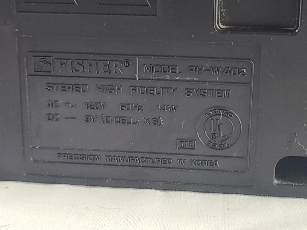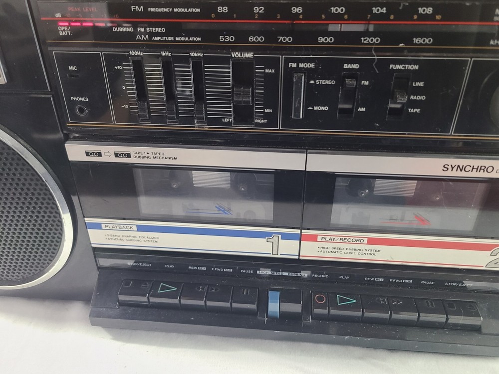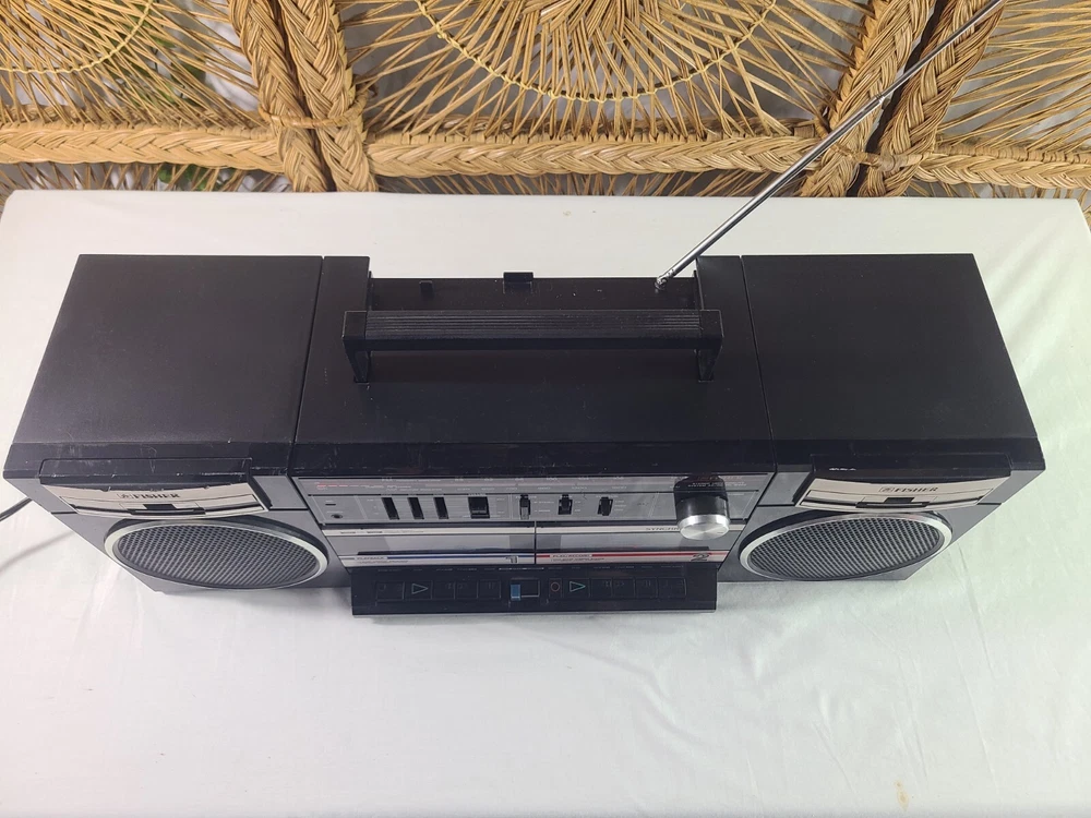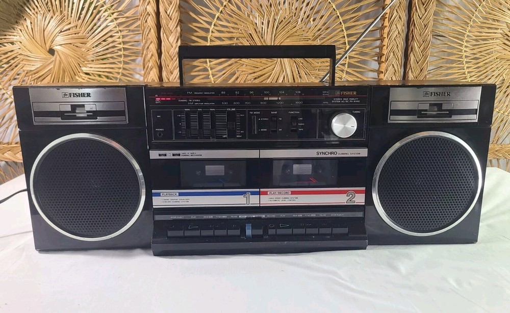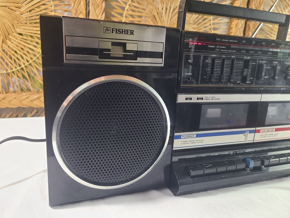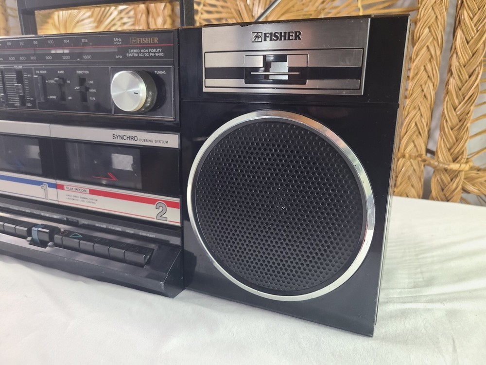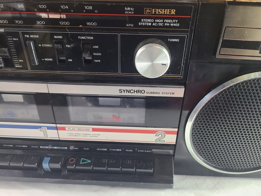 Vintage Fisher boombox model PH-W402. The tape decks do not work, most likely needs new belts. The radio works fine although the antenna is loose and needs tightened. Both speakers work and sound good. Battery compartment is clean however I did not test battery capability. The tuning knob is not original. Some light wear from age and use. May need to clean the contacts. It measures about 22.5 x 6.25 x 8.25 inches. Take a look at the pictures for more details and message me with any questions you may have.