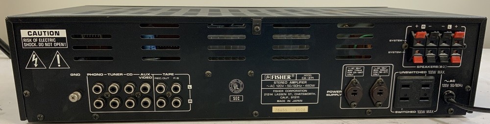 Vintage Fisher CA-271 Power Stereo Amplifier Item shows minor signs of use. No additional accessories or cables included. Buy in confidence with our 30-Day Hassle-Free Return Policy ! ___________________________________________ IMPORTANT PLEASE READ: Listing is only for the item(s) pictured unless stated otherwise. If an accessory is not stated or pictured in the listing, it is not included. Please read all information before bidding/buying. ___________________________________________ Our Mission: At epartsonsale , we treat every customer with honesty and integrity. Providing a superior experience for every customer is our top priority. For questions or concerns regarding any of our products, please do not hesitate to message us. Our dedicated team is standing by to assist you. _____________ ______________________________ Shipping Information: Items are shipped via FedEx or USPS. Expedited shipping is available upon request (additional charges may apply). We offer local pick up in some cases. We reserve the right to change shipping carrier or class based on seller discretion. We are closed on Saturday and Sunday. Order handling time is 2 business days , however, most orders ship the next business day. ___________________________________________ 30-Day Hassle Free Return Policy: A return may be initiated within 30 days of receiving your item. If the item to be returned is defective or inaccurate, a return shipping label will be provided free of charge. Upon receipt of the retuned item, a replacement item (if available) will be shipped free of charge or a refund issued. Buyer is responsible for shipping charges on any item that is not defective or inaccurate. Refund will be issued upon receipt of the returned item given it is received in the same condition as it was sent out. Items in "new" condition that are returned are subject to a 15% restocking fee. Returns must have all original packaging and accessories. Items must be shipped back in its received condition and properly packed. Return is void if the barcode sticker "BS-XXXX" is removed. Please contact us first before opening a return. ___________________________________________ Payment Information We gladly accept the following forms of payment: Visa , MasterCard , American Express , Discover PayPal Apple Pay & Google Pay ___________________________________________ Bidding Agreement If payment is not made within 7 business days of auction end date, the auction will be considered closed.