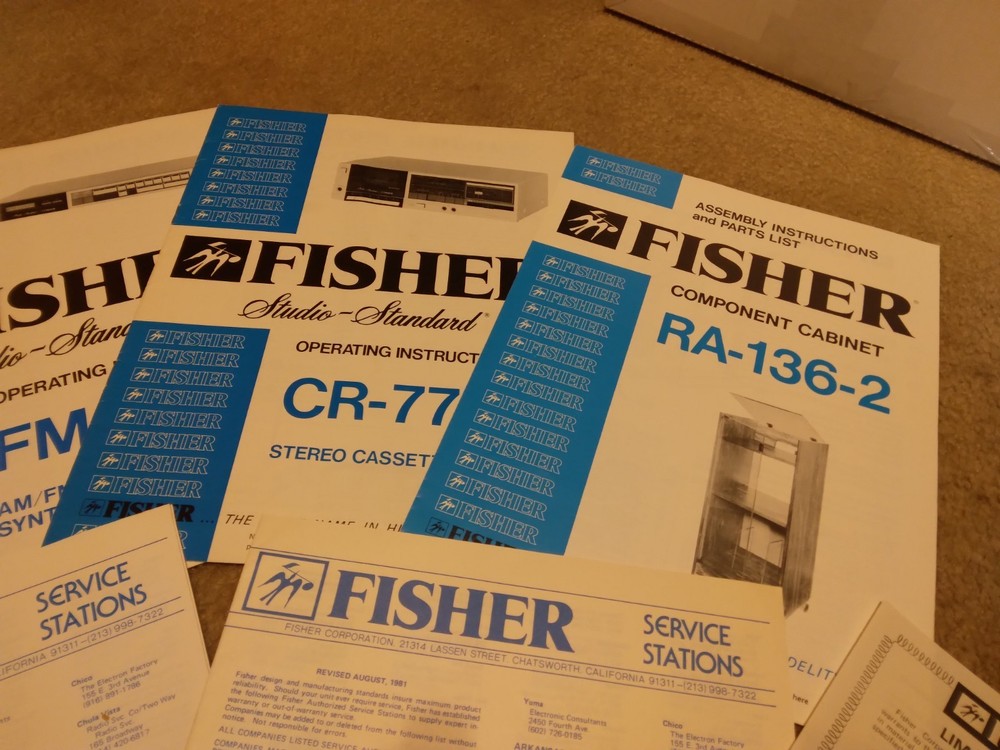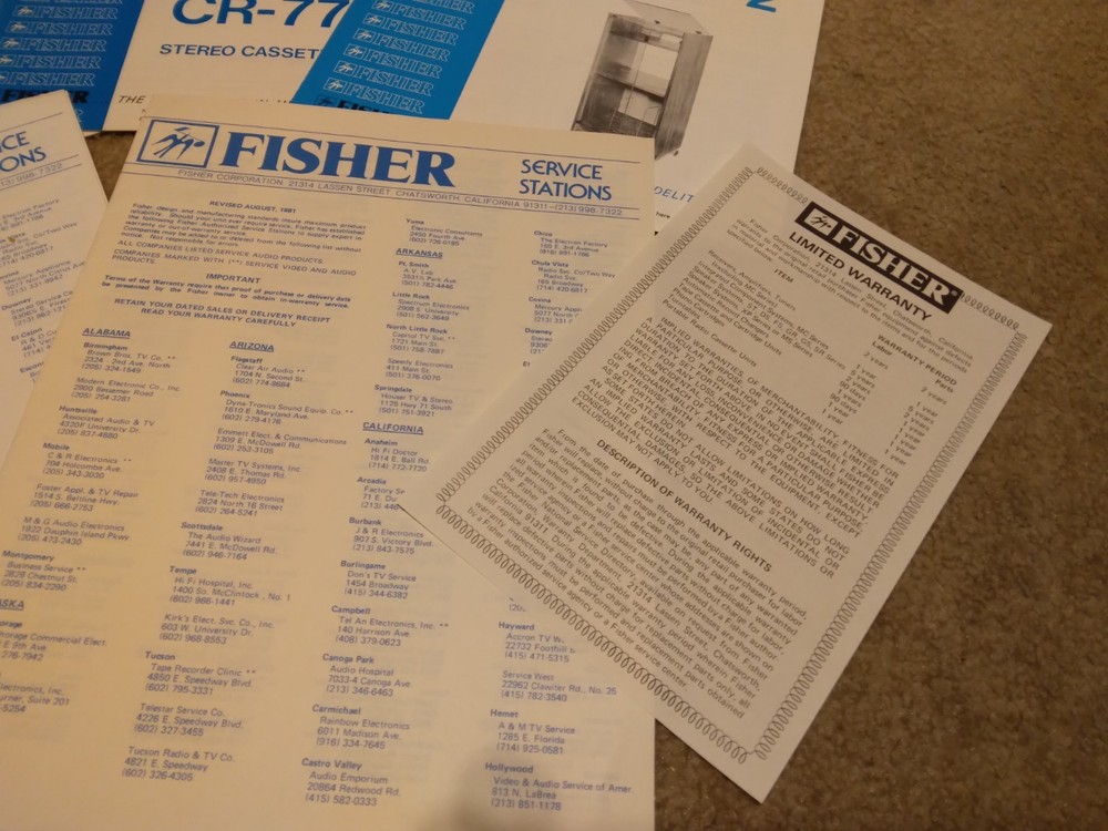 *All ORIGINAL* *Vintage Fisher Studio Standard Paper Work ONLY* (8 Pieces) ~CA-77 Integrated Stereo Amplifier Operating Instructions Manual ~FM-77 AM/FM Stereo Synthesizer Tuner Operating Instructions. ~CR-77 Stereo Cassette Deck Operating Instruction Manual.. ~RA-136-2 Component Cabinet Assembly Instructions & Part List. ~Fisher Service Station Locations Booklet (X 2).. ~Fisher Corporation Personal Information Card.. ~Fisher Limited Warranty Card.. **NO Receiver or any other equipment is included** ...[ Excellent Condition ]... *Selling as is and sale is final with no warranties, guaranties or adjustments and no returns... Sale Is Final... *See our other listings for more Vintage Stereo Stuff* Classic Audio Video & Stereo 3315 Harrison Ave. Cincinnati, Ohio 45211.......... [West Side, Cheviot Westwood Area] SALE IS FINAL with NO RETURNS ....................................................................................... See our other listings or stop in our store for more vintage Stereo and Turntables, Record albums, 8 track, Reel to Reel, VHS, Beta... ETC. 3315 Harrison Ave. Cincinnati, Ohio 45211 ........................................ Thank You.