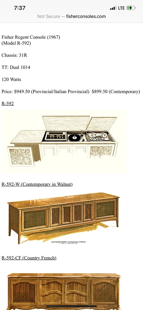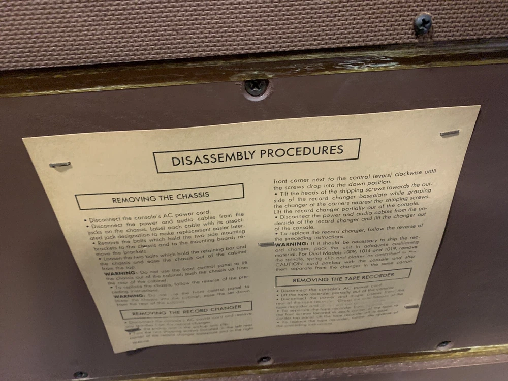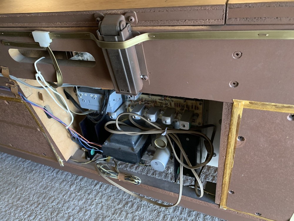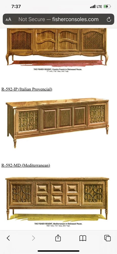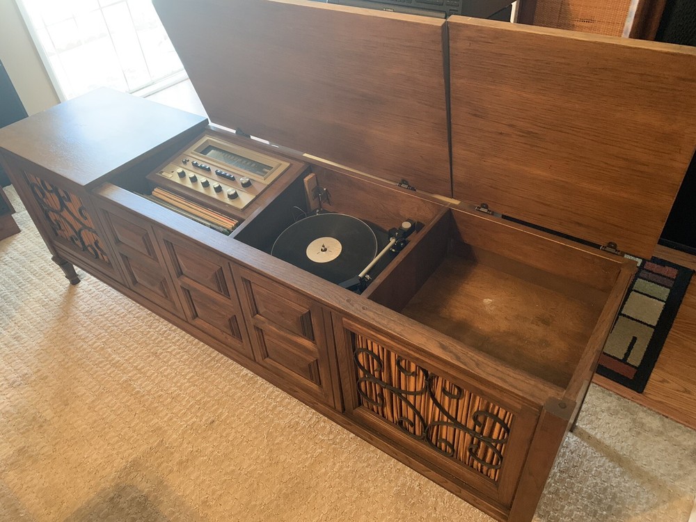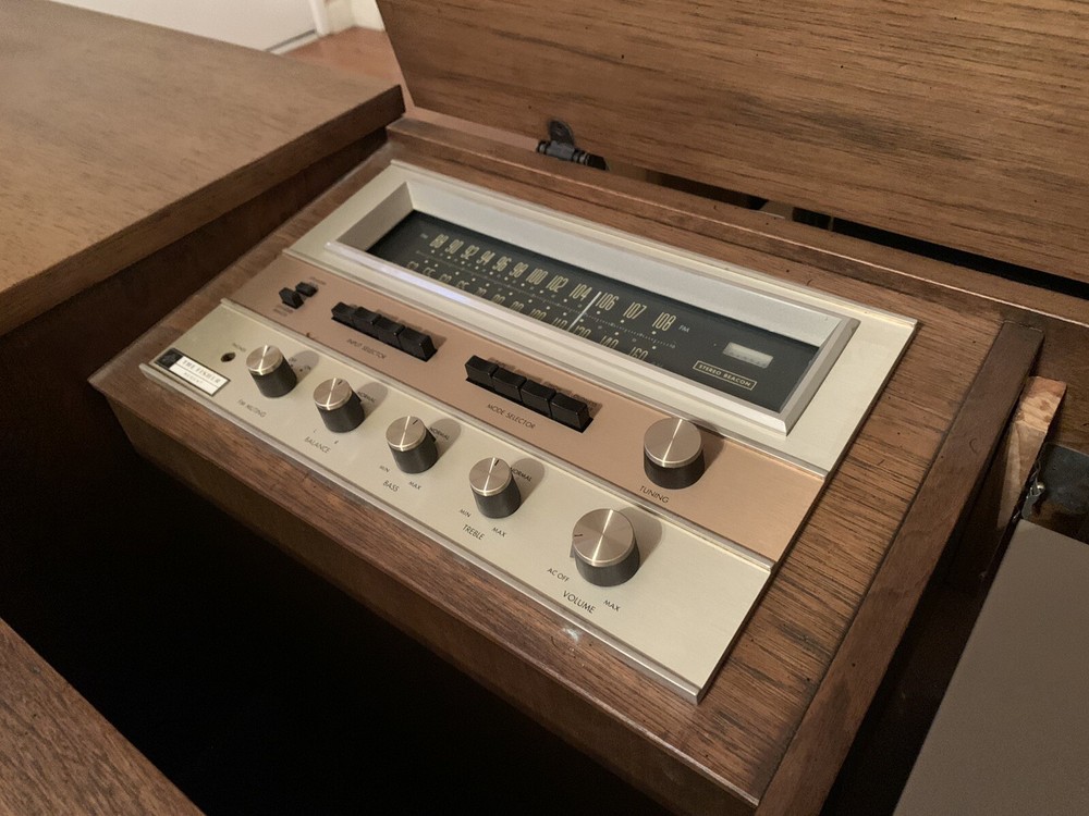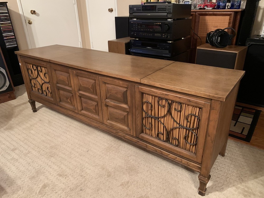 1968 Fisher Regent Stereo Console - Needing no introduction this vintage “ Time Capsule “ is near flawless. Radio works/ Aux works . Produces beautiful sound. Dual TT needs repair. For those unfamiliar, The Fisher was the brand owned by the very affluent. Out of reach for the average Joe, this Model Regent with the Fisher R31R Chassis (150 Watts) and Dual 1019 turntable retailed for $999.95 in 1968 ! This particular example is completely unmolested, no cuts to “modify for newer electronics ,etc. Just a few tiny scratches - easily remedied in the Distressed Pecan Cabinet. All information sheets on the back just as it left the factory 54 years ago. This piece represents a bygone era, where “ The Fisher” - as Fisher Radio of America ( established 1949 by Avery Fisher) was called. Built in New Jersey at their only USA plant by the end of the 1960’s or so they were being challenged by the import of cheaper Japanese product to the USA market. Competing against lower priced Japanese product eventually impacted sales and profit. In 1970 Fisher was purchased by Emerson Electronics, who eventually spun them off to Panasonic, where they were refocused to design mass produced product. Some of the Fisher product was still pretty good up into the 1980’s or so. But the Golden Age of Hi - Fi was over. Pick up only. Full demo at pickup. Approx Dimensions: 72 L x 24 H x 17.5 D