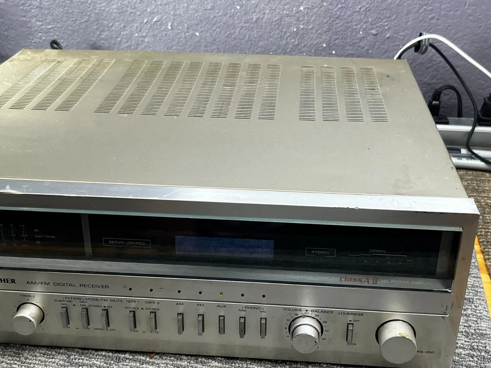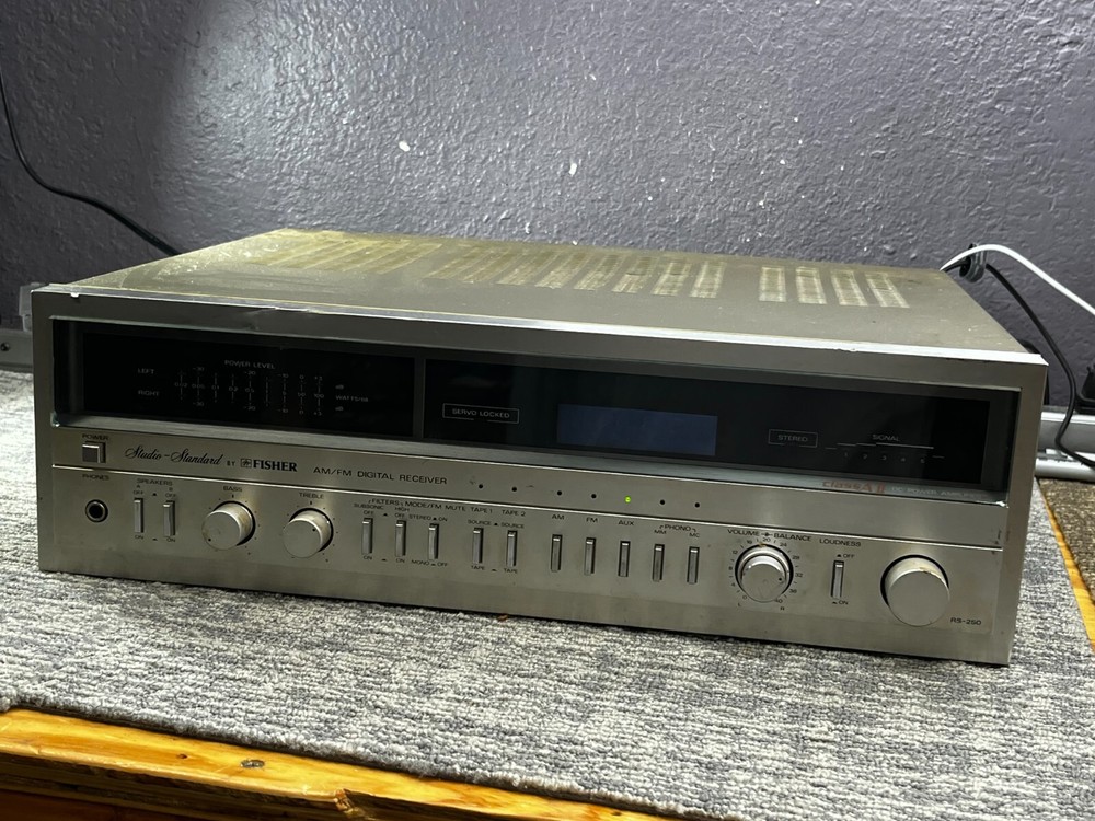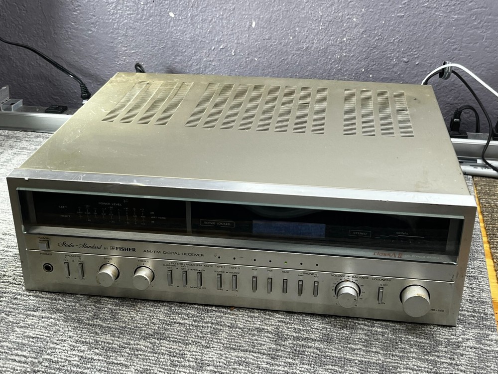 This Vintage Fisher RS-250 Studio-Standard AM/FM Stereo Receiver is in good, tested working condition. Despite its age, it performs reliably, although the clock display does not turn on. There are cut wires on the back, but this does not affect its functionality. Ideal for enthusiasts seeking a classic audio experience with a touch of vintage charm. Comes Exactly as Shown in Photos No Returns Fast Shipping !