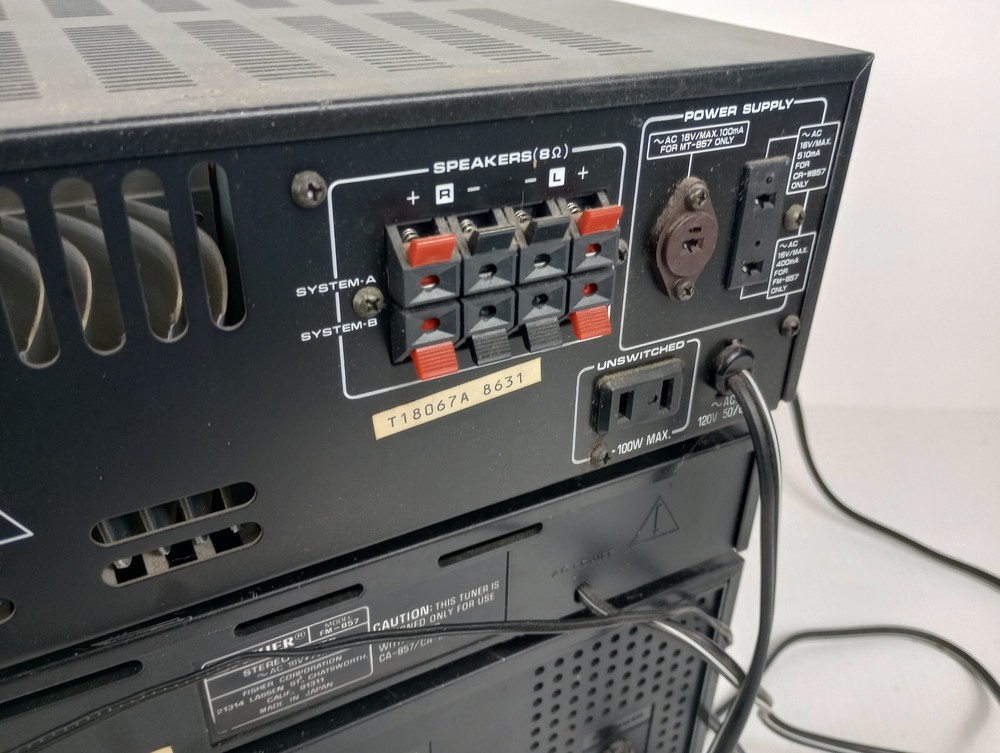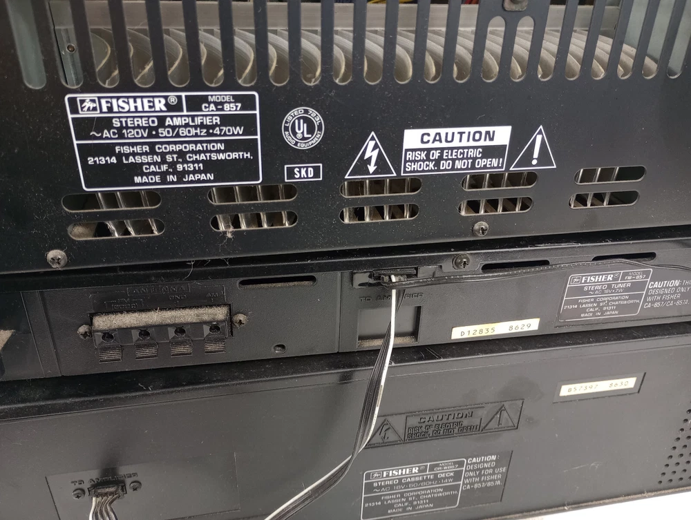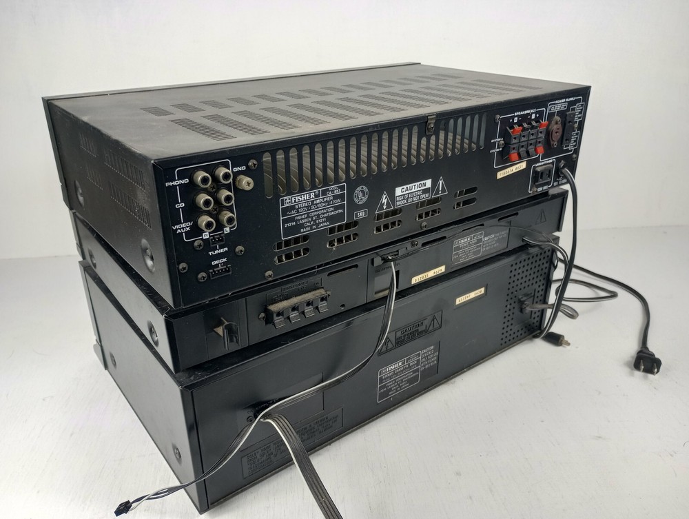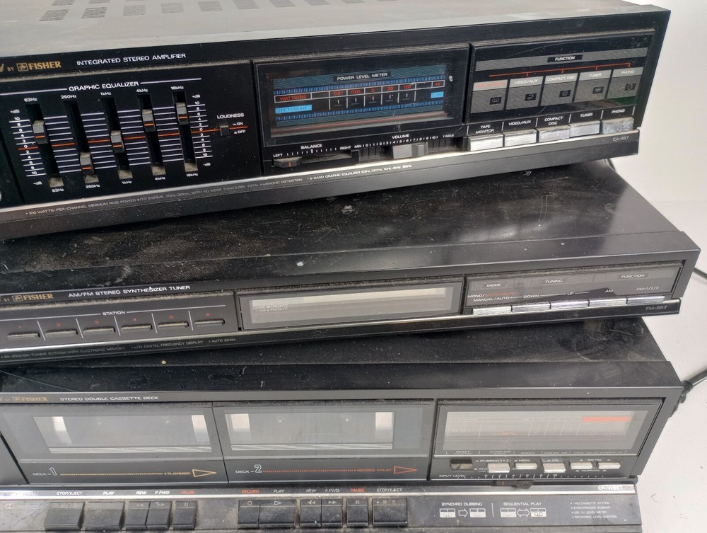 This is "Vintage Fisher Stereo + Cassette Deck + Amp (3 Pc Stereo System) Studio Standard" This is a 3 tier vintage Stereo System Setup. Model number- Stereo Amp: CA-857 Stereo Tuner: FM-857 Cassette Deck: CR-W857 This is untested but looks to be in good physical shape. This is being sold as "for parts" as this is being sold to someone with some electronic expertise or a desire to restore this. I have no idea what components are working or if anything is damage; But the outside looks to be in good condition. May need an adapter of some sort for plugs or may need other components. Being sold as-is for someone looking for a project or replacement parts for their project. All 3 Pieces will be safely packaged together. This will be a heavy and large package as this unit weighs roughly 27 pounds. May be cost prohibitive to order this far away because of shipping prices. Pricing is as cheap as i can go on this unit as it will be timely to package this safely.