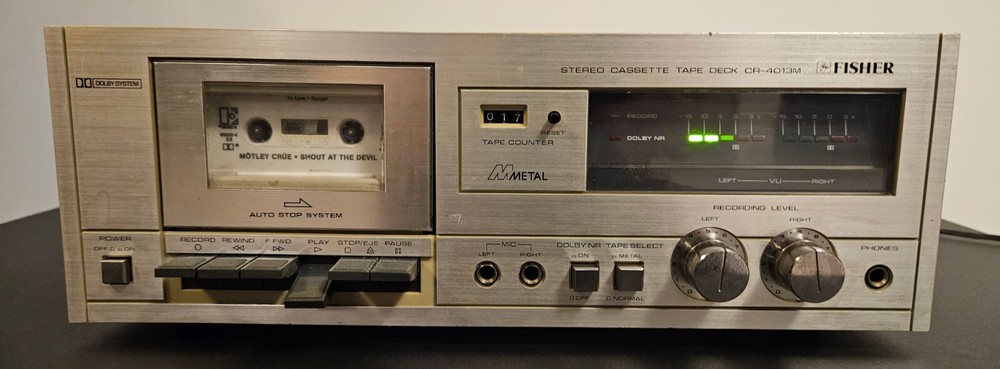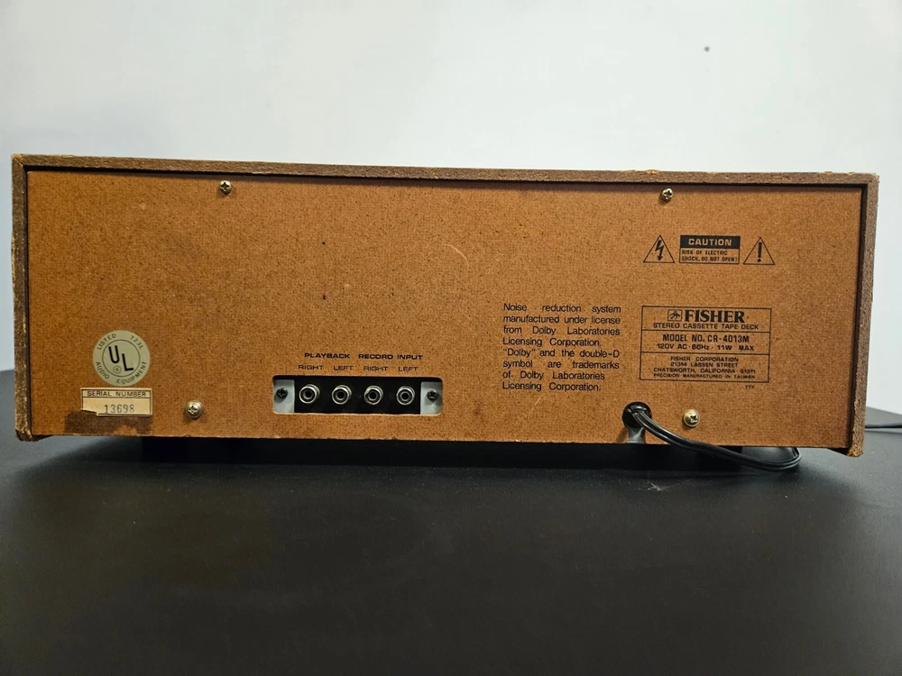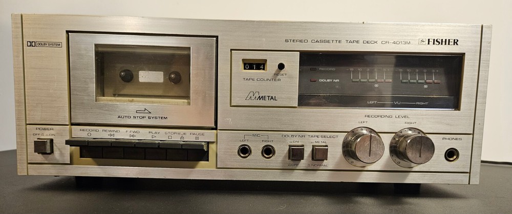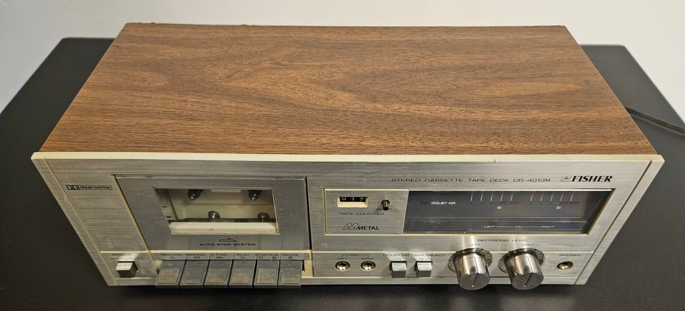 Up for sale is a Fisher Cr-4013M. This unit does play, but it appears one of the channels is not working. I have not tested the record function. Beautiful survivor with some imperfections, very clean on the inside and untouched. You are buying this being aware of the above and returns will not be given on this.