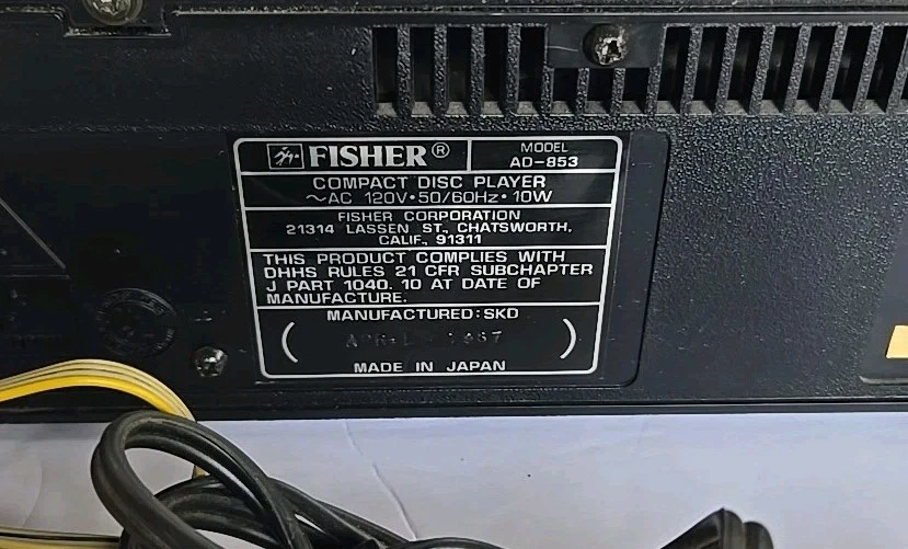 This vintage Fisher Studio Standard AD-853 Compact Disc Player is a great addition to any home audio system. Made in Japan in 1986, it is compatible with CD and CD-R/RW formats, and has stereo L/R RCA audio outputs for easy connection to your amplifier or speakers. The black CD player has a CD changer capacity of 1 and is in great working condition.