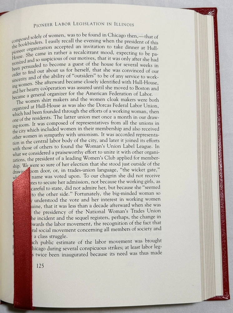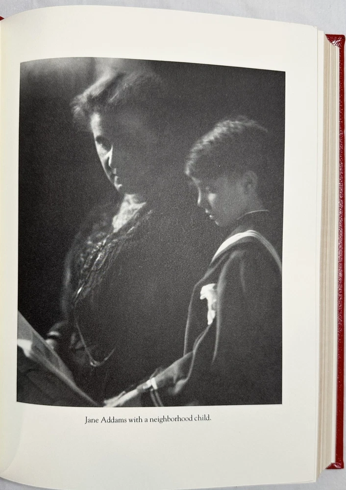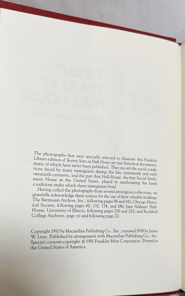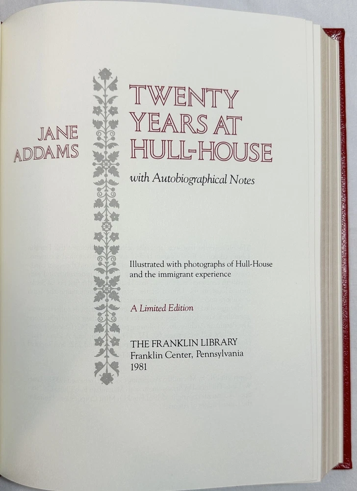 Franklin Library - Twenty-Three Years at Hull-House by Jane Addams – 1981 Part of the 100 Greatest Masterpieces of American Literature series This limited edition from Franklin Library features full genuine leather binding, hubbed spine, gold gilt accents, archival-quality pages, and a satin ribbon bookmark. Condition : Binding is good Ribbon marker is in good shape No writing, underlining, or markings inside Spine is sunned (faded from sun exposure) Cover and edges have bumping and minor scuffing , including corners No collector’s notes included A beautiful and enduring piece of collectible book craftsmanship featuring the work of one of America’s most influential reformers.