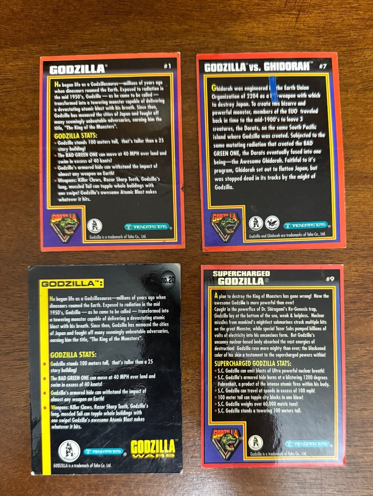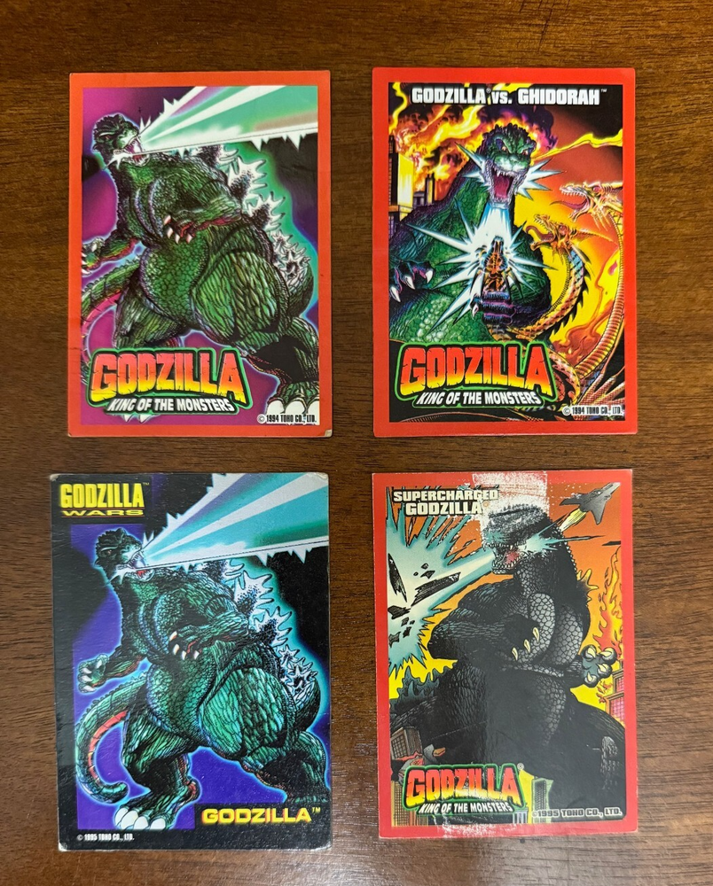 Here is a great lot of 4 vintage Trendmasters Godzilla trading cards, that were included with their action figures. Please see photos! Shipping is FREE to anywhere in the lower-48 USA. From smoke-free, pet-free home. Please see our other auctions this week! Everything you buy can be shipped together for FREE! PLEASE NOTE: Auction is open to US RESIDENTS ONLY. Please do not email me and ask if I can ship to foreign countries, because I am not doing any international or air mail shipping at this time. Thanks for looking--please check out my other auctions--lots of other vintage collectibles up this week!