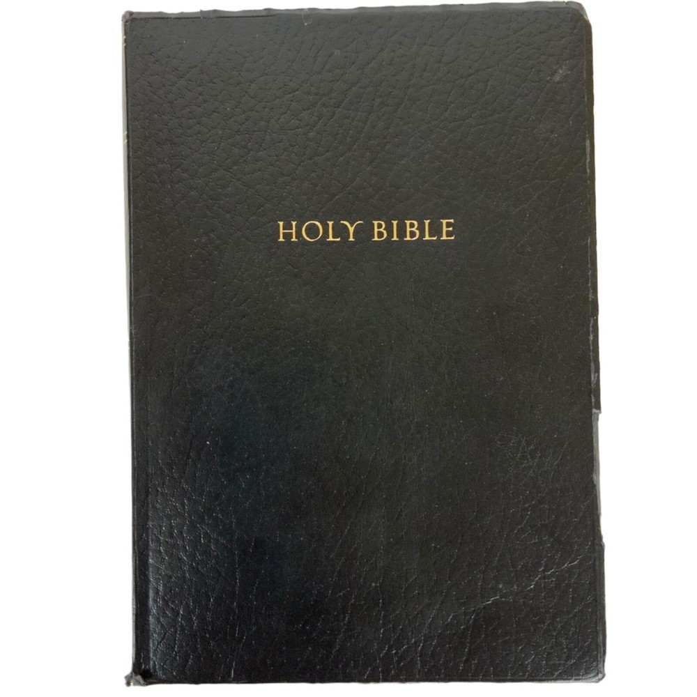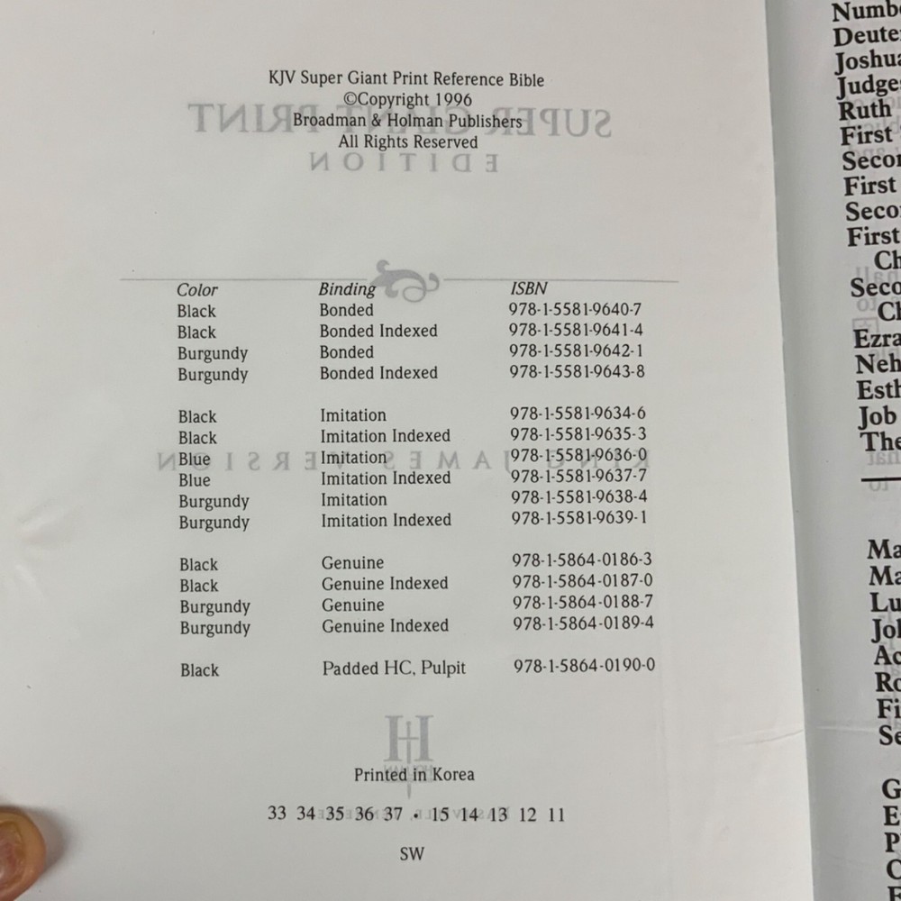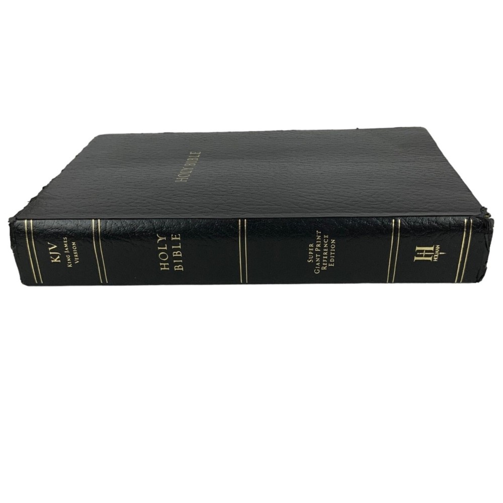 Vintage Holy Bible KJV Super Giant Print Reference Black Imitation Leather 1996 This Bible features a super giant print for easy reading and a durable imitation leather cover. Ideal for study and daily devotion. • Super Giant Print • Imitation Leather Cover • Black Color • Old & New Testaments • Reference Edition • Published by Broadman & Holman Acceptable pre-owned condition with shelf wear, creasing on the cover, and wear along edges. Pages are unmarked. Binding intact. Book pictured is actual copy you will receive.