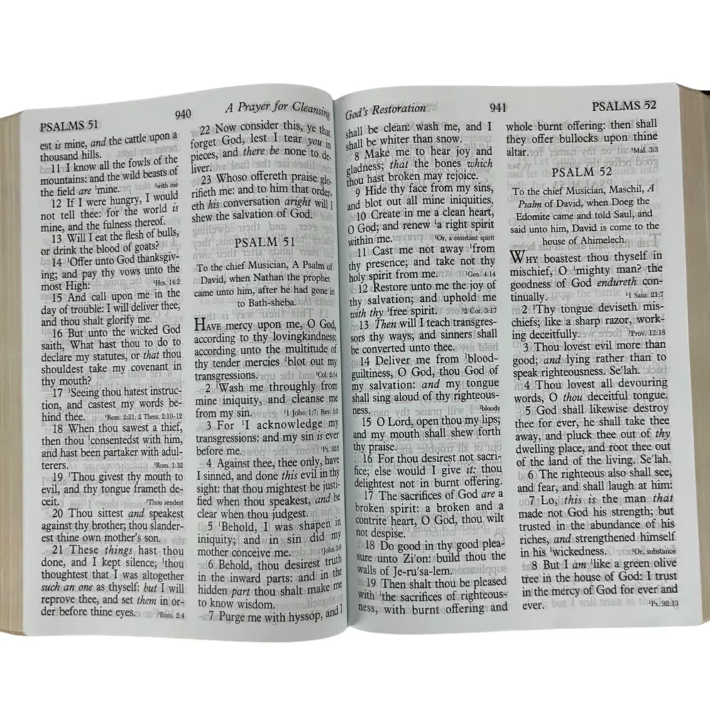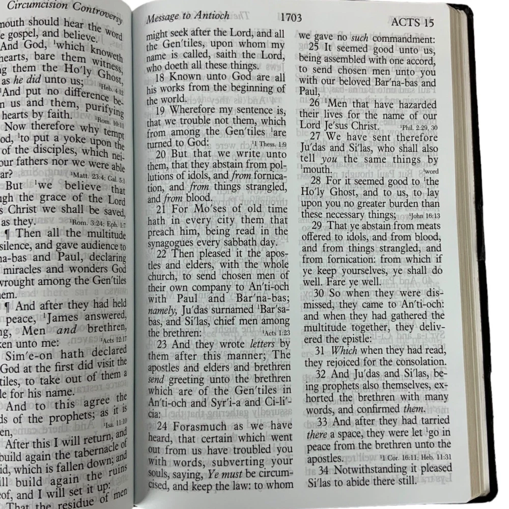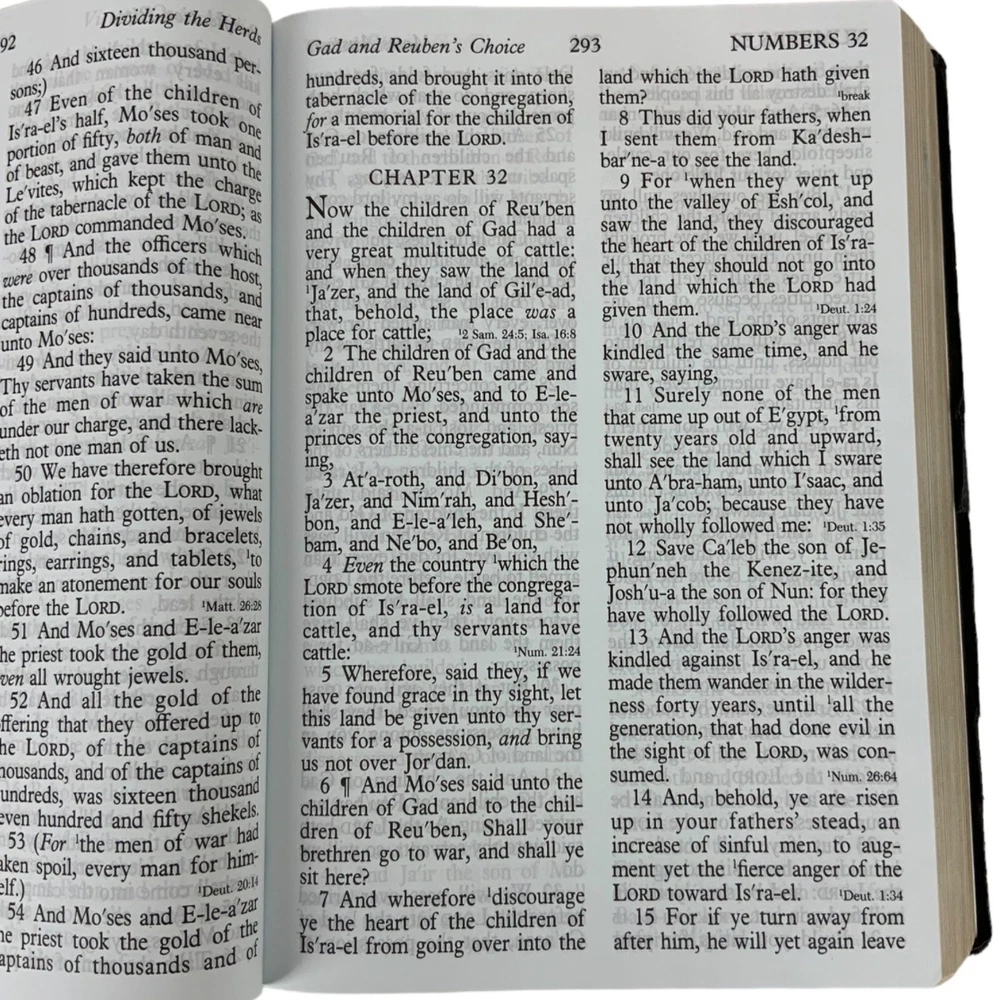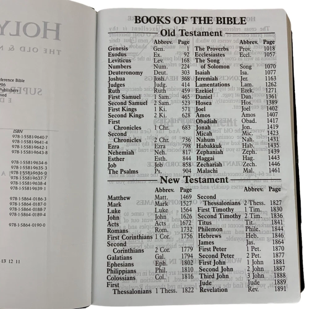 Vintage Holy Bible KJV Super Giant Print Reference Black Imitation Leather 1996 This Bible features a super giant print for easy reading and a durable imitation leather cover. Ideal for study and daily devotion. • Super Giant Print • Imitation Leather Cover • Black Color • Old & New Testaments • Reference Edition • Published by Broadman & Holman Acceptable pre-owned condition with shelf wear, creasing on the cover, and wear along edges. Pages are unmarked. Binding intact. Book pictured is actual copy you will receive.