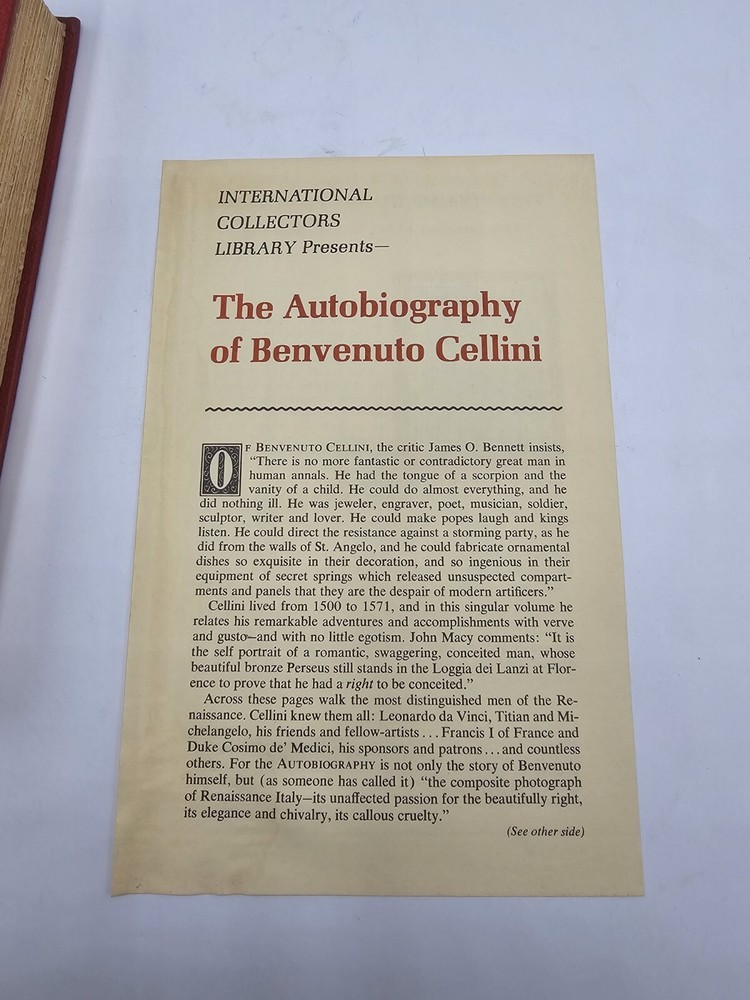 This vintage book from International Collectors Library is a must-have for any collector or lover of classic literature. Written by Benvenuto Cellini, this autobiography is a rare find in a collector's edition, 1st edition format. The leather binding adds to its durability and the English language makes it accessible to a wide audience. The book is not personalized and has not been signed, but it still holds a lot of value for its originality and subject matter. Modern Library has published this piece as part of their collection of classics, making it a great addition to any bookshelf. This book is perfect for anyone interested in literature and fiction, and it's sure to be a prized possession for years to come.