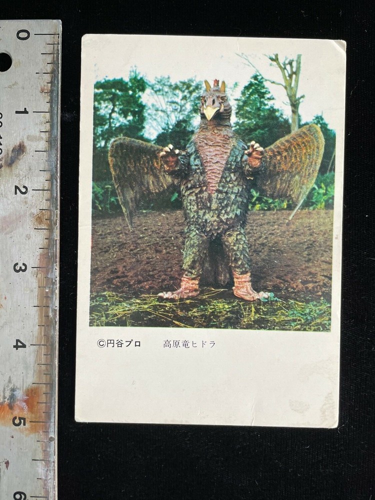 ITEM : Used vintage Japanese bromide yamakatsu card of the kaiju Hidora (Hydra) from the Ultraman tokusatsu TV series circa 1967. BACKGROUND : I purchased these myself one at a time as a young boy growing up in Tokyo in the late 1960s/early 70s. Bought most of them at the local mom & pop "10 yen store" in our neighborhood when I didn't have enough money to buy a kaiju sofubi. If memory serves me, they came in packs of a couple dozen or so and if you had enough cash you could buy the whole packet. As a 5 or 6 year old I usually only had enough cash on hand to buy one or two cards at a time (and perhaps some candy!). My friends and I used to collect and trade these. Brought these with me when we moved to the U.S. and they've been collecting dust for most of the past 50 years tucked away in drawers, closets, and moving boxes. Finally getting around to selling these on eBay. SHIPPING : Cards will be shipped securely with in a rigid 6 x 6 mailer via USPS. I will ship up to 5 cards in one mailer for combined shipping (no additional cost) if you purchase more than one at a time. Please request an invoice to before paying to take advantage of combined shipping if purchasing more than one at a time. Thanks for looking!
