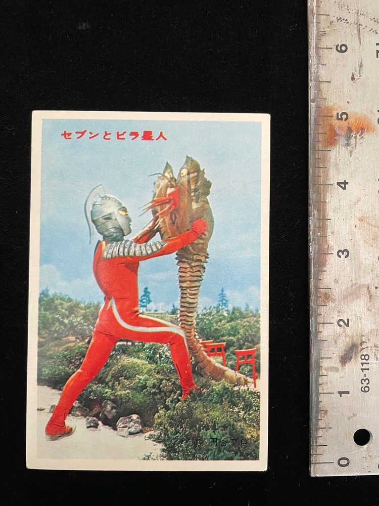 ITEM : Used vintage Japanese bromide yamakatsu card of Ultraseven battling the alien Bira from the tokusatsu TV show circa 1968. The card measures roughly 3.5 x 5 inches. BACKGROUND : I purchased these myself one at a time as a young boy growing up in Tokyo in the late 1960s. Bought most of them at the local mom & pop "10 yen store" in our neighborhood when I didn't have enough money to buy a kaiju sofubi. If memory serves me, they came in packs of a couple dozen or so and if you had enough cash you could buy the whole packet. As a 5 or 6 year old I usually only had enough cash on hand to buy one or two cards at a time (and perhaps some candy!). My friends and I used to collect and trade these. Brought these with me when we moved to the U.S. and they've been collecting dust for most of the past 50 years tucked away in drawers, closets, and moving boxes. Finally getting around to selling these on eBay. SHIPPING : Cards will be shipped securely with in a rigid 6 x 6 mailer via USPS. I will ship up to 5 cards in one mailer for combined shipping (no additional cost) if you purchase more than one at a time. Please request an invoice to before paying to take advantage of combined shipping if purchasing more than one at a time. Thanks for looking!