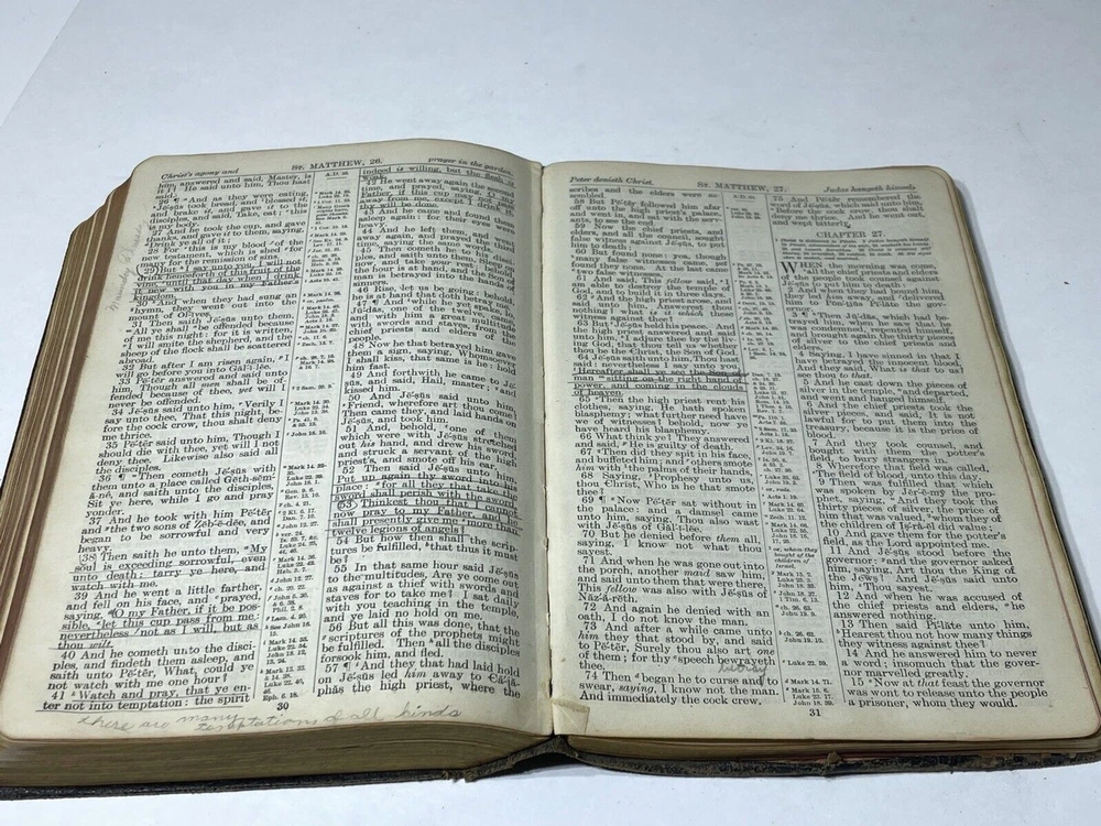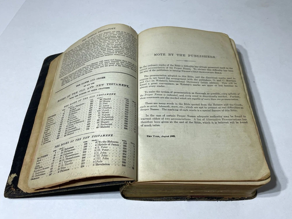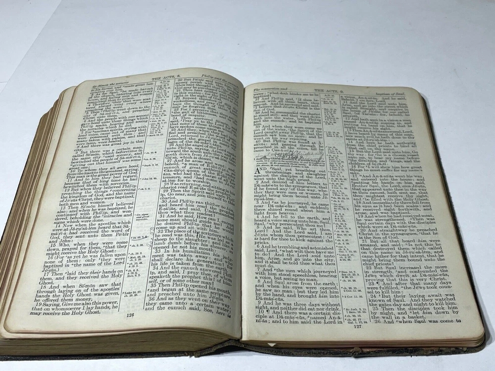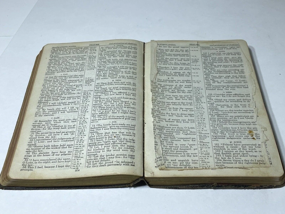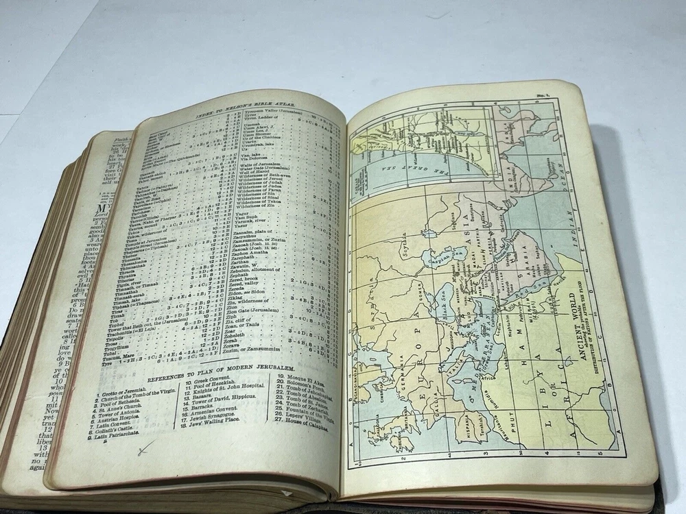 Please review all photos .. (if) any flaws will be photographed. I try to take from all angles to give you the best description of the item. Thanks for looking and please ask any question before purchasing One page is loose from Bible **Color shades/brightness pictured may vary based on the device you are viewing photo images on as well as when item is under different lighting.
