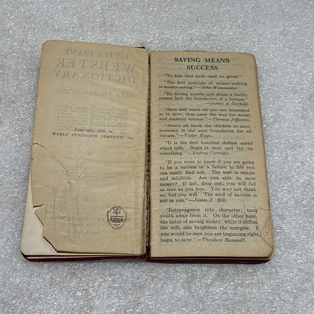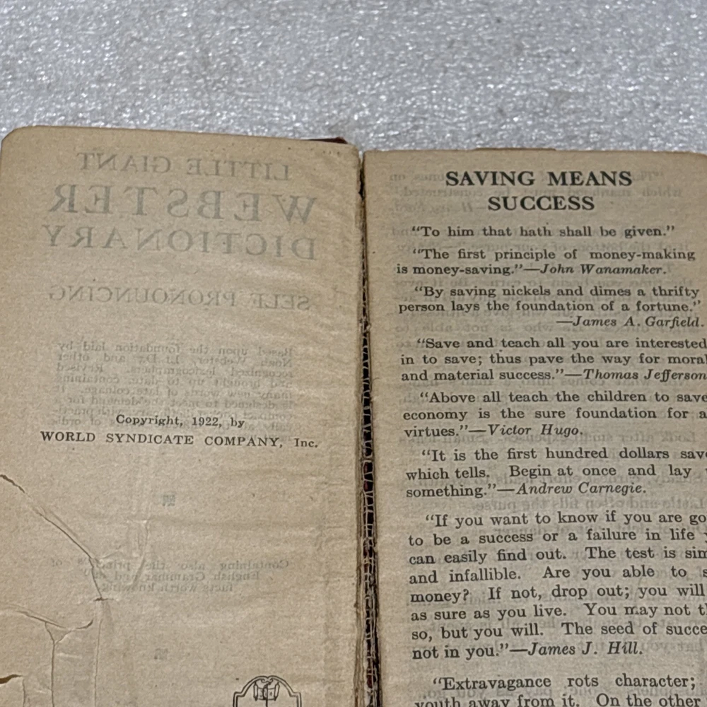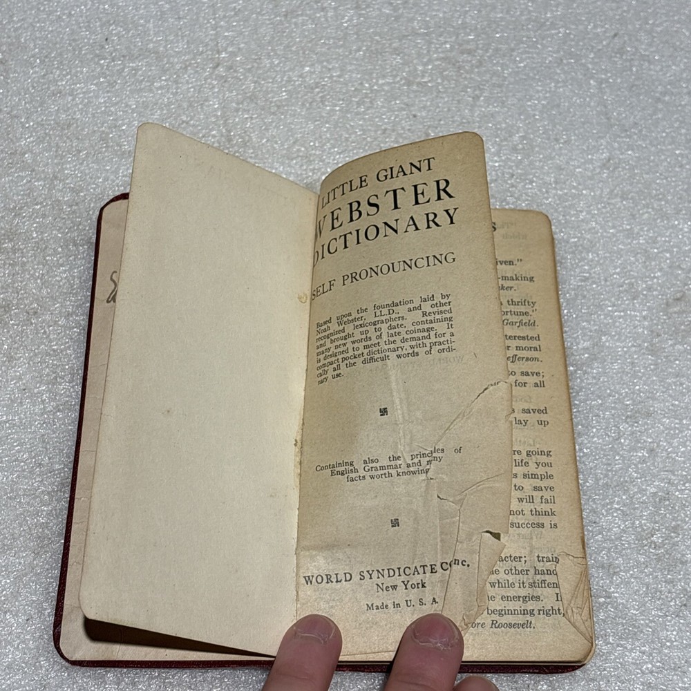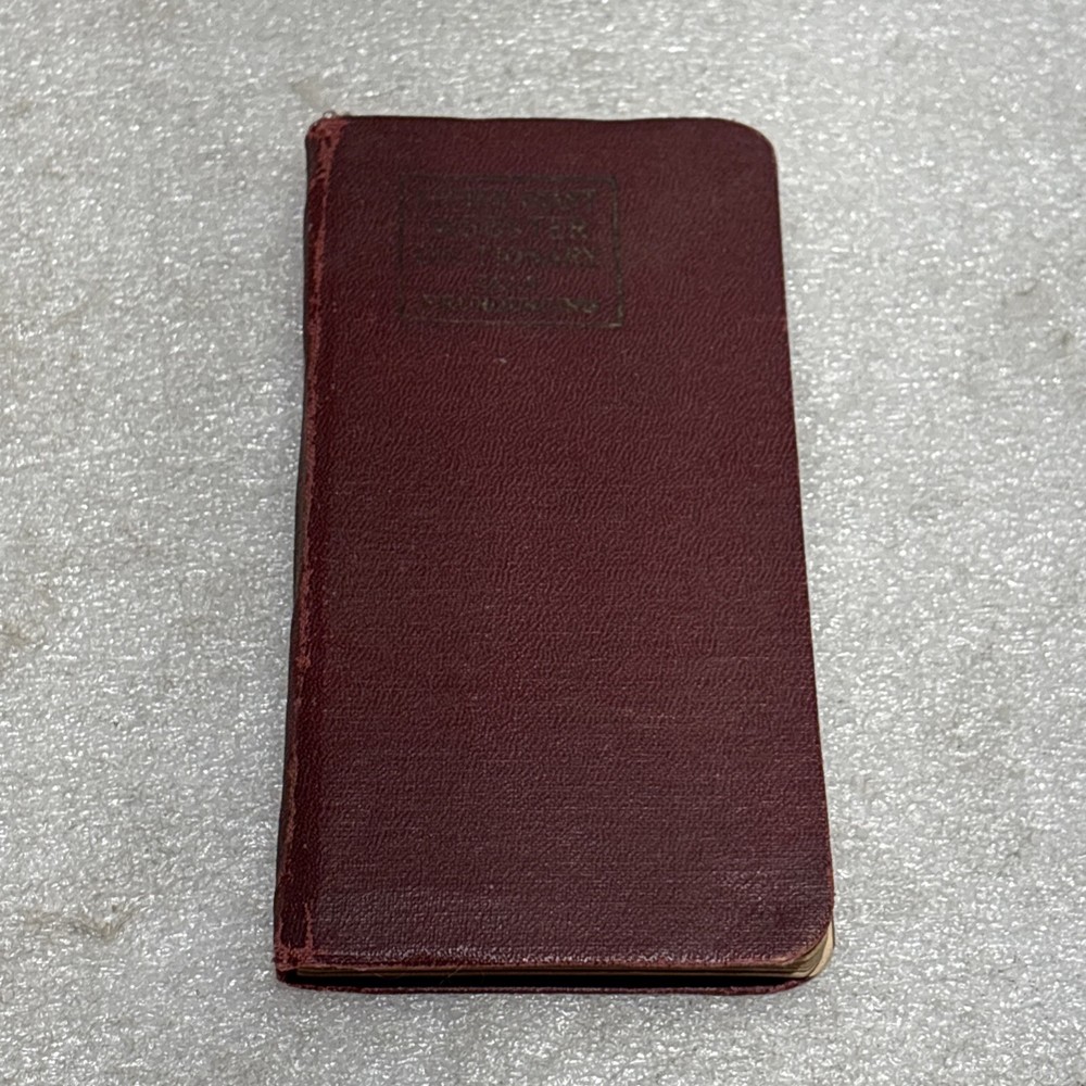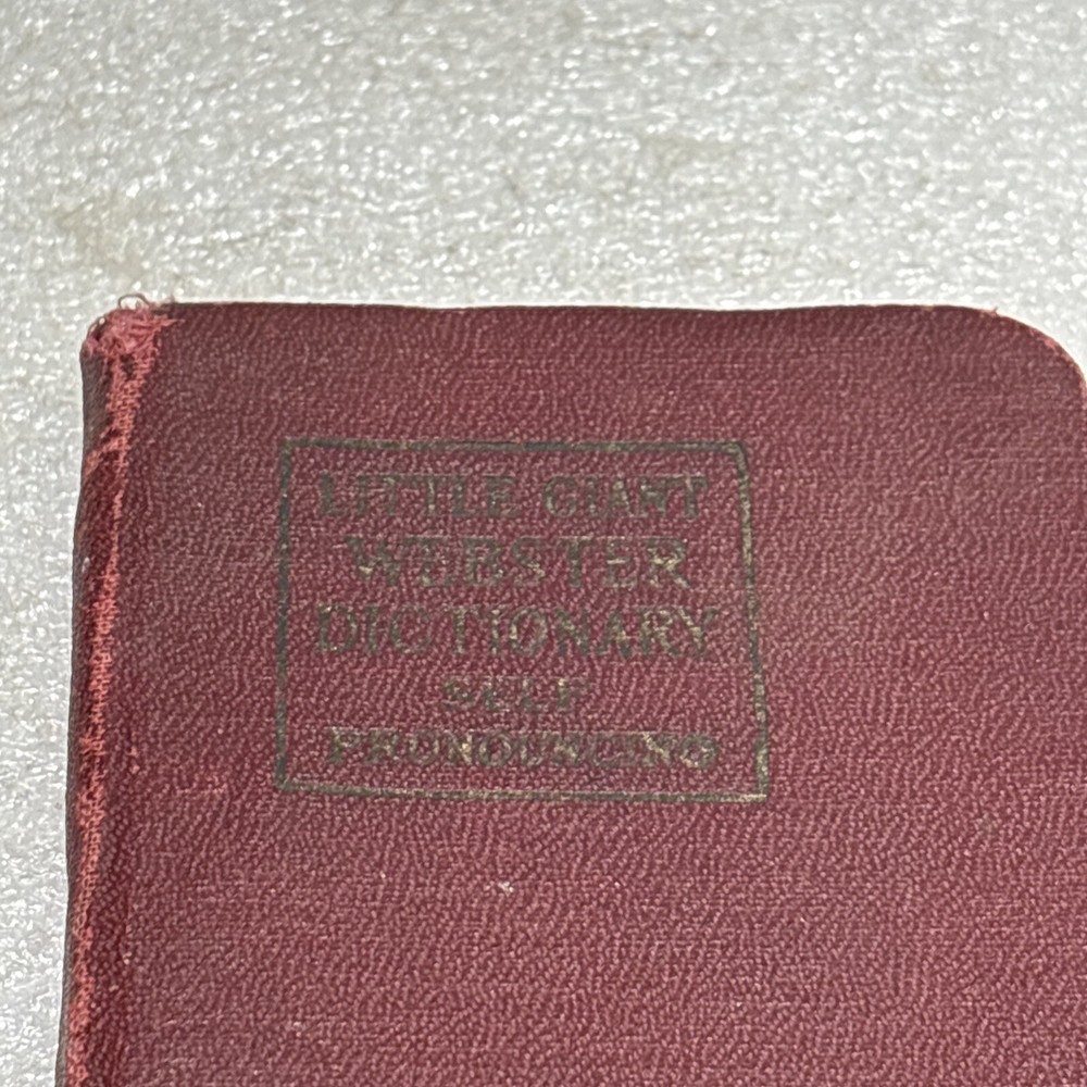 The product is a vintage Little Giant Webster Dictionary from 1922, designed as a self-pronouncing pocket-sized edition. It features a leather binding and is written in English, making it a unique and collectible piece for those interested in dictionaries and thesauri from North America. This original edition would be a valuable reference tool for language enthusiasts or individuals seeking a historical perspective on language usage from the early 20th century. Bin: A